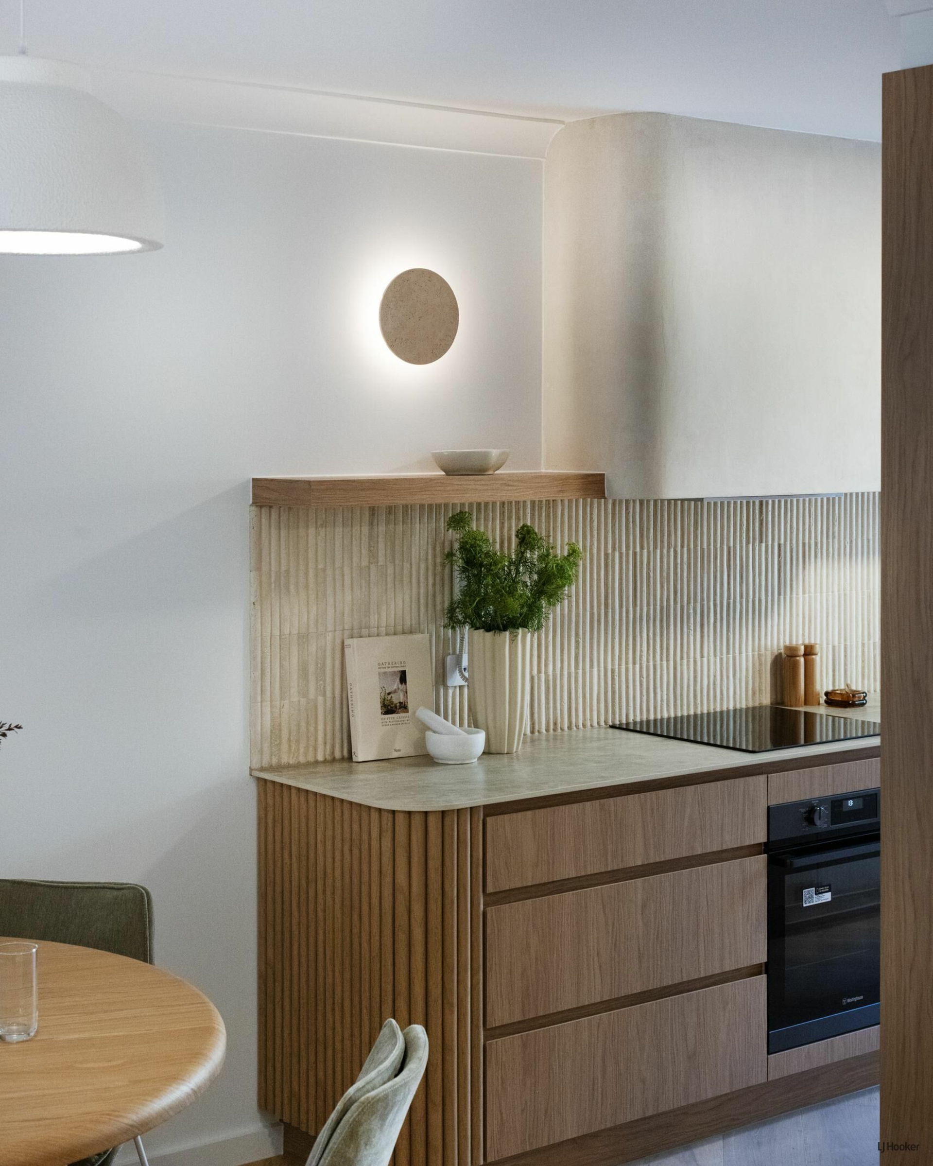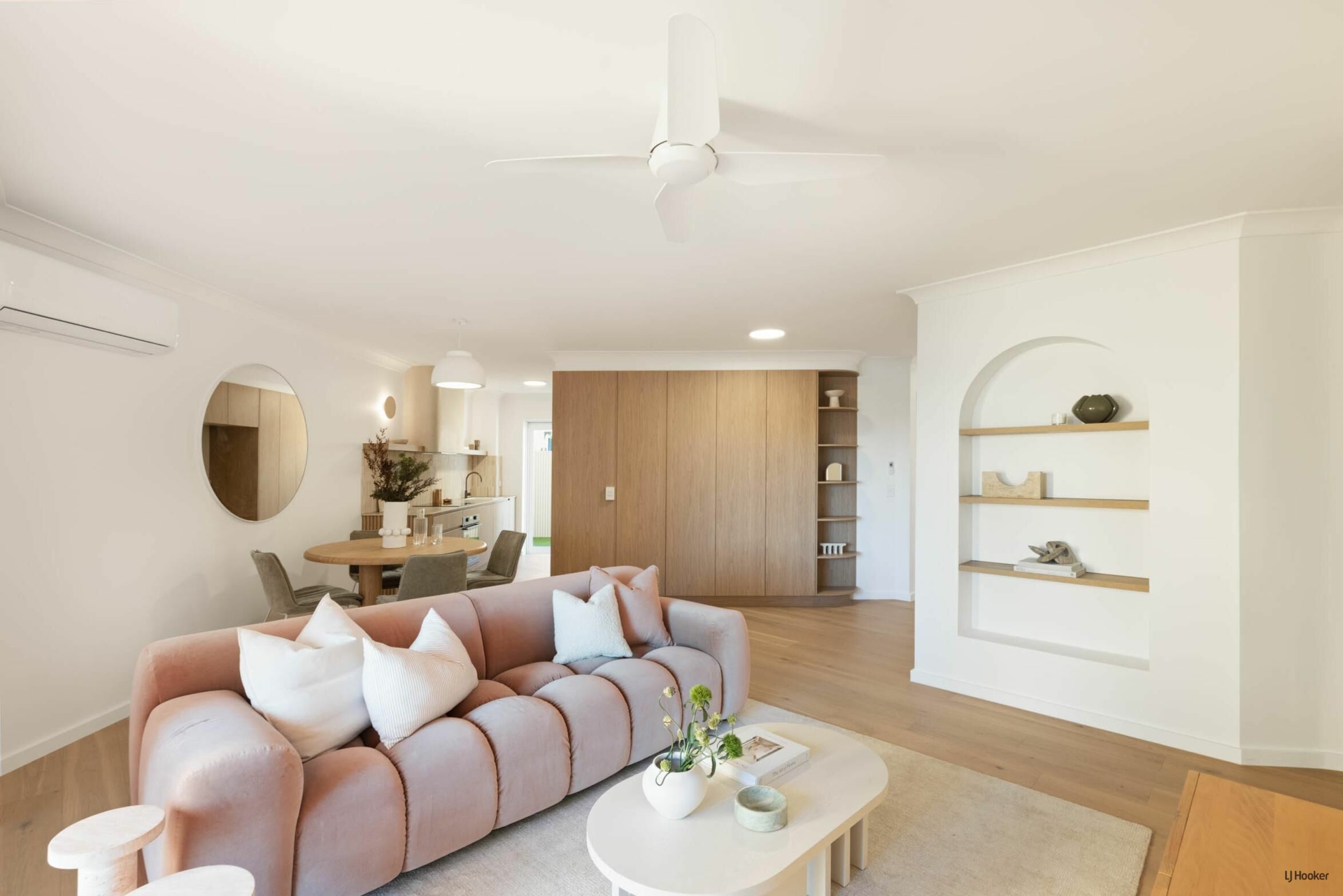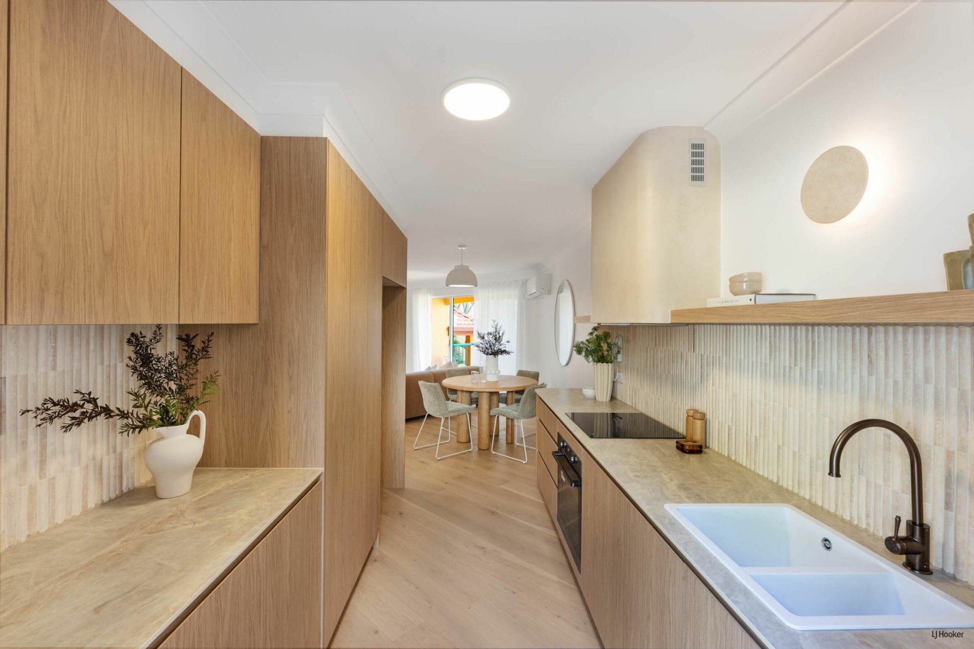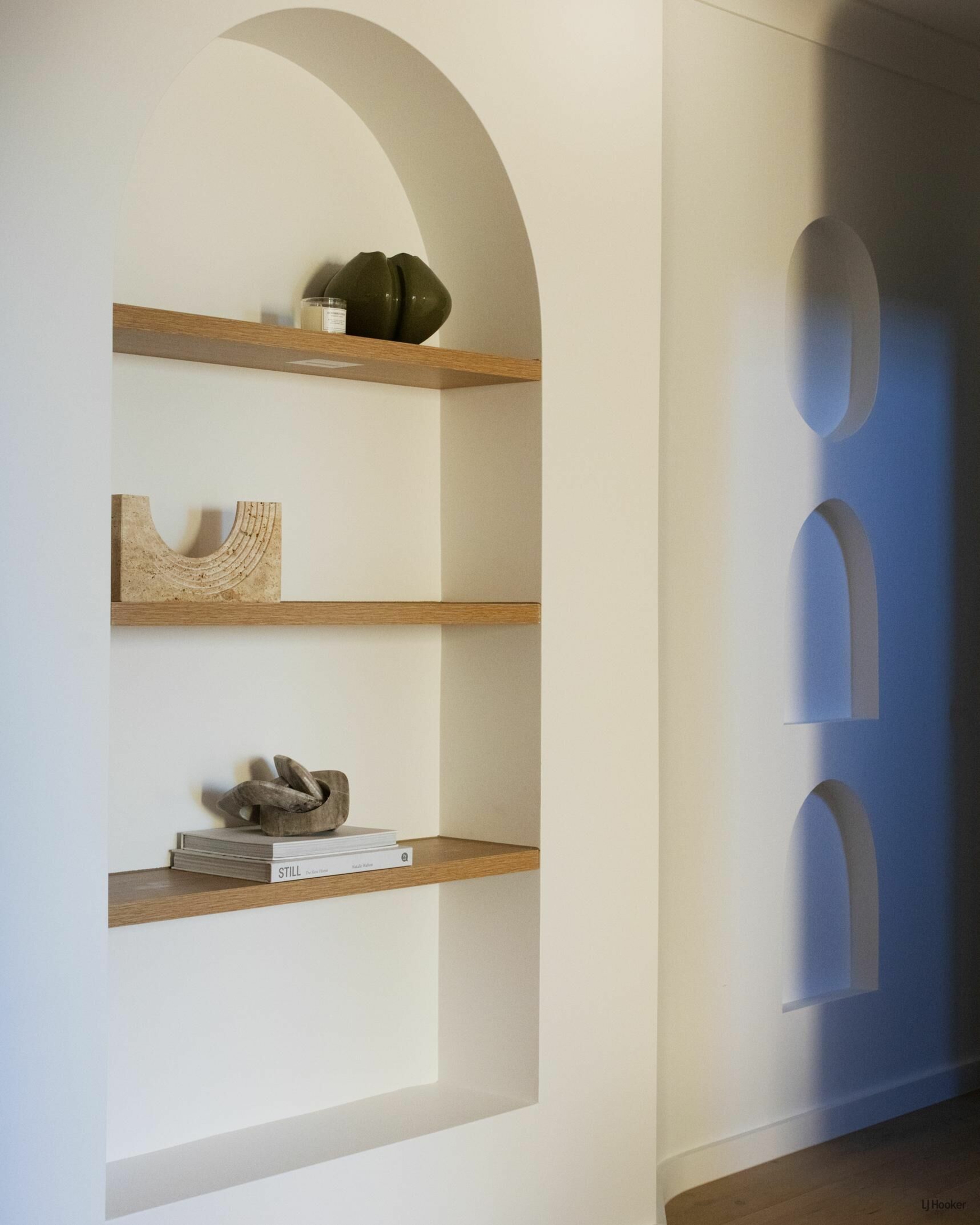 Step inside and you'll find engineered oak floors flowing through a bright, open-plan layout where the lounge connects effortlessly to the dining space. Custom Boston oak cabinetry, arched shelving, and bespoke lighting elevate the 'Modern-terranean' tonality throughout.