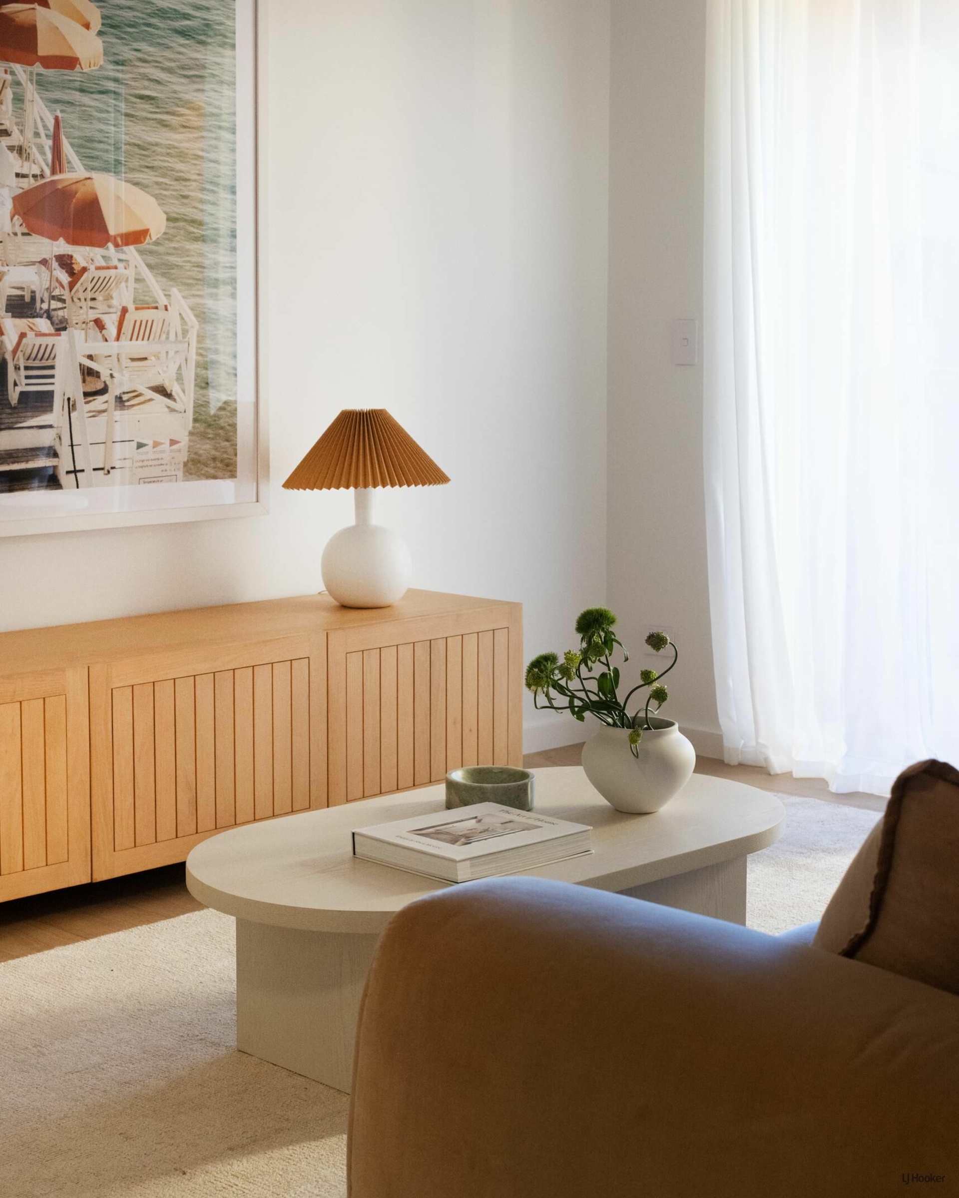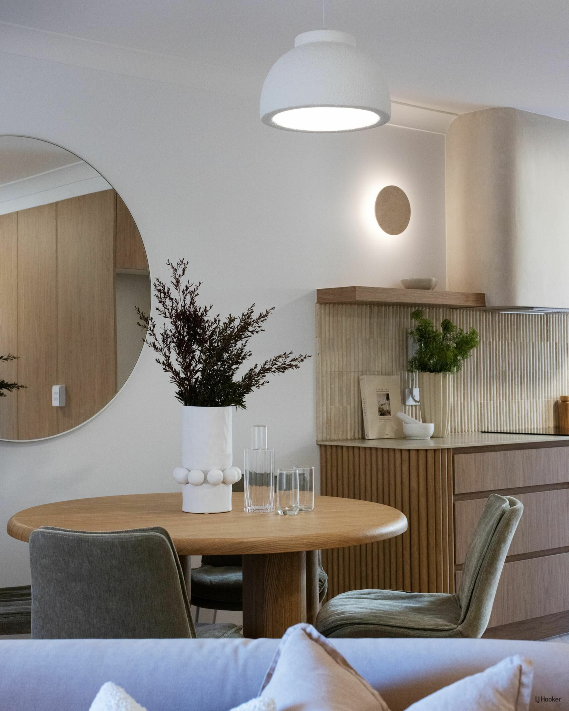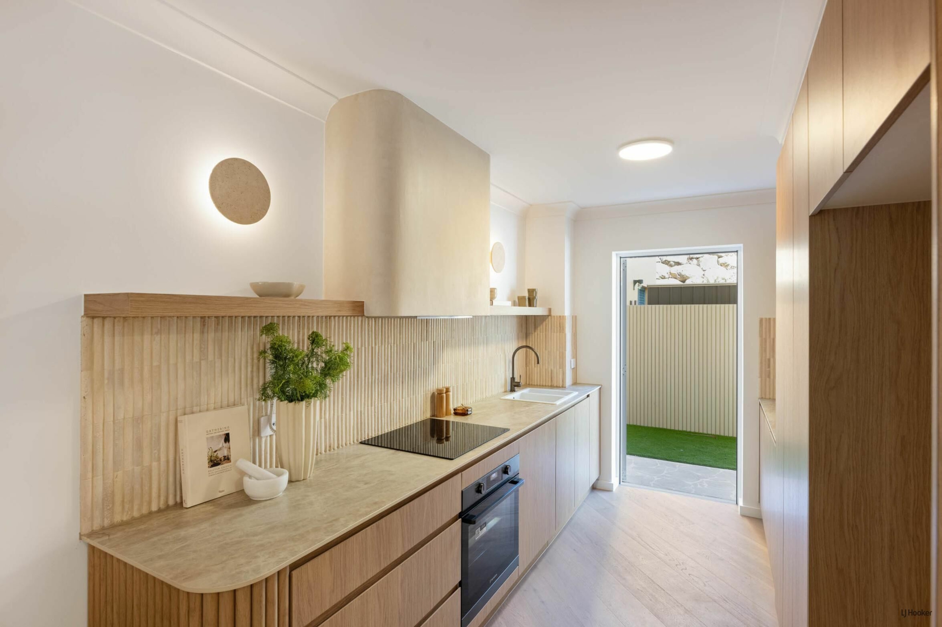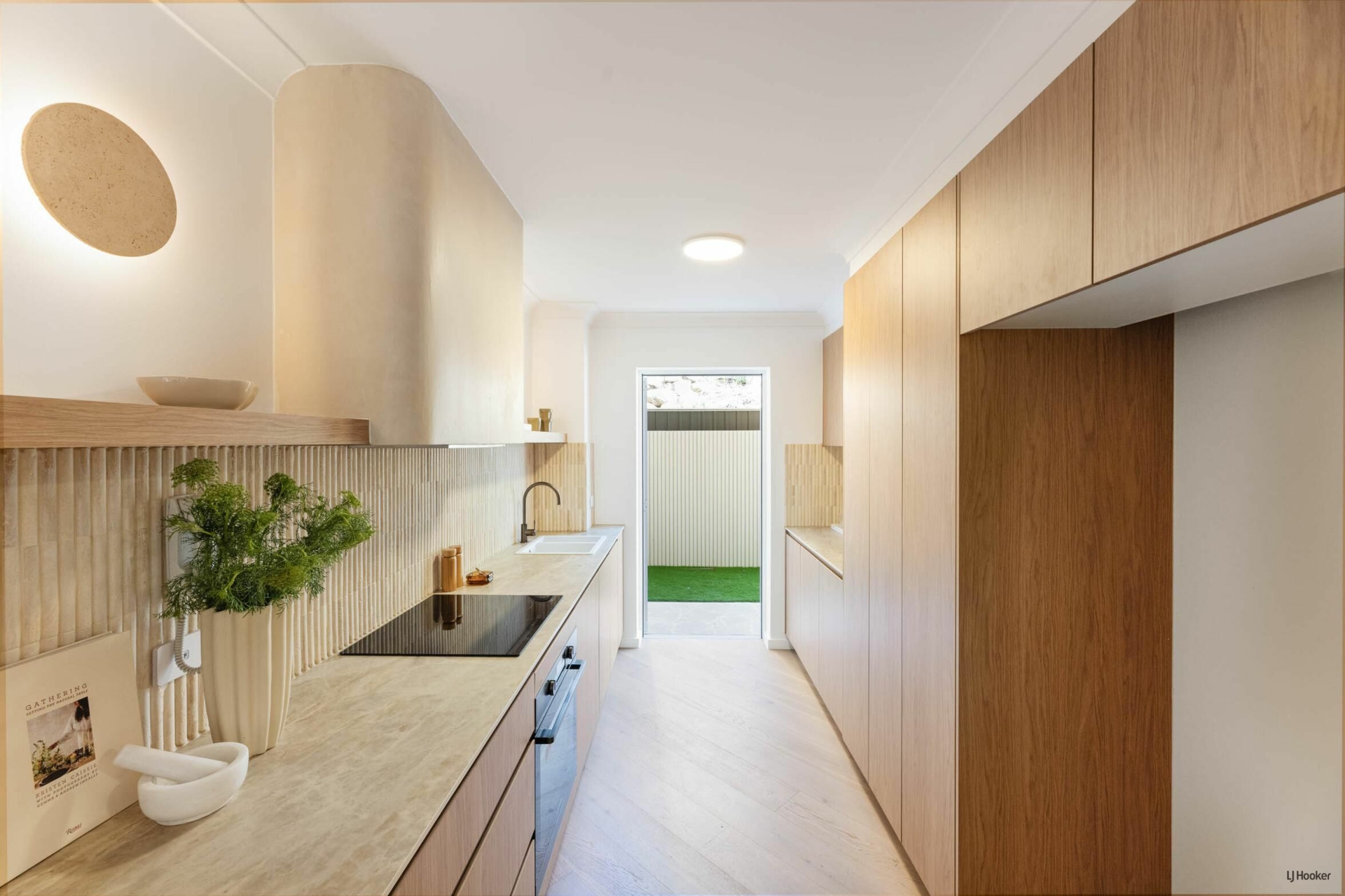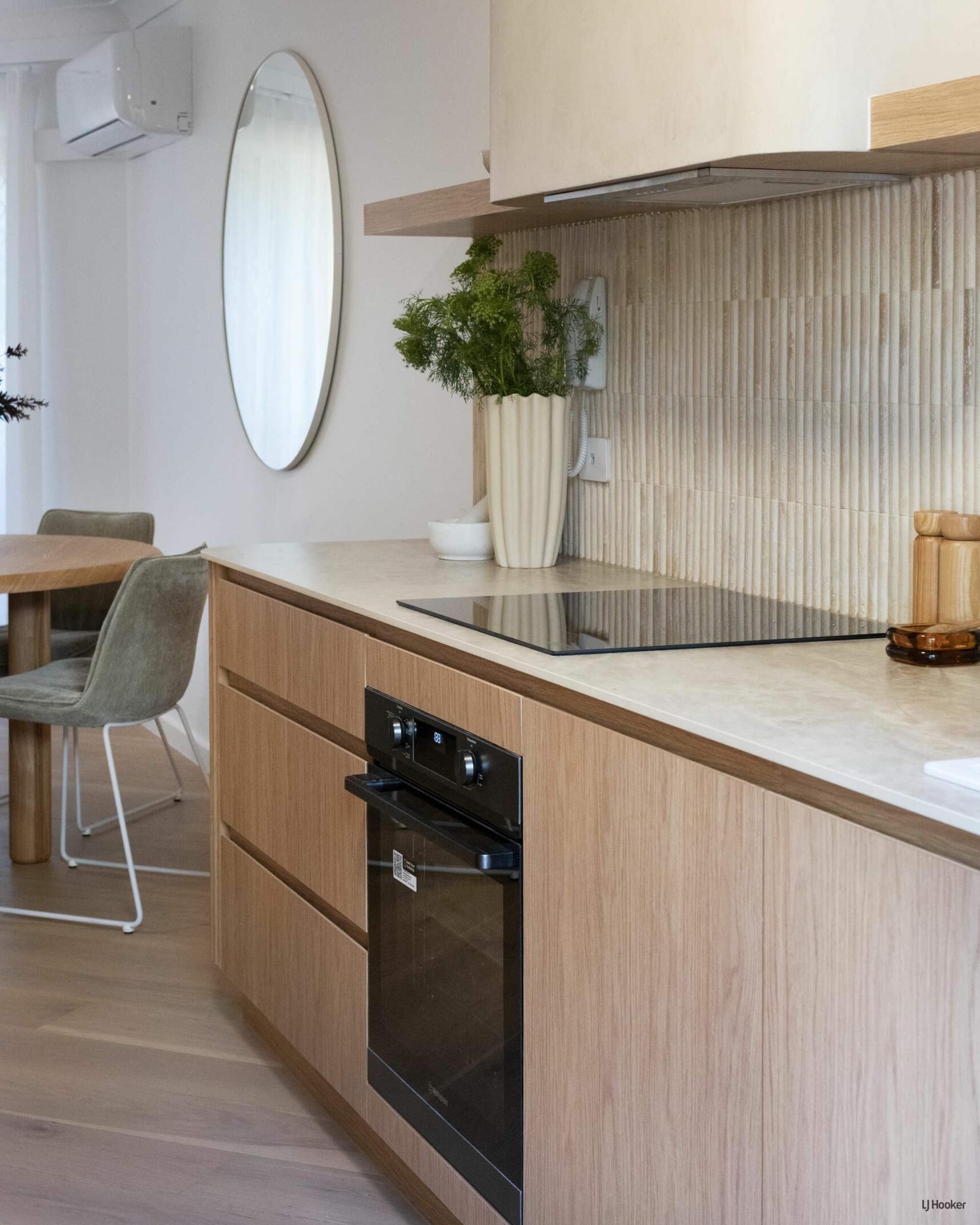 Step inside and you'll find engineered oak floors flowing through a bright, open-plan layout where the lounge connects effortlessly to the dining space. Custom Boston oak cabinetry, arched shelving, and bespoke lighting elevate the 'Modern-terranean' tonality throughout.
