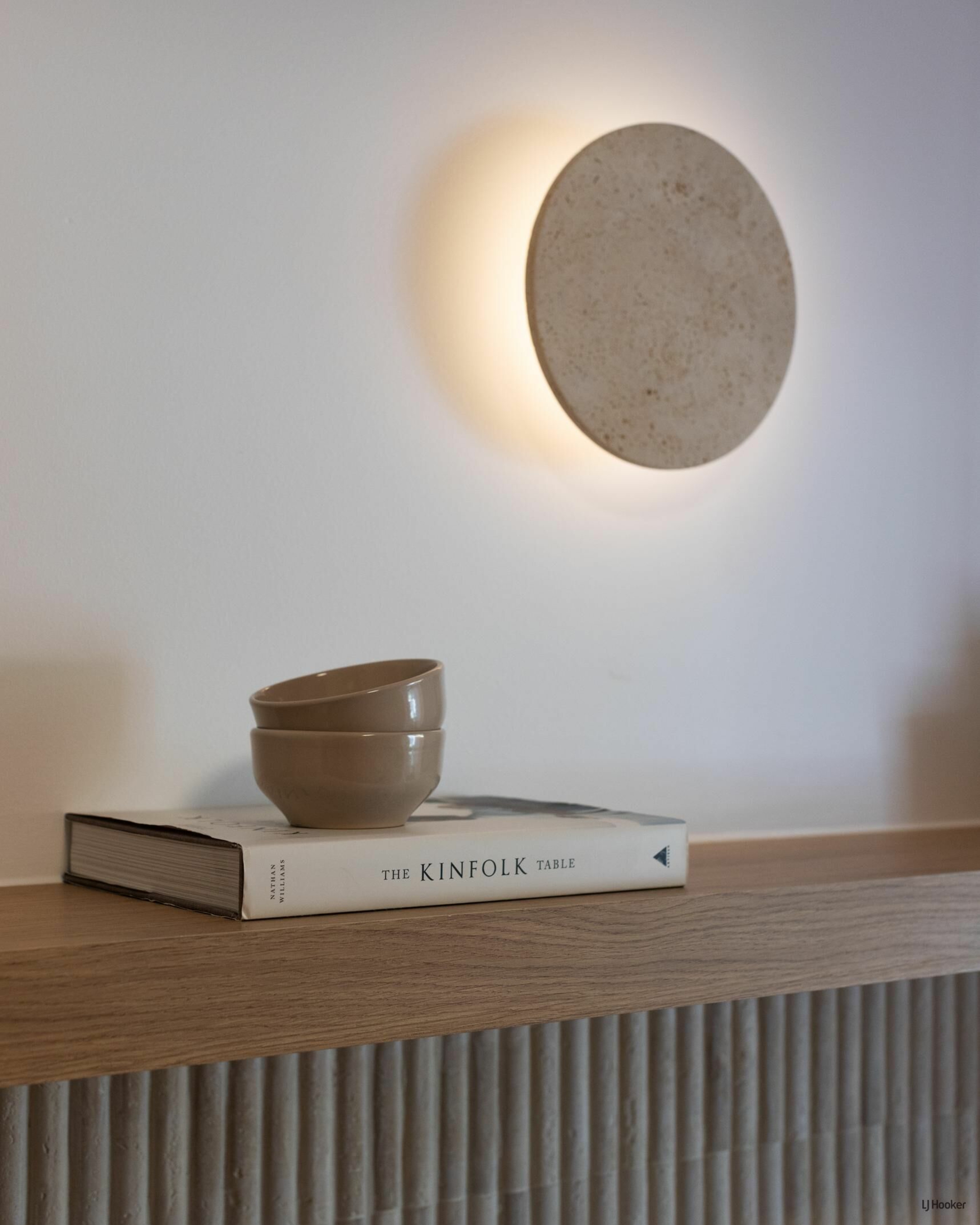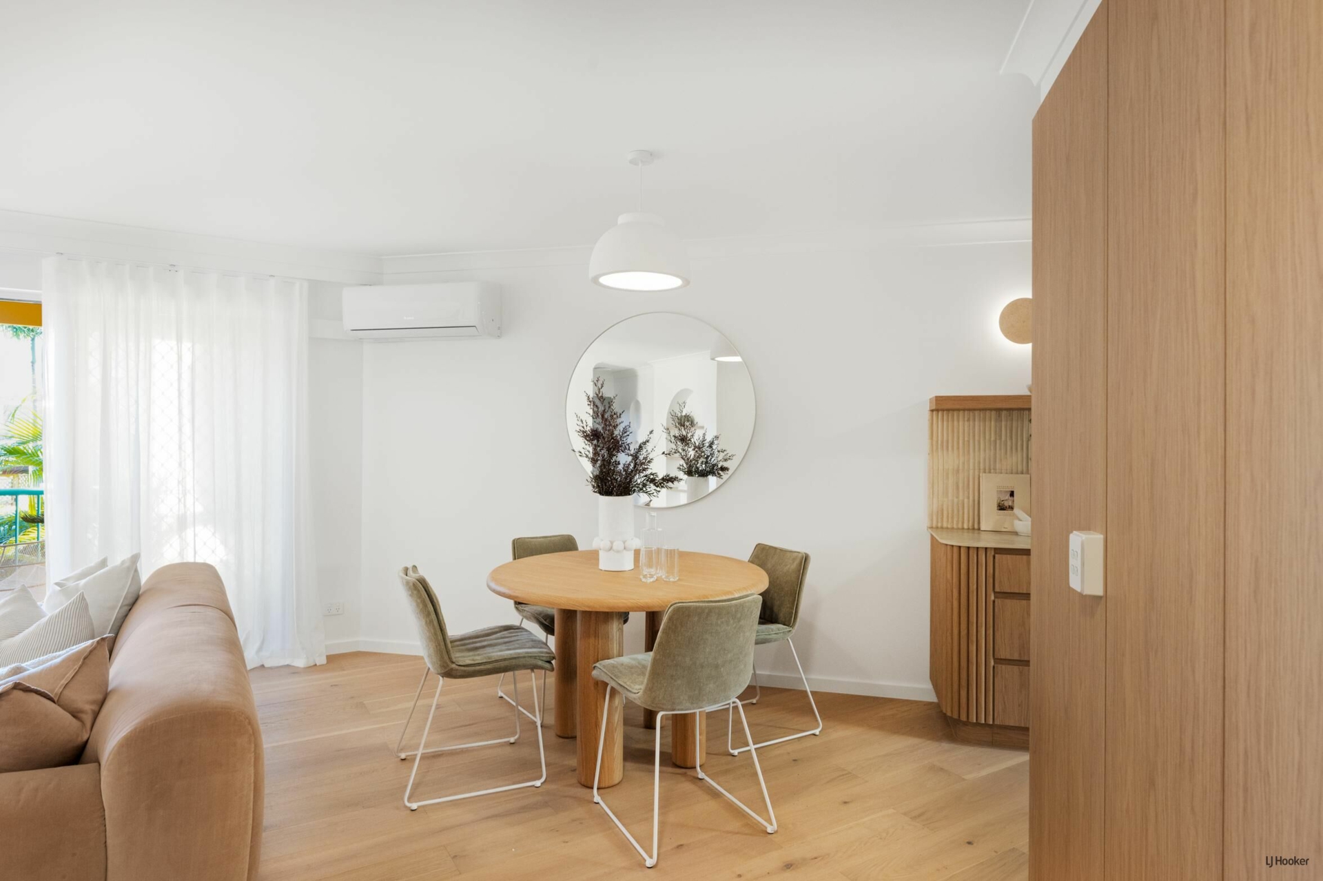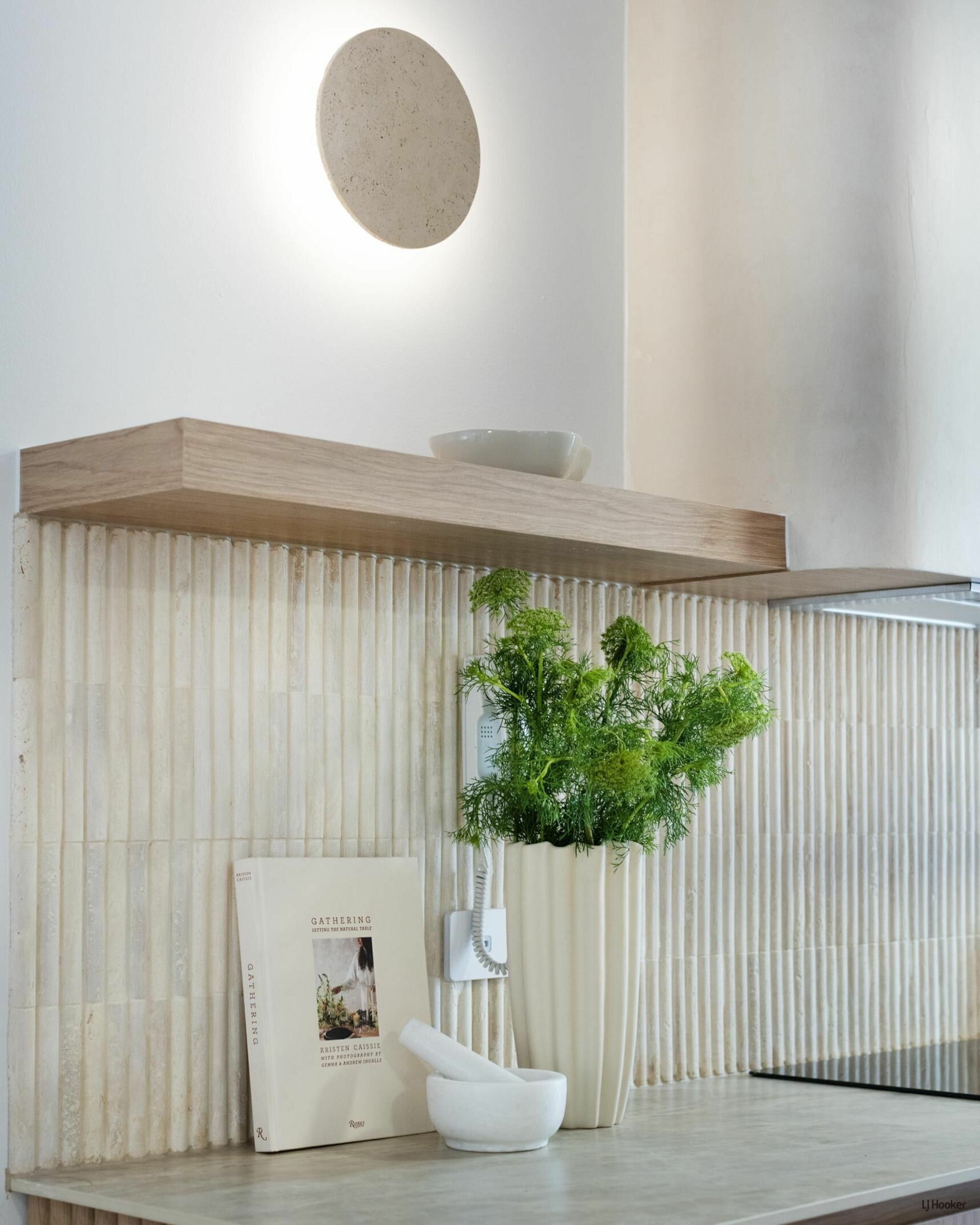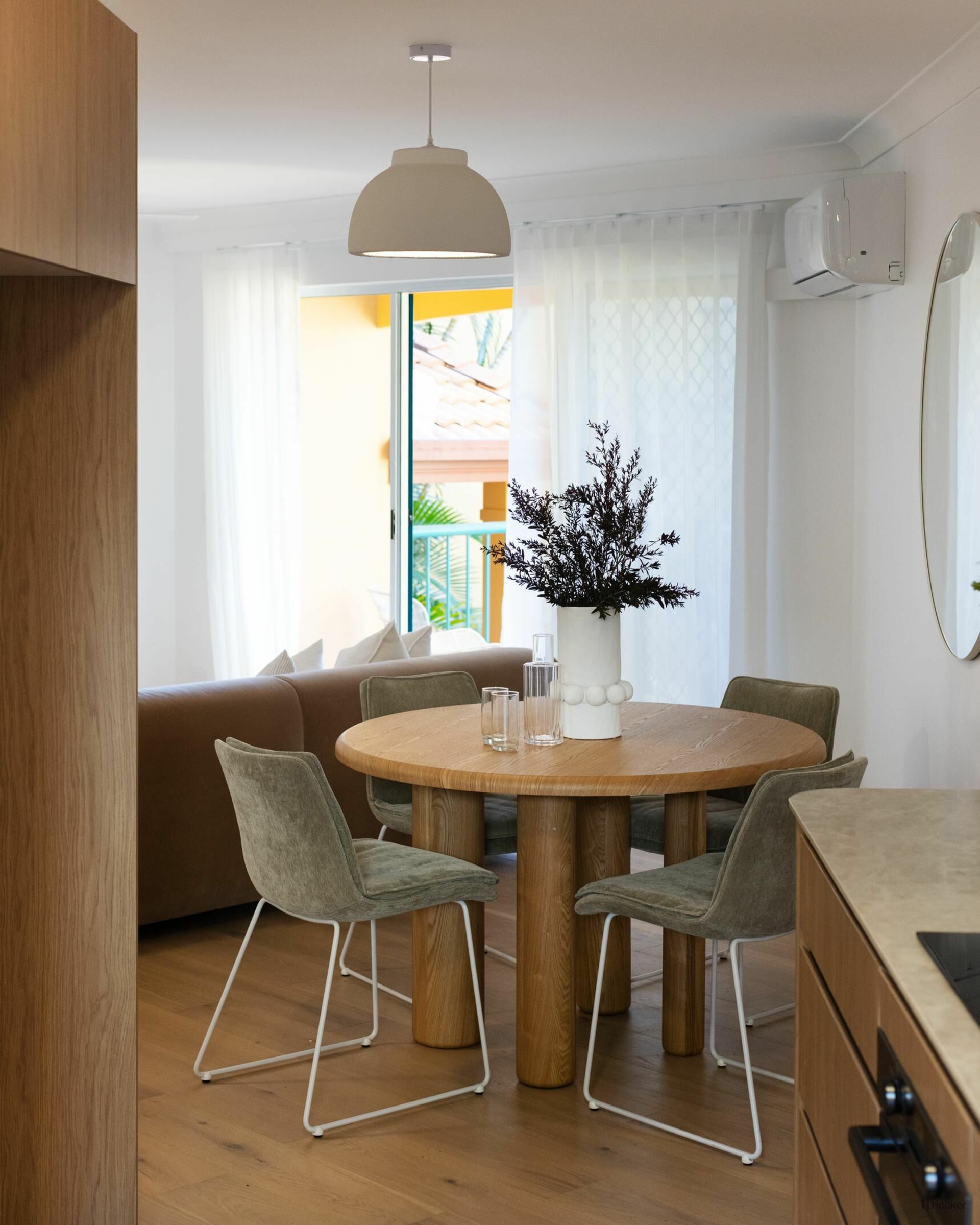Step inside and you'll find engineered oak floors flowing through a bright, open-plan layout where the lounge connects effortlessly to the dining space. Custom Boston oak cabinetry, arched shelving, and bespoke lighting elevate the 'Modern-terranean' tonality throughout.