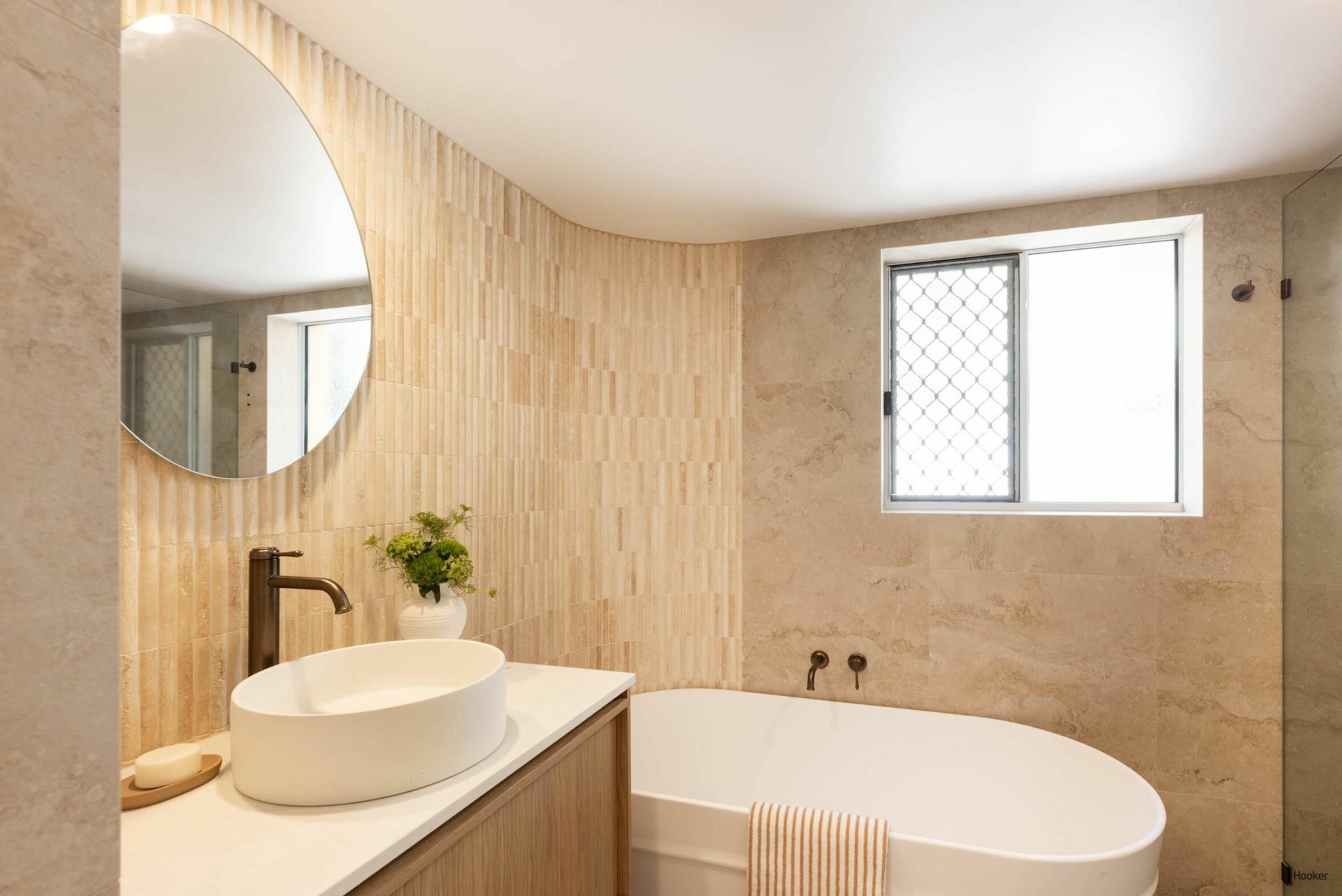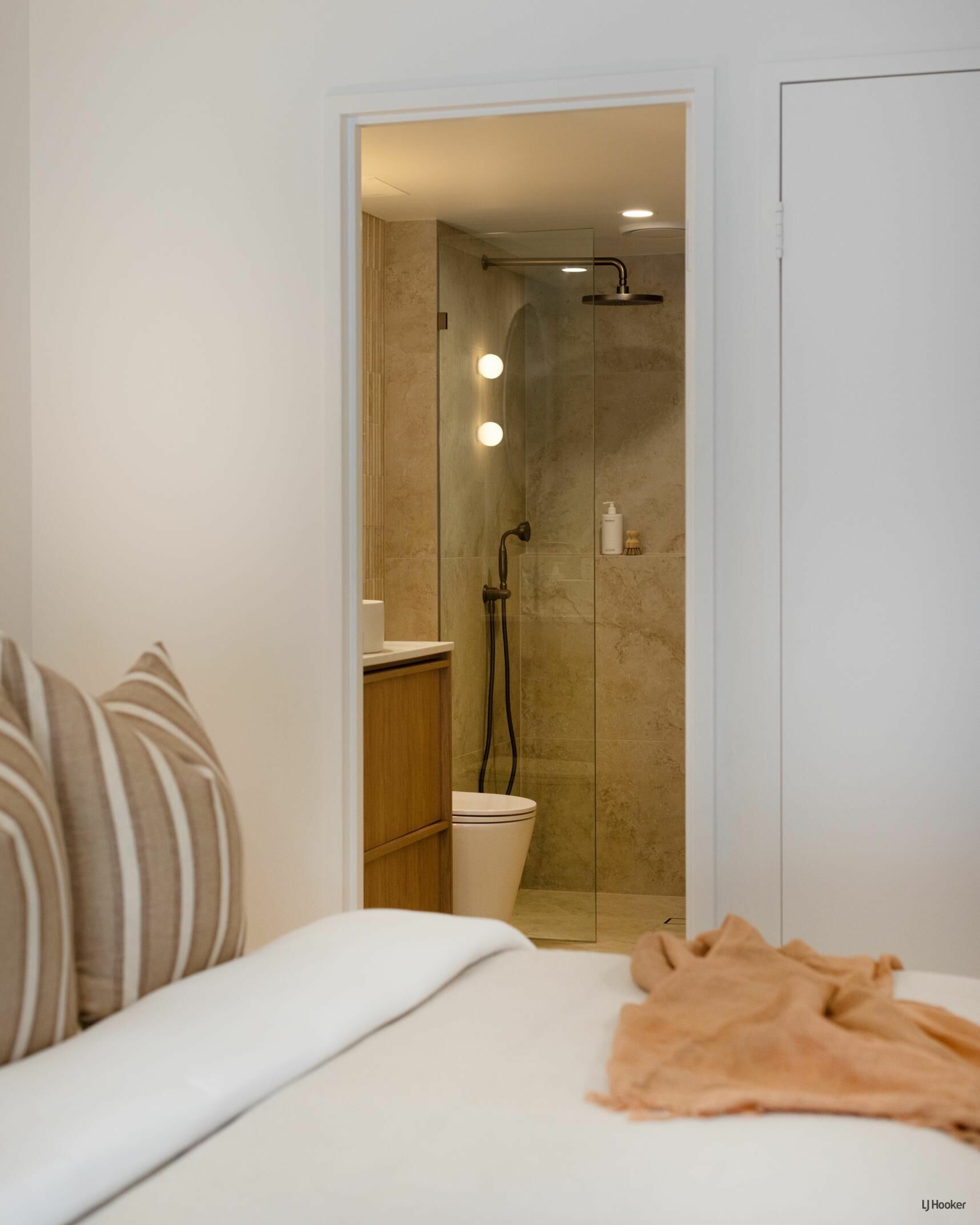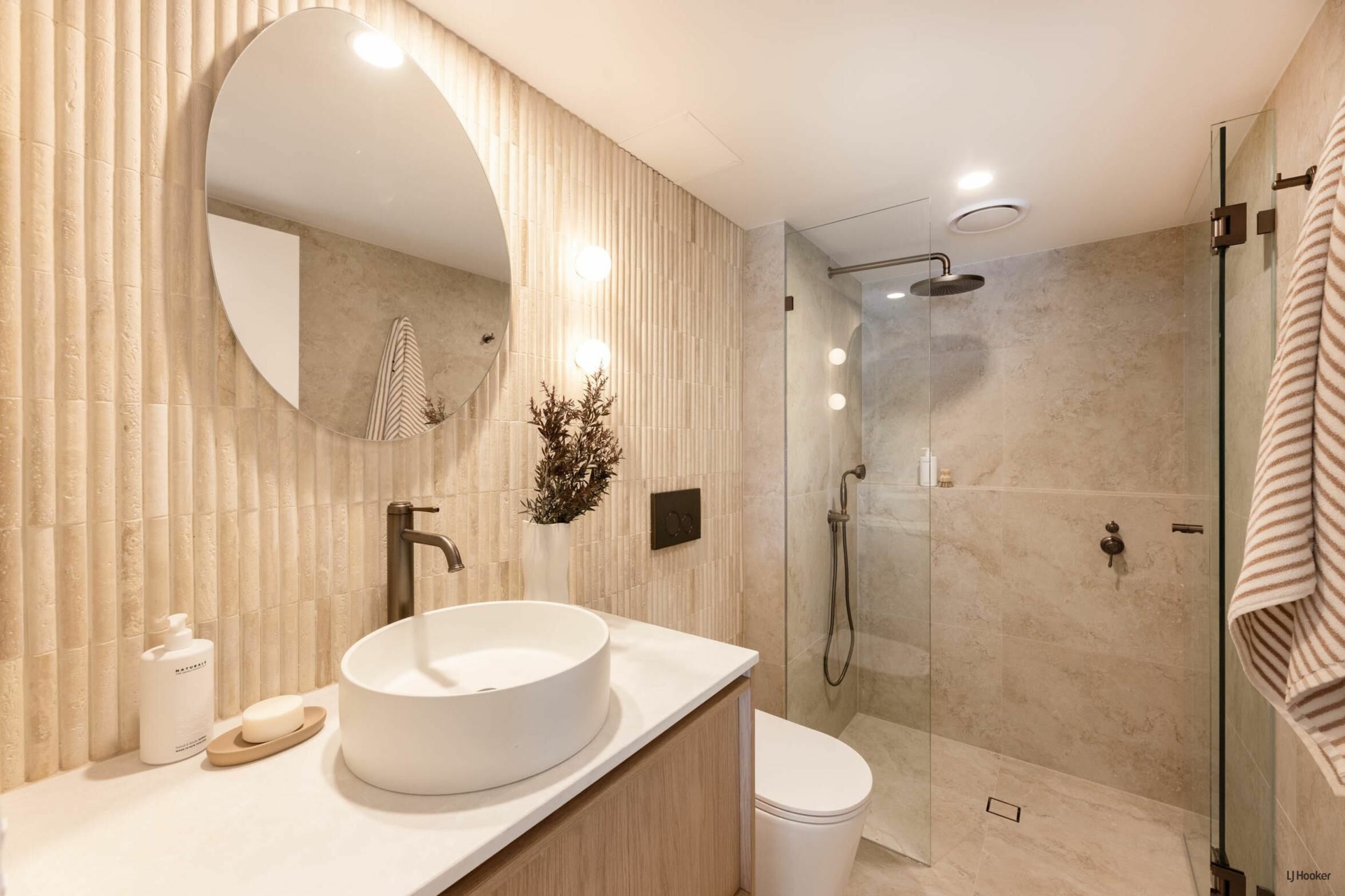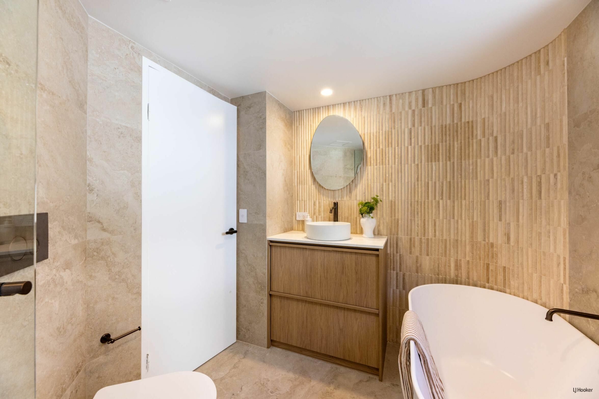 The main bathroom is a tranquil, spa-like retreat featuring floor-to-ceiling travertine-look tiles, an expansive shower zone, stone finger mosaics, a freestanding bath, and earthed dusk bronze fixtures to compliment the high design aesthetic. The same high-end style is mirrored in the master ensuite, with elegant sensor mirrors and the continued luxurious materials, creating a calming palette for a peaceful and luxurious escape.