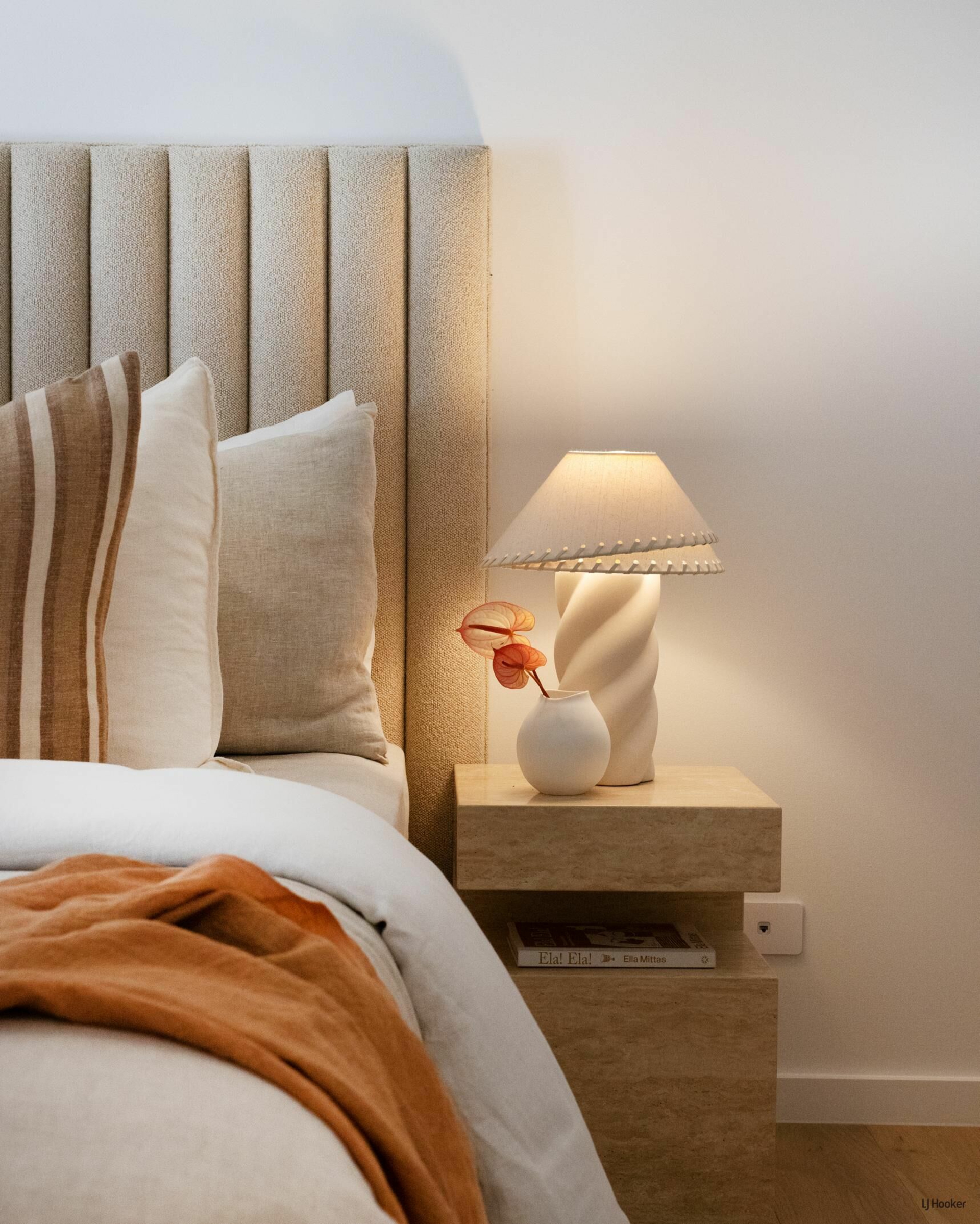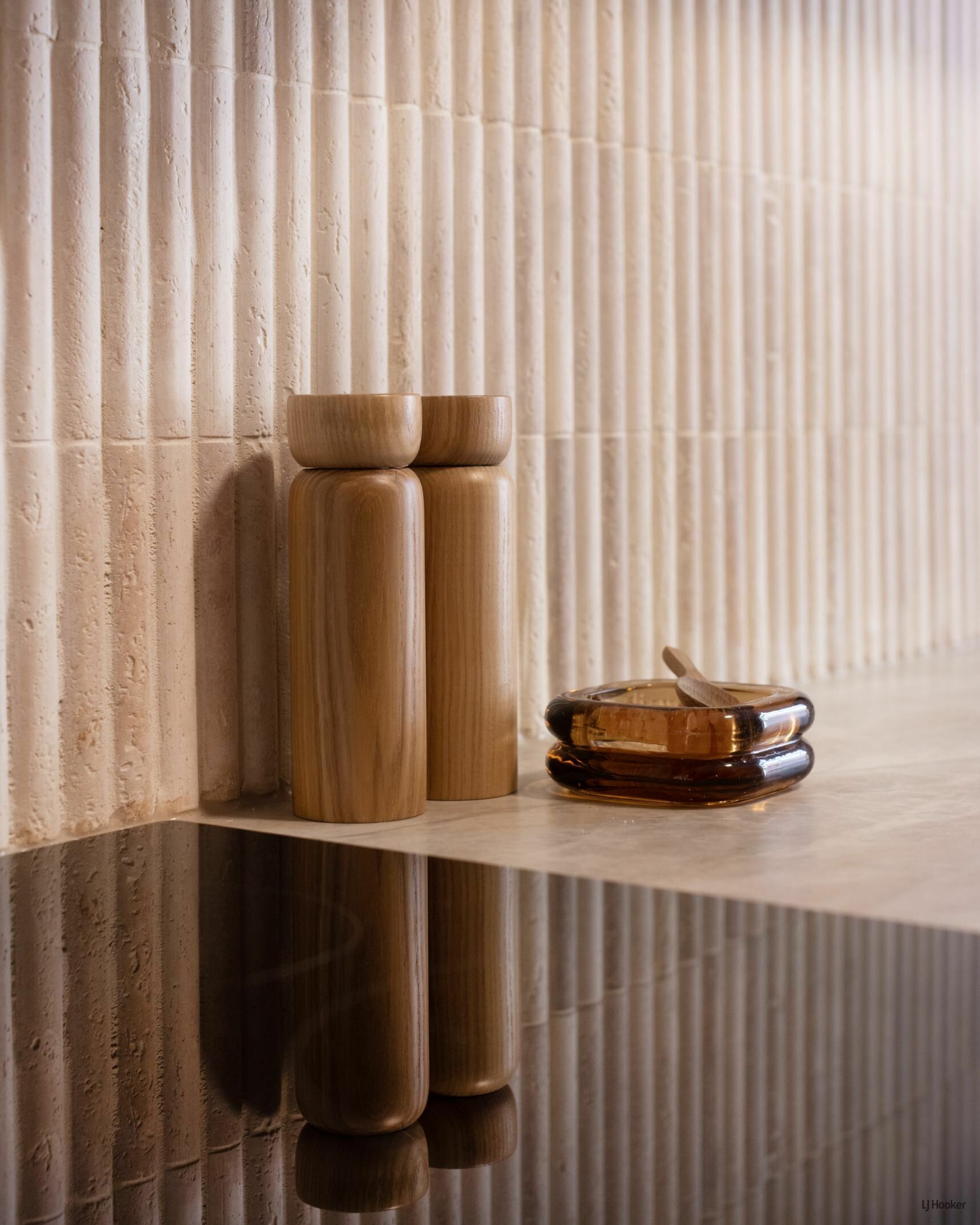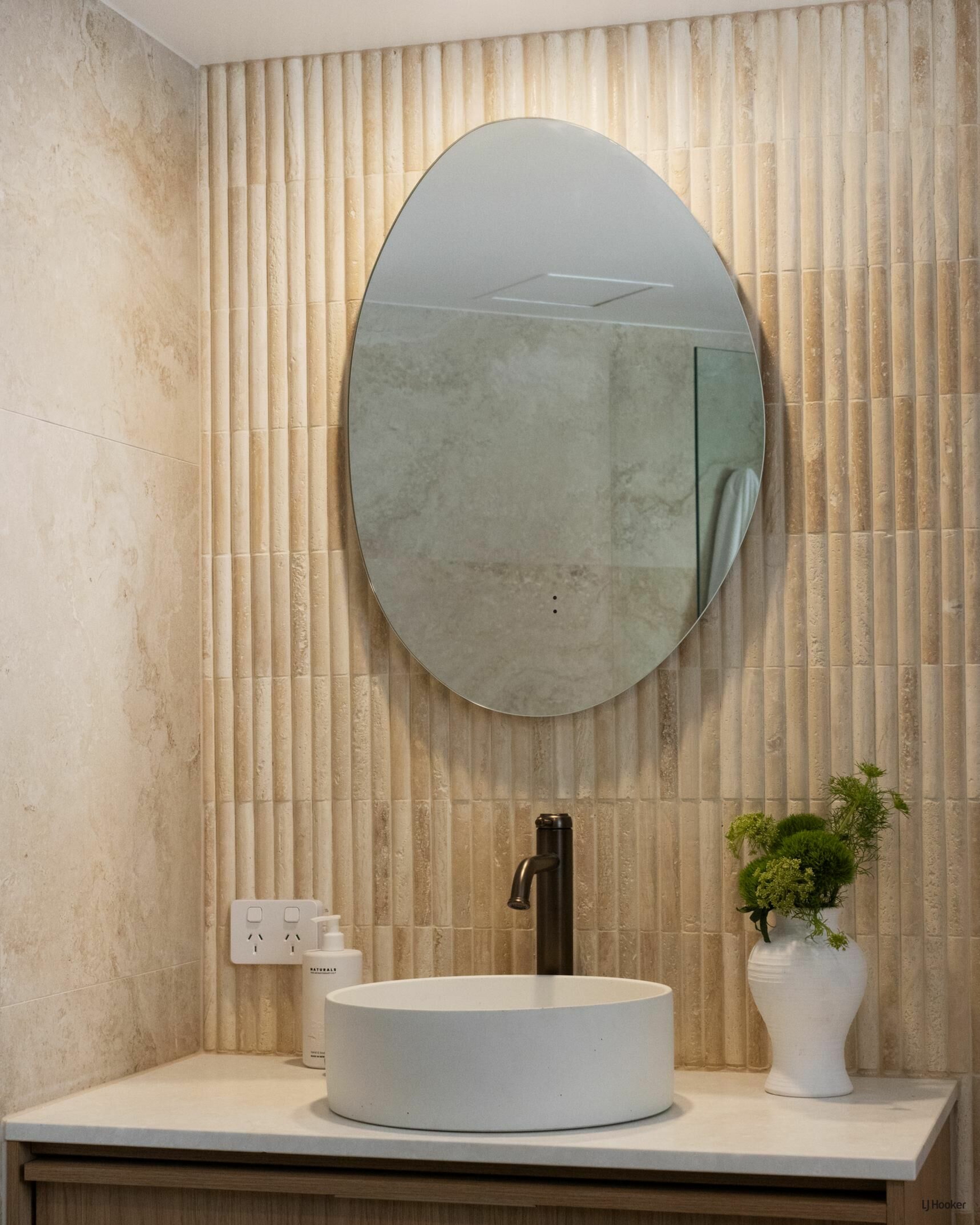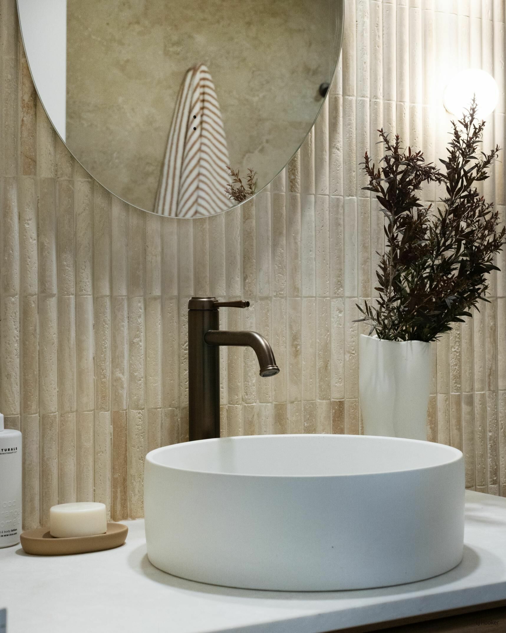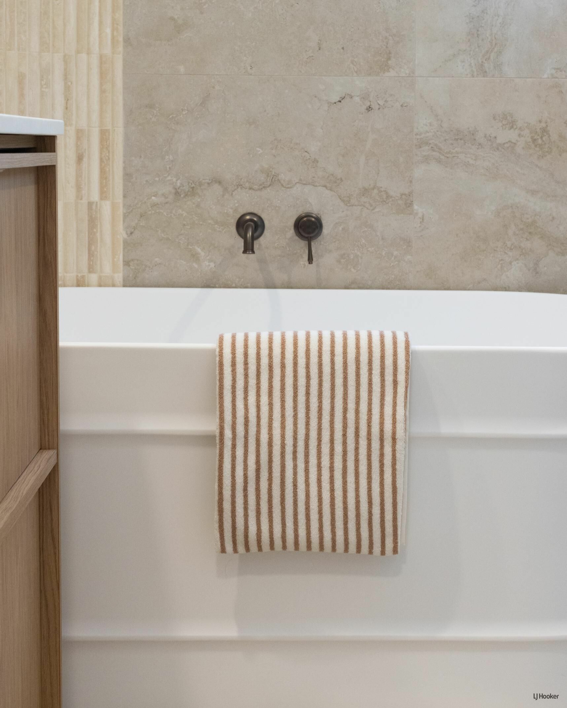 The main bathroom is a tranquil, spa-like retreat featuring floor-to-ceiling travertine-look tiles, an expansive shower zone, stone finger mosaics, a freestanding bath, and earthed dusk bronze fixtures to compliment the high design aesthetic. The same high-end style is mirrored in the master ensuite, with elegant sensor mirrors and the continued luxurious materials, creating a calming palette for a peaceful and luxurious escape.