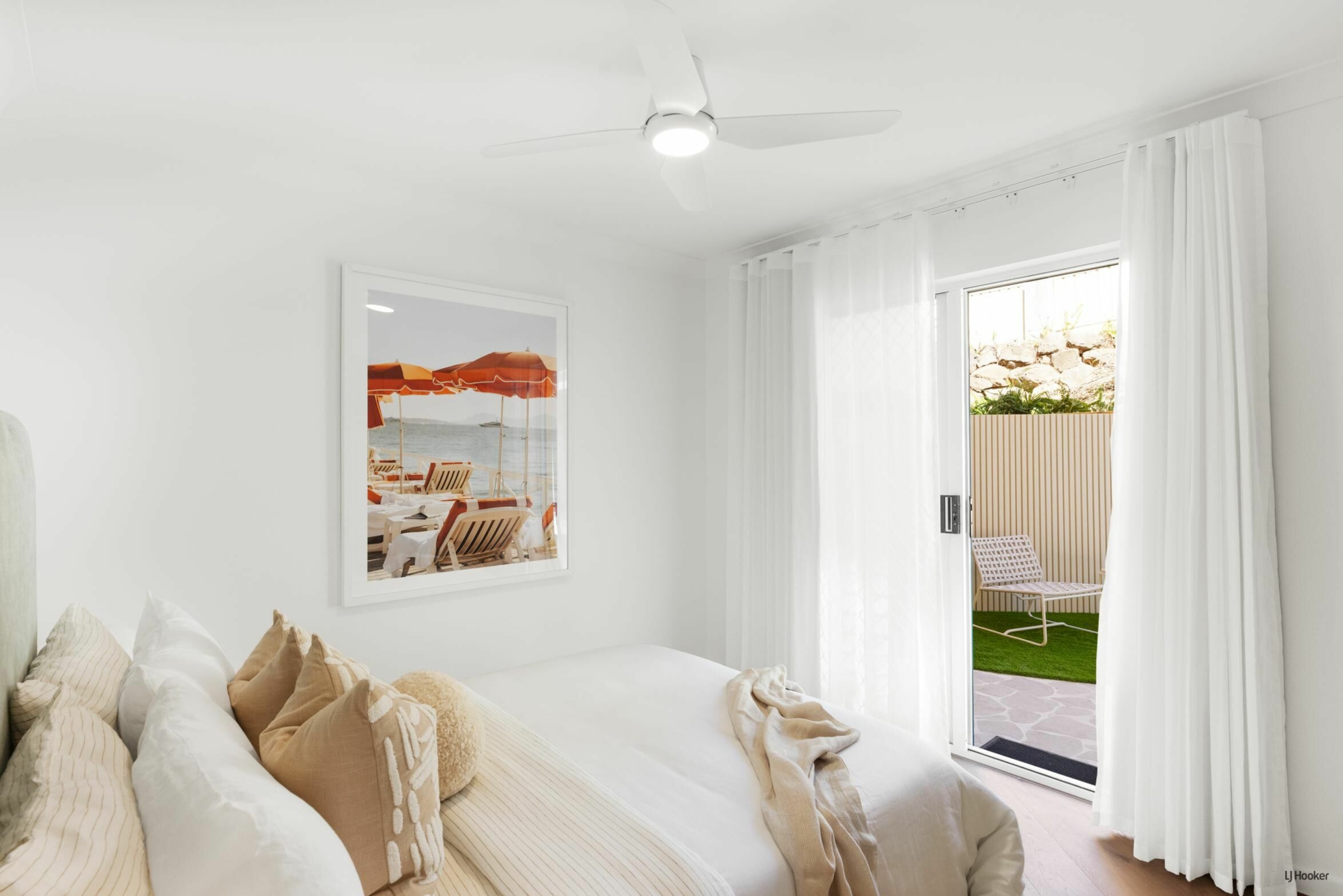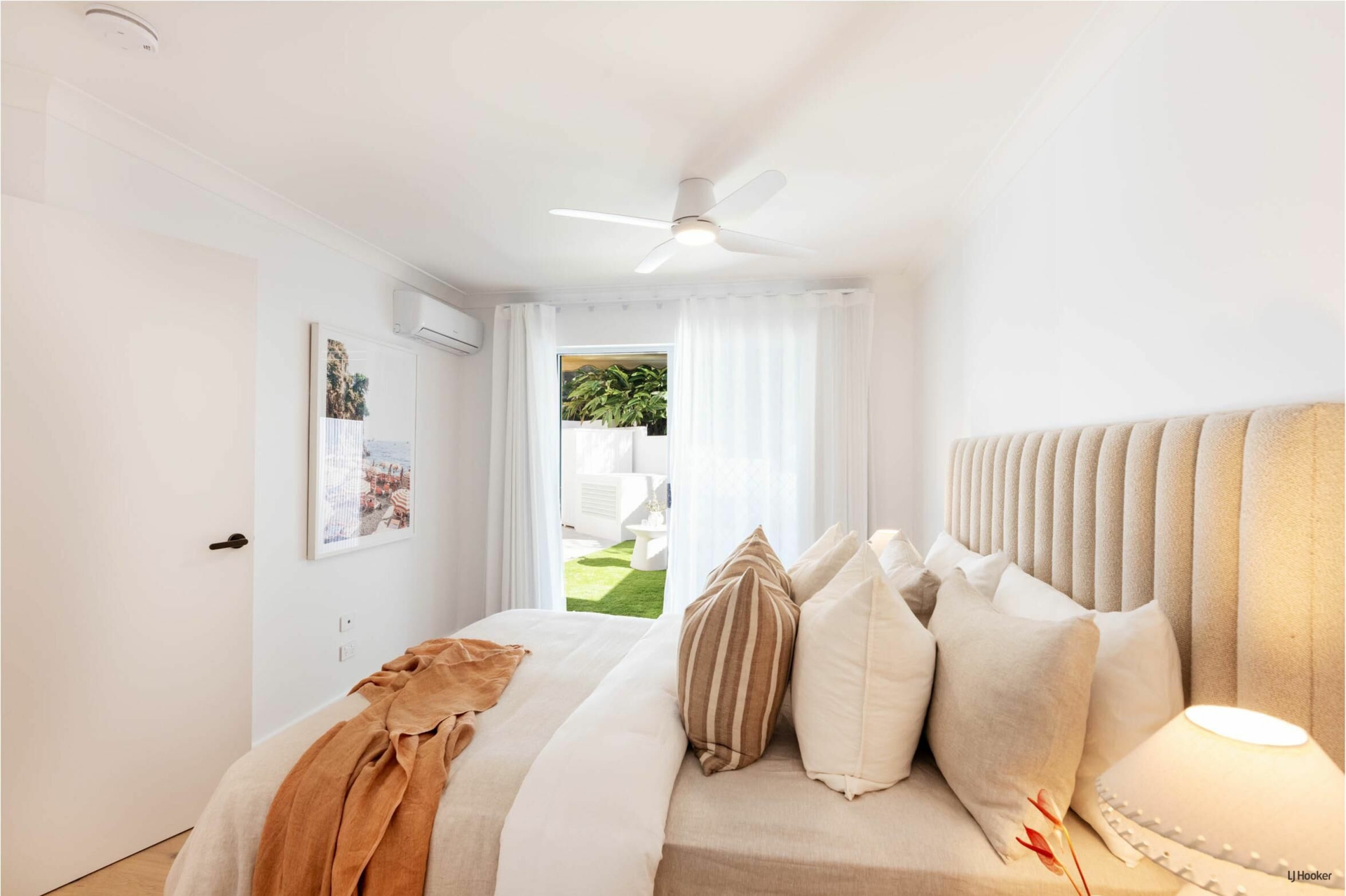 Both bedrooms feature built-in wardrobes and open directly to the expansive courtyard, allowing natural light and garden views to enhance the interiors and reinforcing the home's seamless indoor-outdoor flow.