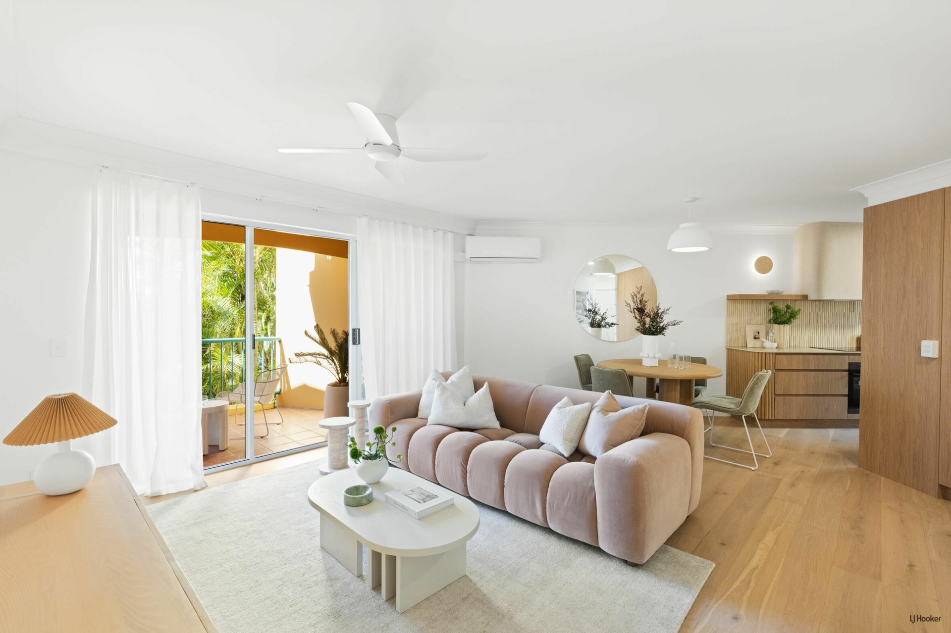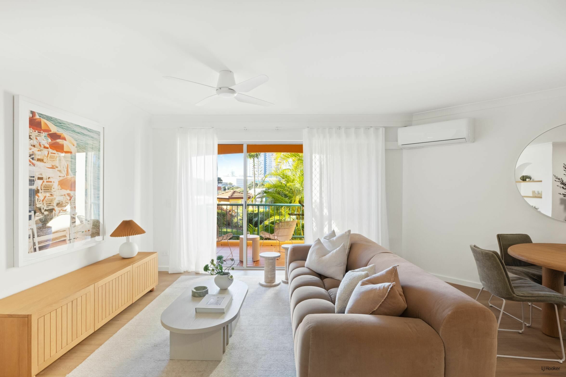 The lounge and dining pair luxe living with functionality, with a full wall of integrated Boston oak cabinetry and a separate laundry, centrally located yet thoughtfully tucked away. Added to the outdoor area is another balcony off the lounge area to watch the palm trees sway with an outlook over the complex and pool area.