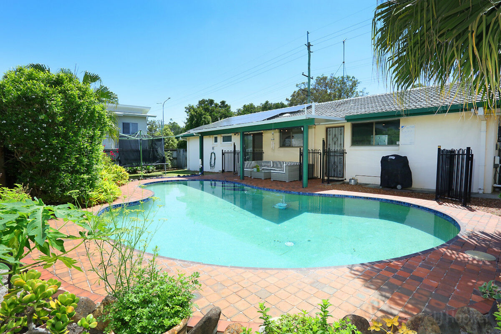• Sparkling saltwater swimming pool with poolside patio
