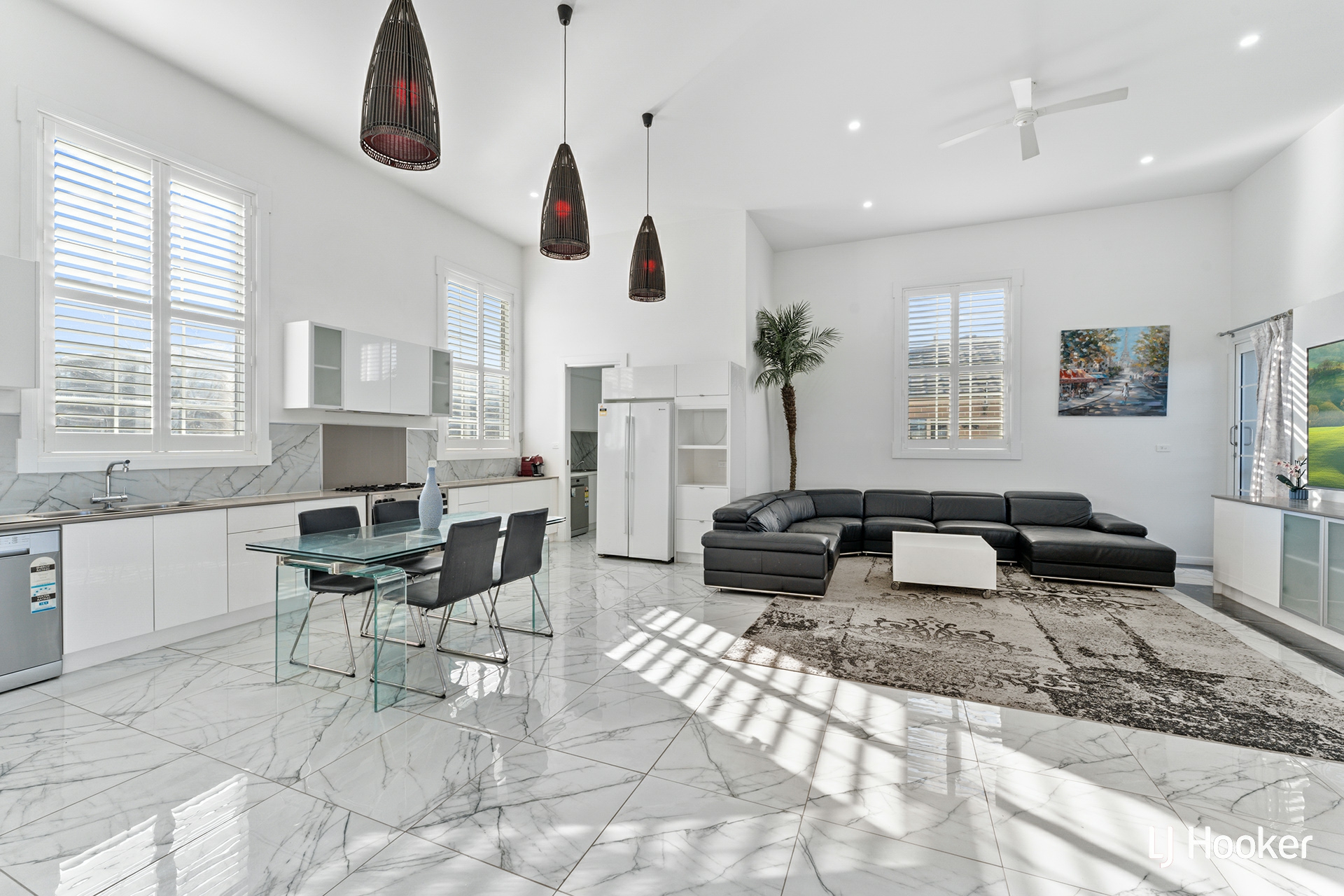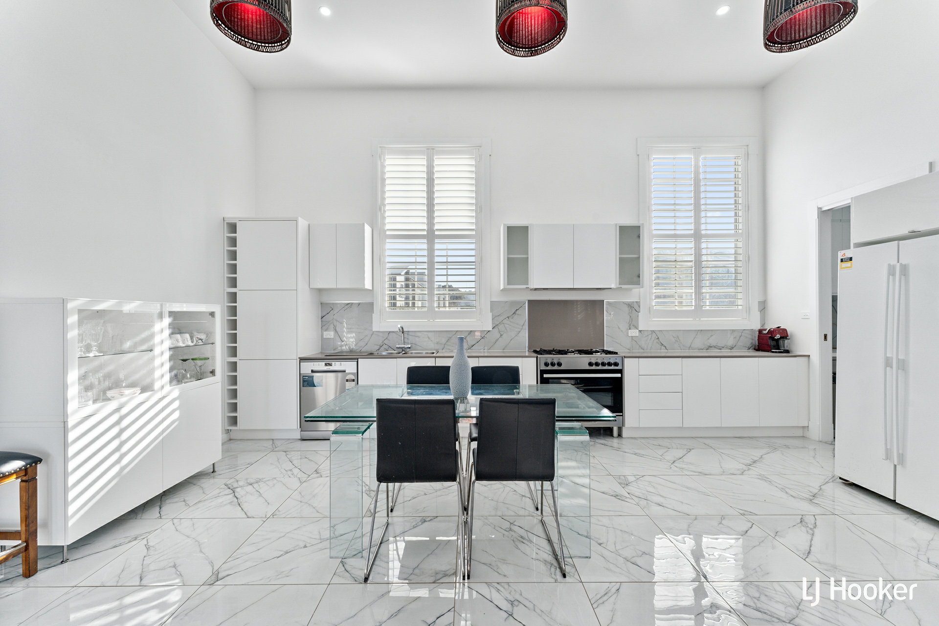 Four-meter-high ceilings and large windows accentuate the space on offer and fill the whole home with natural light. There is seamless flow from the open-plan kitchen to the dining, living areas.