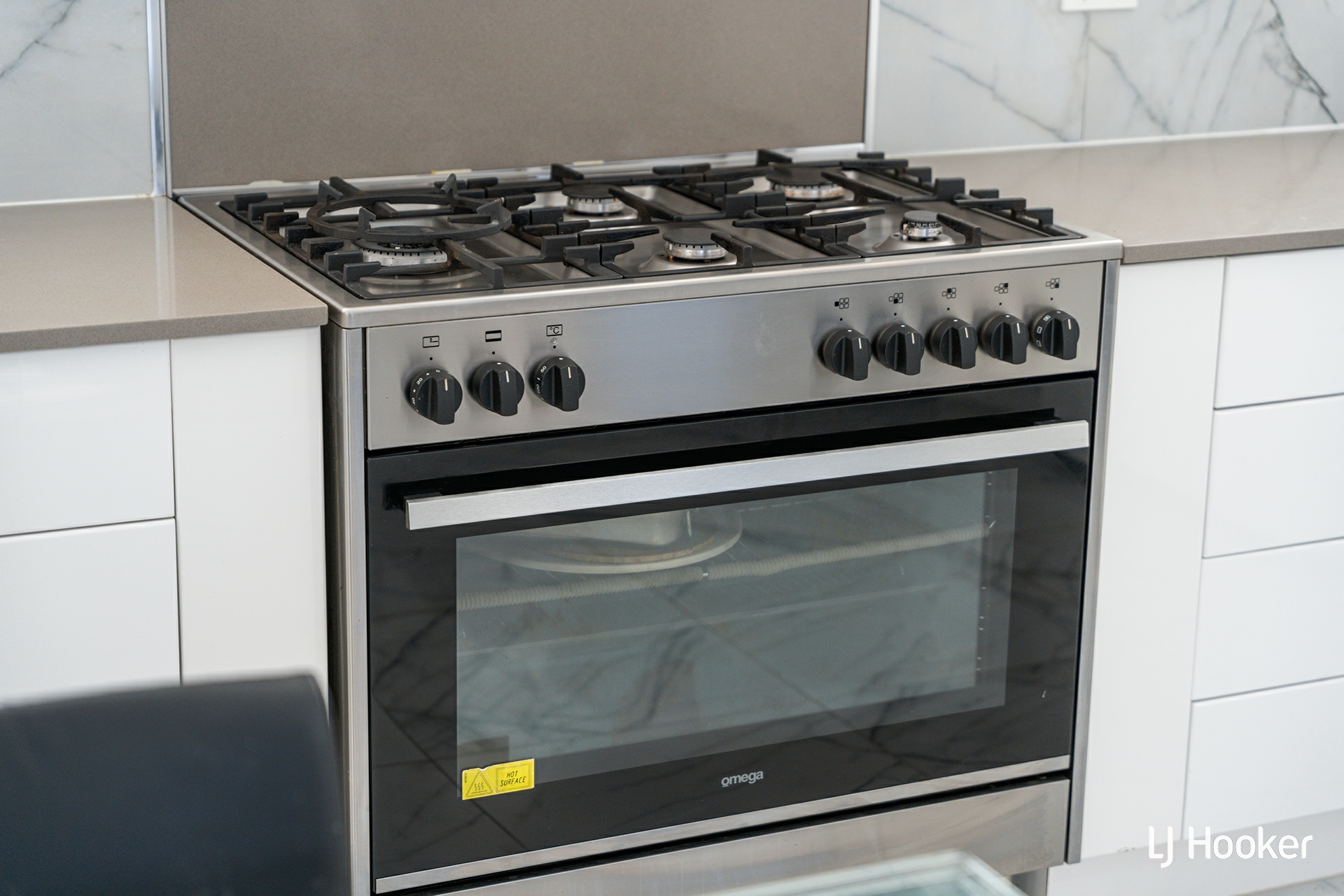 • Kitchen with gas cooktop, stone benchtops and stainless-steel appliances