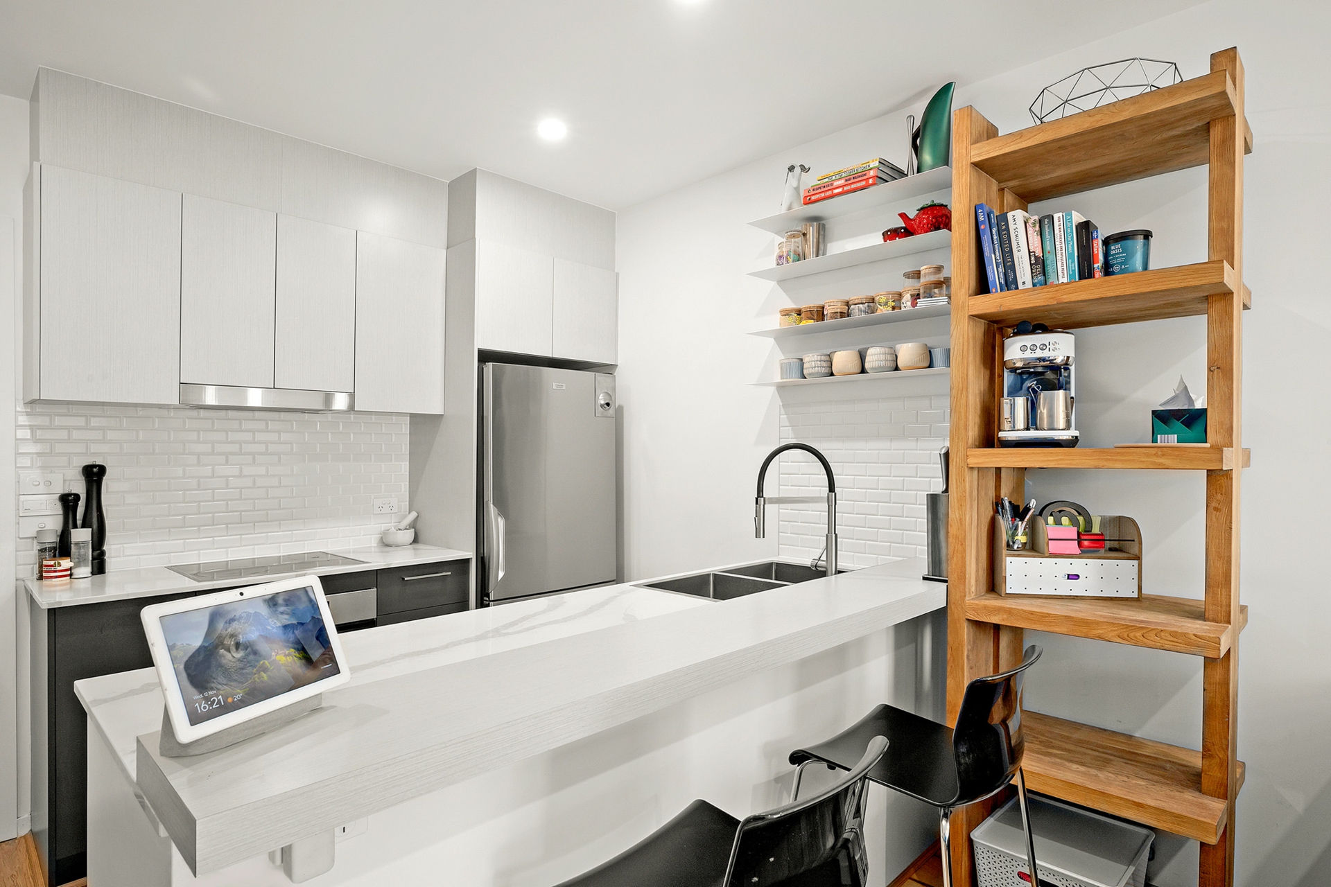 Kitchen furnished with sleek stone bench tops