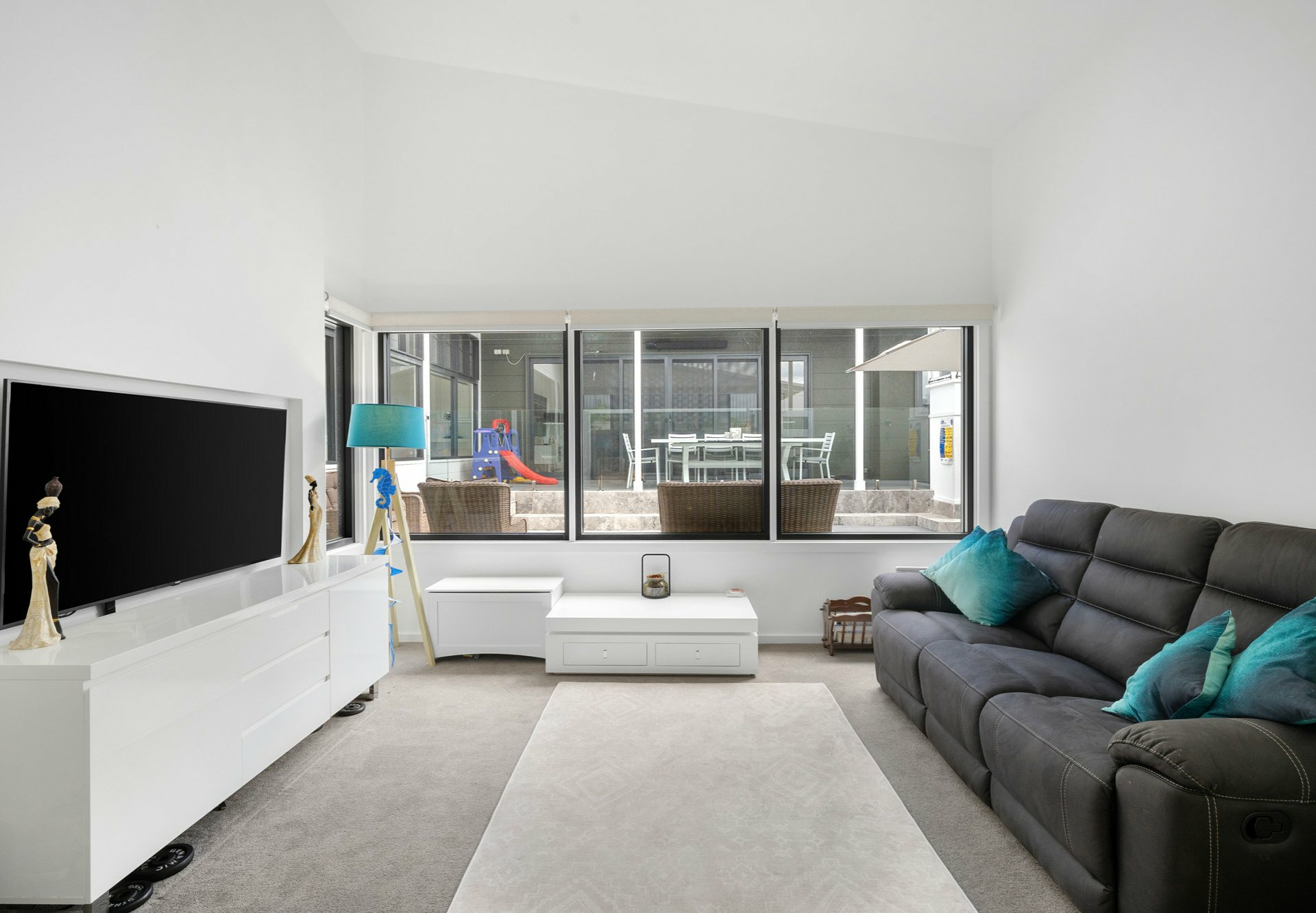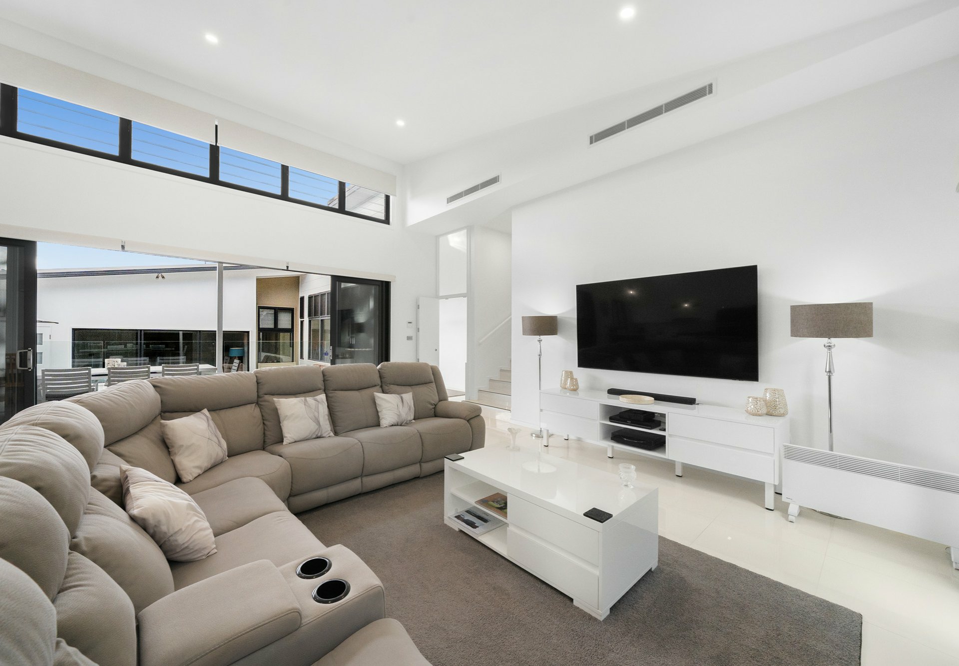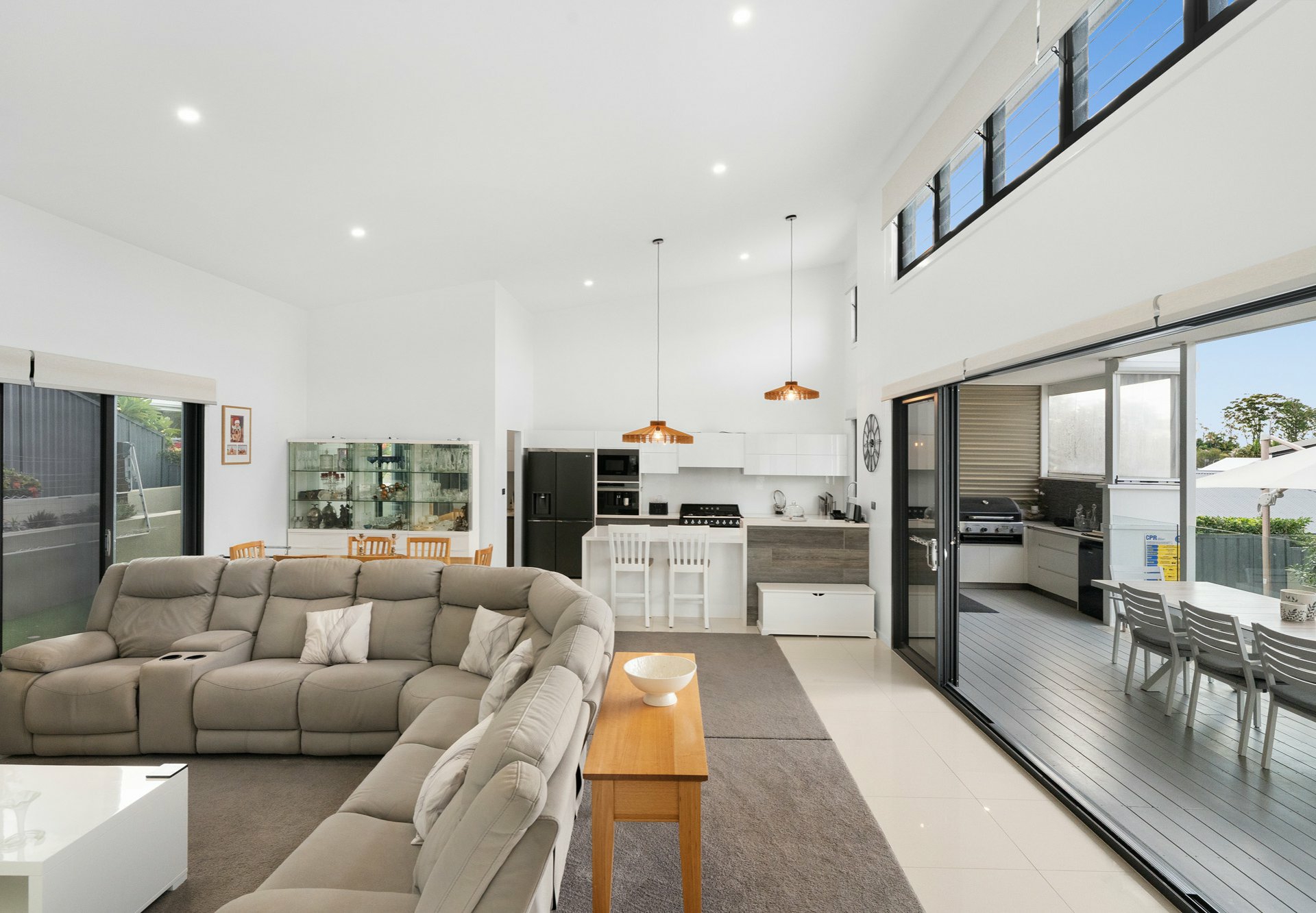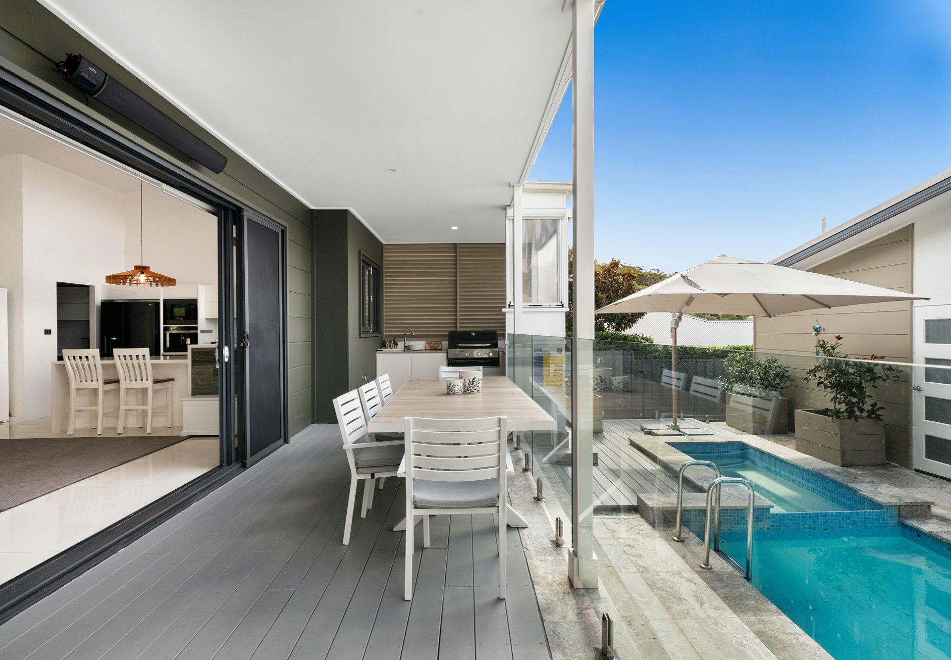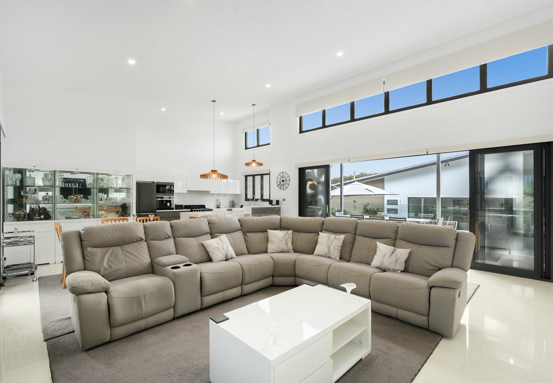 Showcasing soaring ceilings up to 5.5 meters, striking architectural rooflines and expansive open-plan living, the home seamlessly connects indoors to a spectacular private entertaining zone overlooking a saltwater plunge pool and spa with ambient lighting.