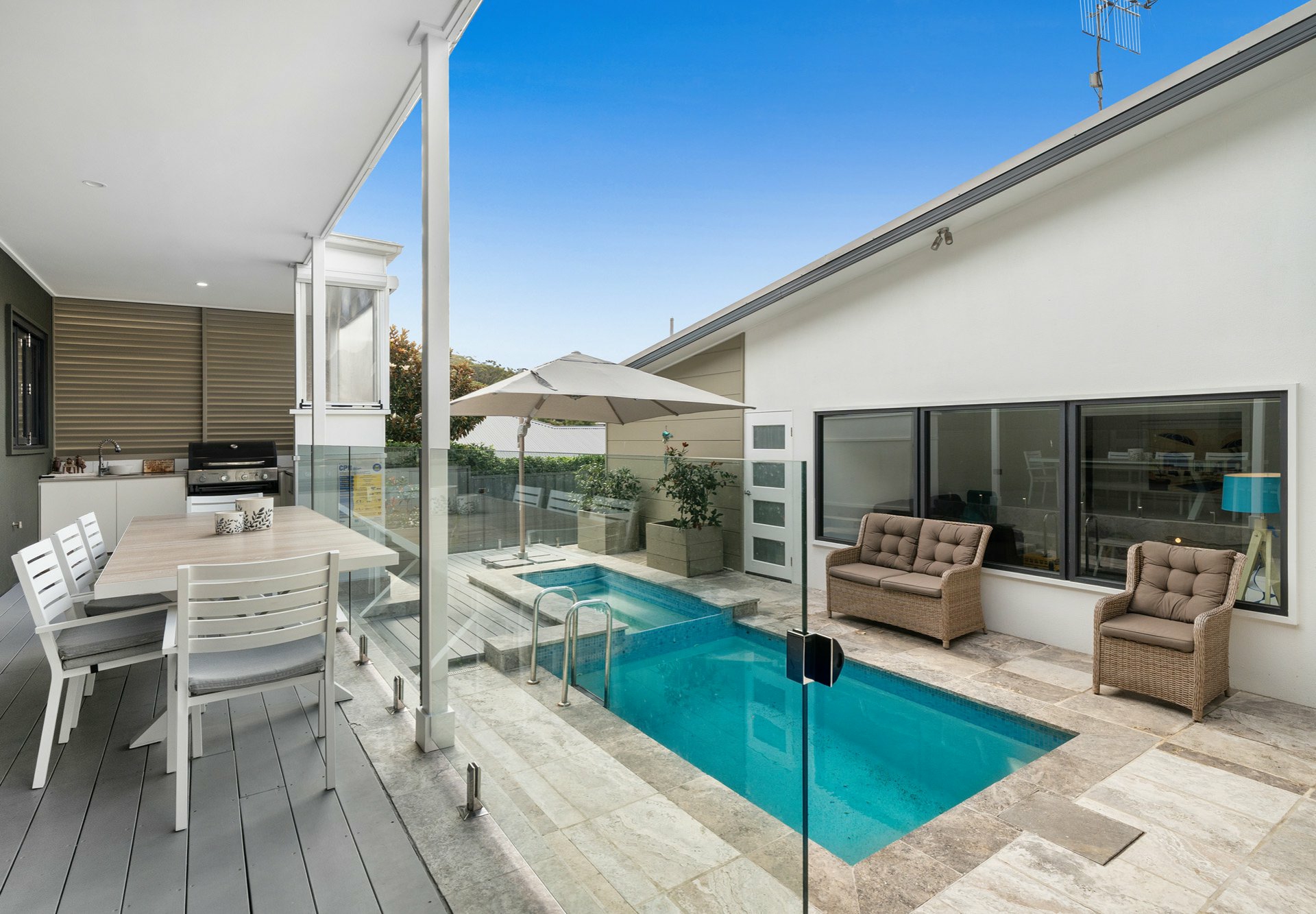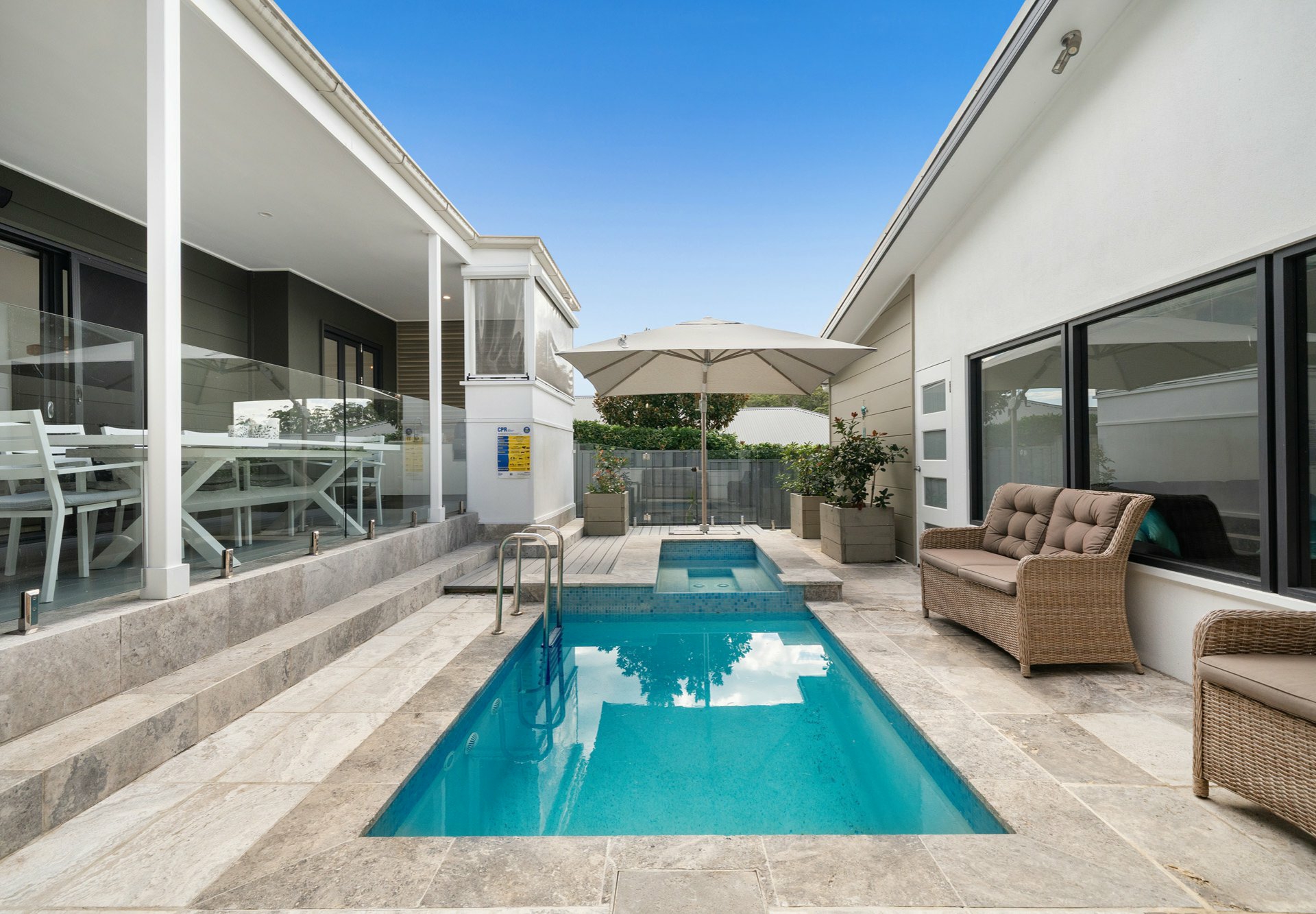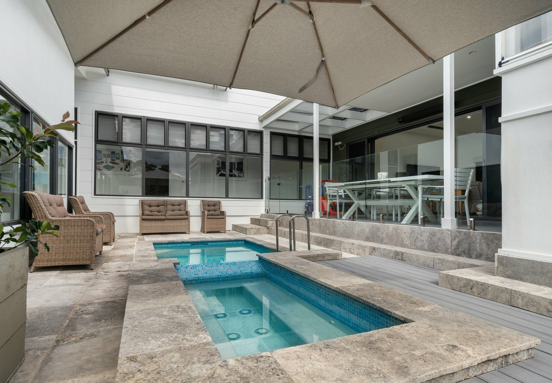 - Saltwater plunge pool and spa with ambient lighting