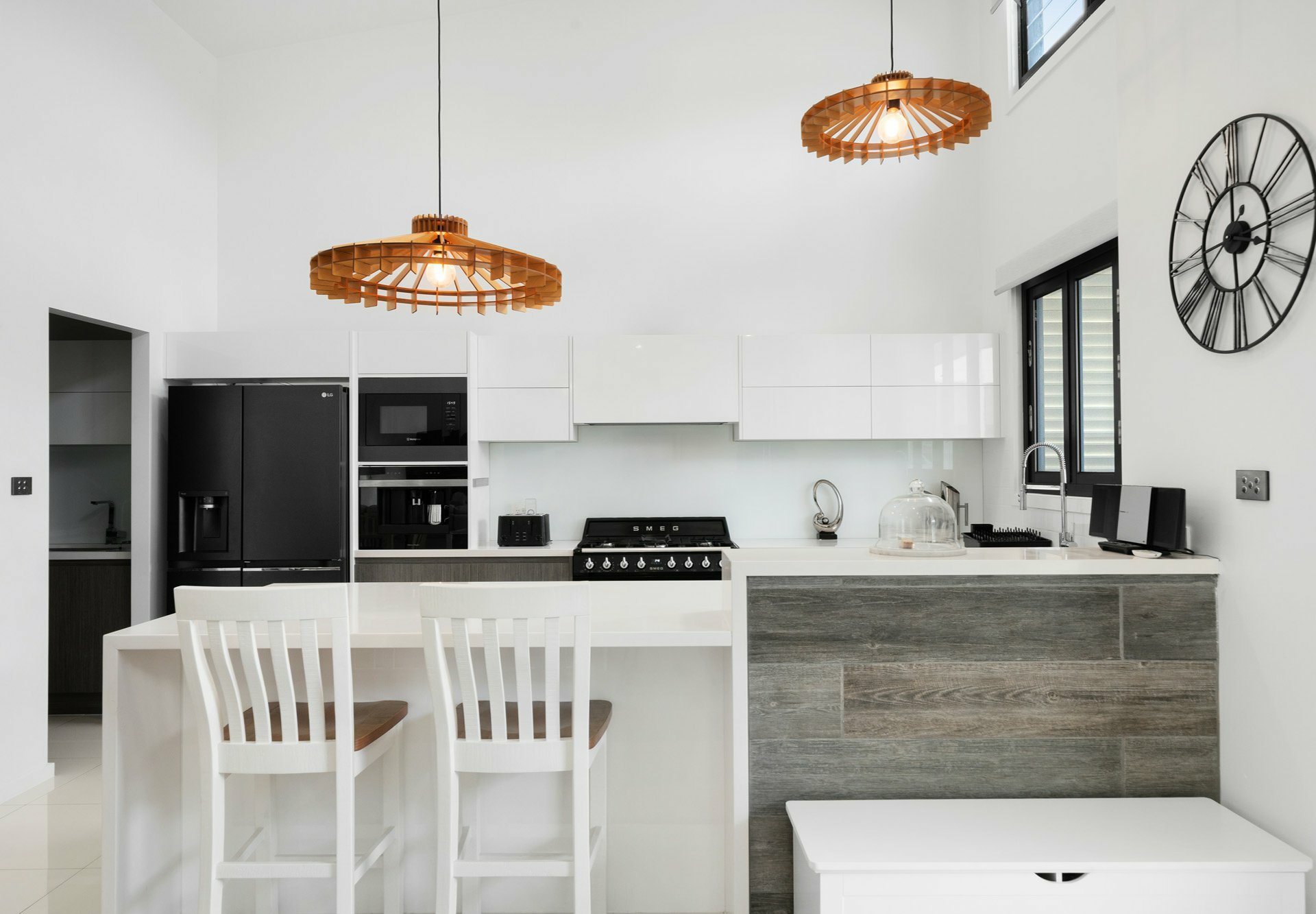 At the heart of the home is a show-stopping gourmet kitchen, equipped with premium stainless steel appliances including a 900mm freestanding oven, gas cooktop, teppanyaki plate, integrated coffee machine, dishwasher and stone benchtops. A fully appointed butler’s pantry with bar fridge, built-in vegetable drawers and glass splash-back completes this entertainer’s haven.