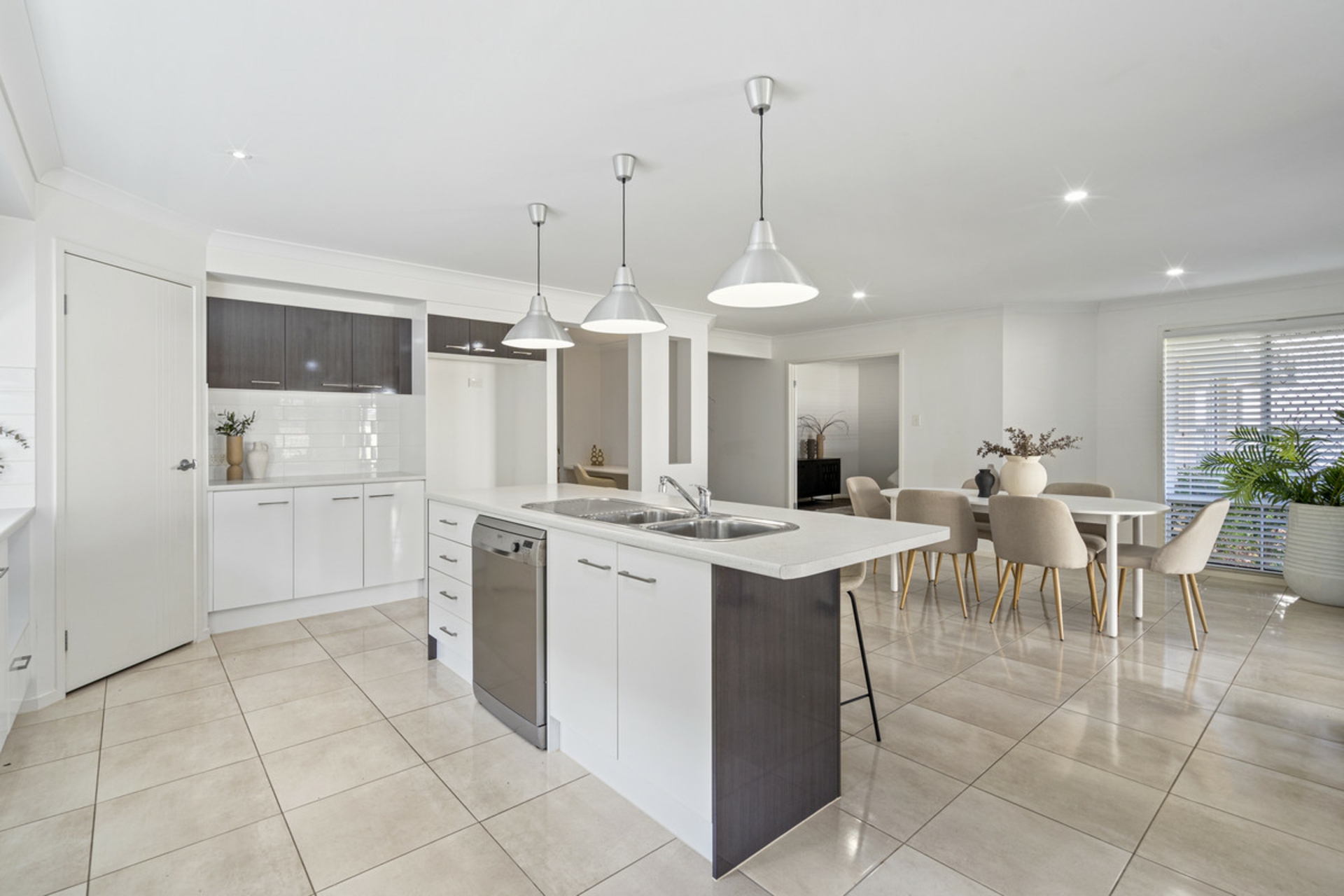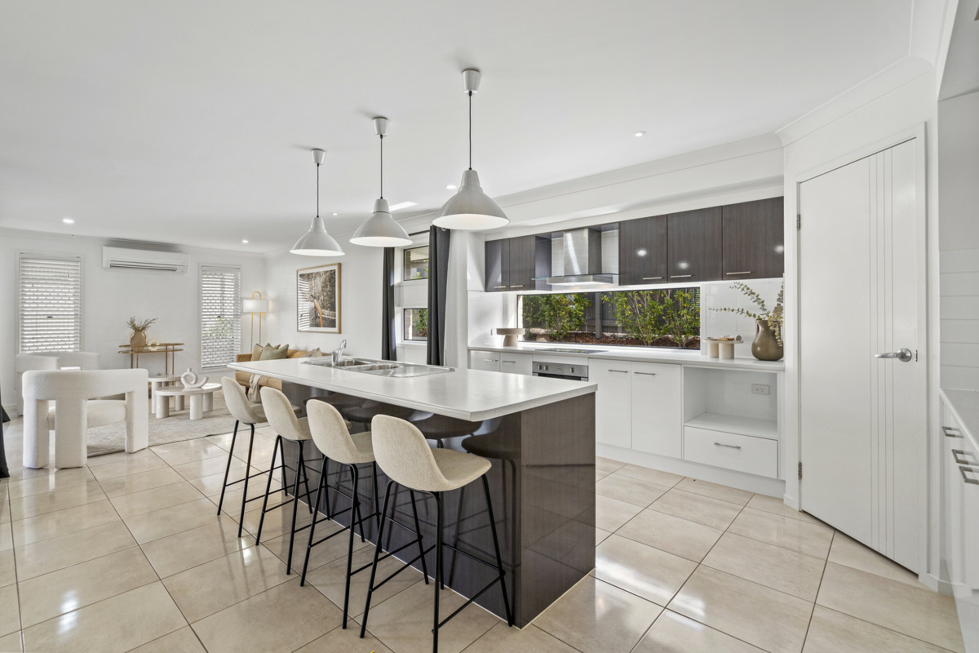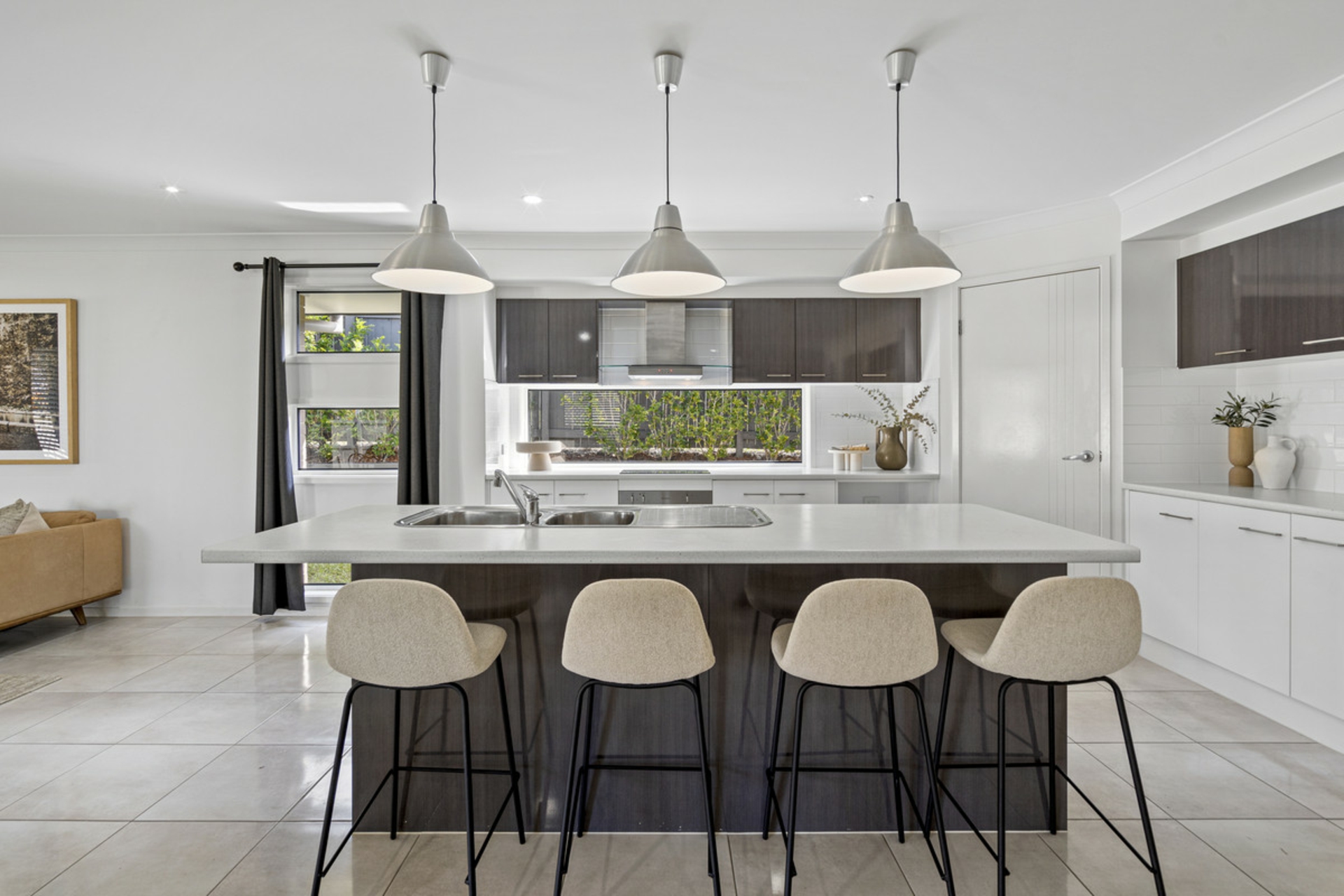 •Modern kitchen with large island bench, 600 mm wide oven, and deep pantry