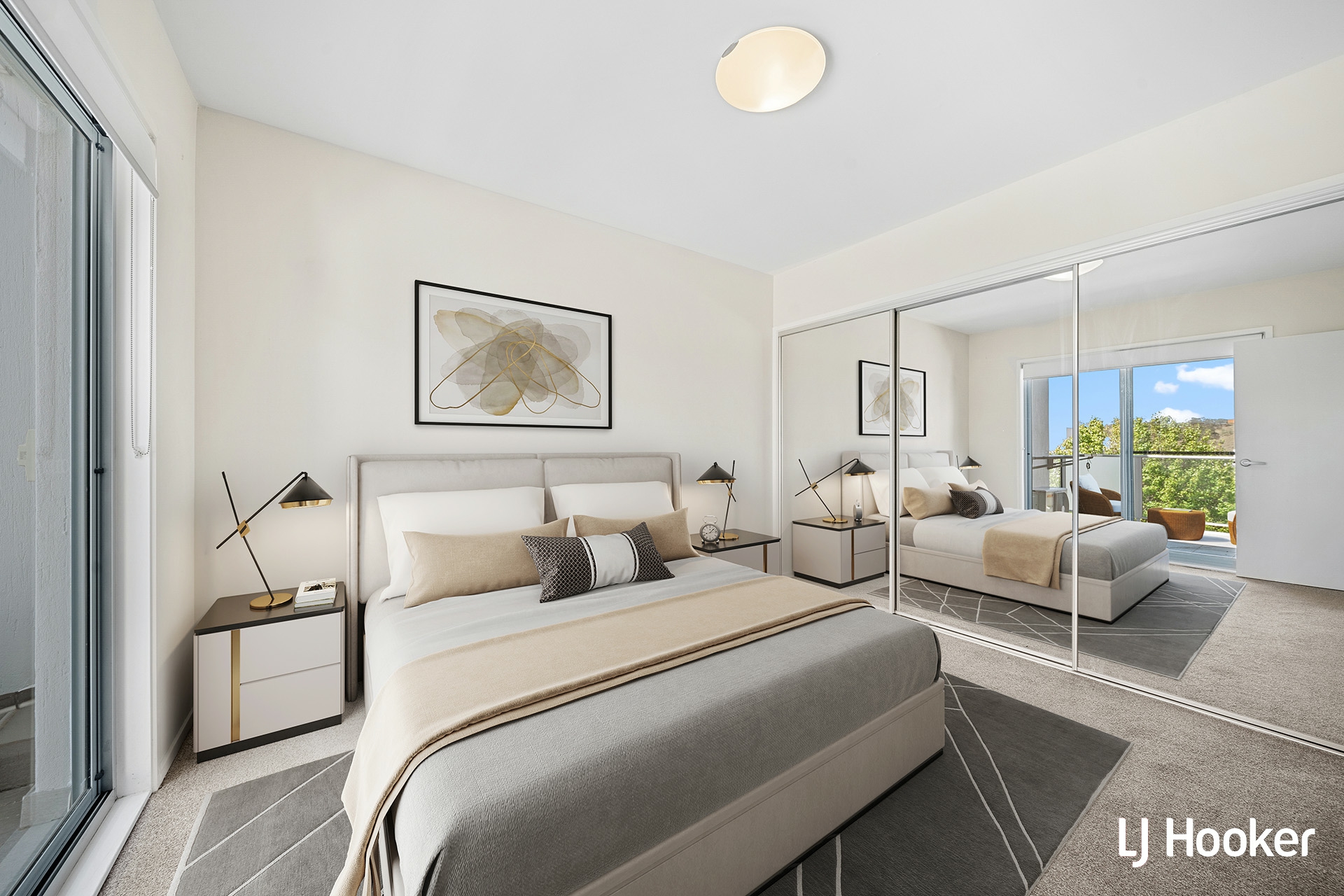 • Large main bedroom with a three-panel glass doored wardrobe and step out access to the balcony