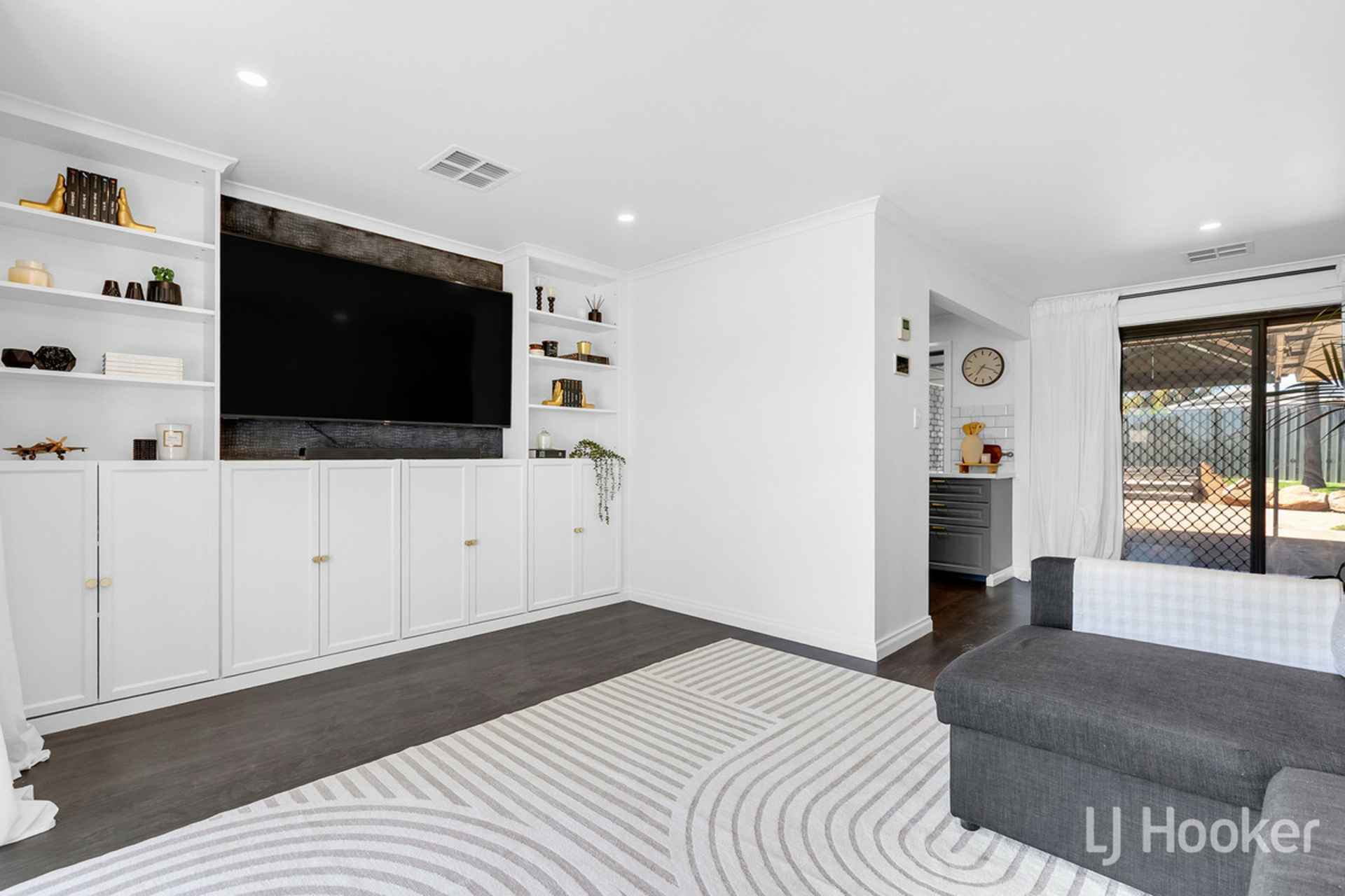 Relax and unwind in the formal front lounge, featuring a large built-in entertainment unit and shelving in crisp white, along with a bay window and roller shutters. Year-round comfort is assured with ducted reverse-cycle air conditioning throughout the home.