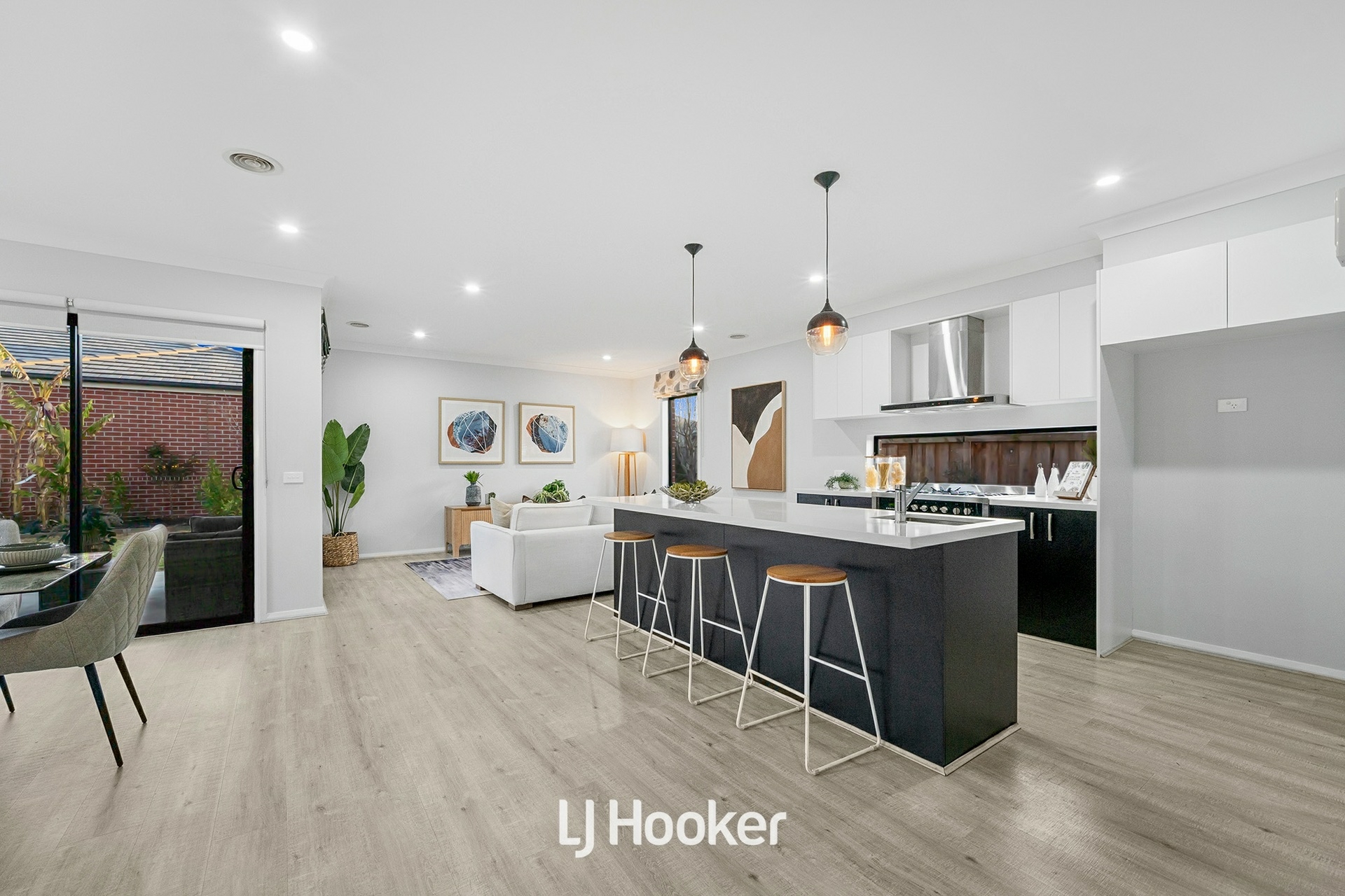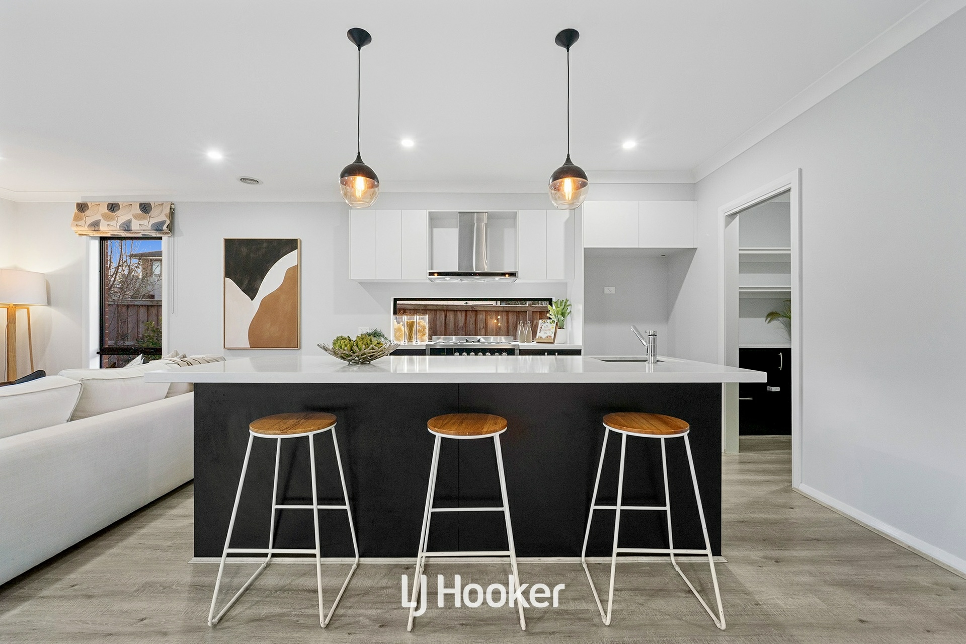 Beyond the welcoming porch entry, a versatile home office sits opposite a light-filled lounge, creating the perfect introduction to the home's versatile design. At its heart, expansive open-plan living and dining areas are anchored by a gourmet kitchen featuring a striking stone island, butler's pantry, premium stainless-steel appliances, and abundant storage. Glass doors extend the living spaces to a covered alfresco and landscaped backyard - an idyllic setting for year-round entertaining and family gatherings. Completing the ground floor are a sleek powder room, a well-equipped laundry, and a double garage with rear roller door access for additional convenience.