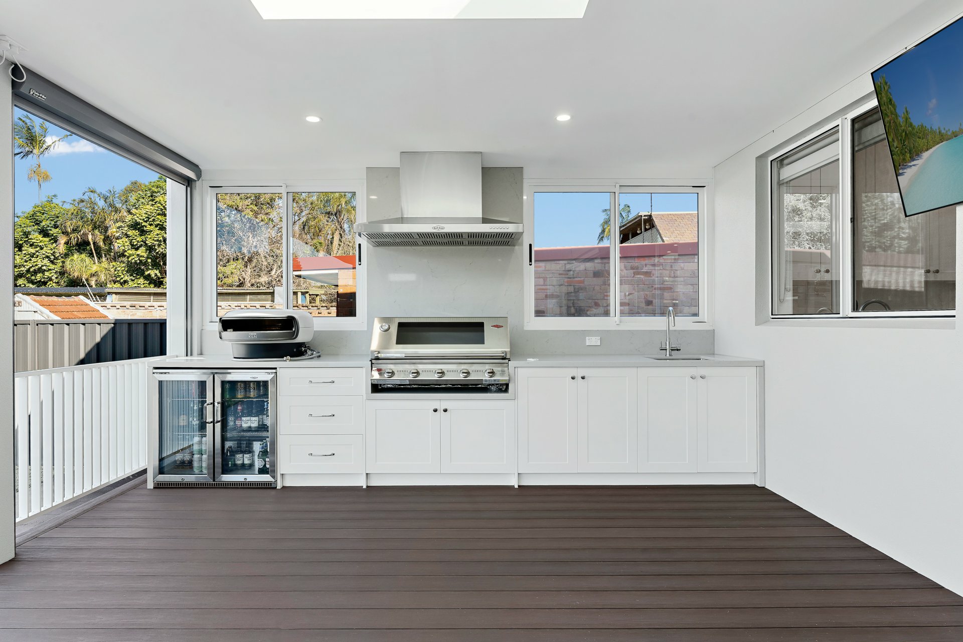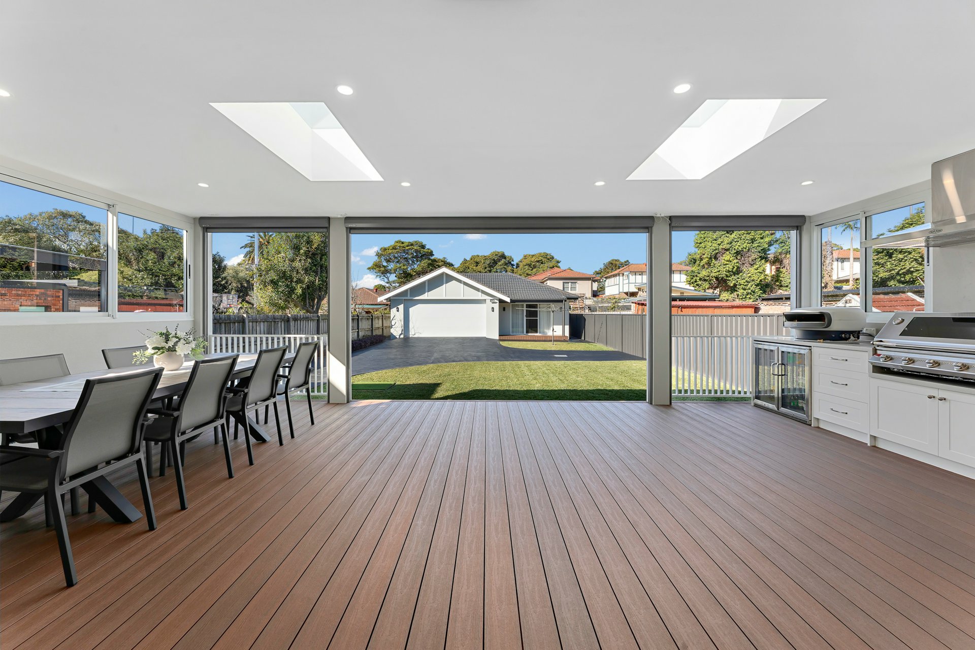 The huge open plan living and dining zones flow effortlessly through bifold doors to an expansive undercover entertaining patio with an outdoor kitchen, inbuilt BBQ and automated blinds for climate control and privacy.