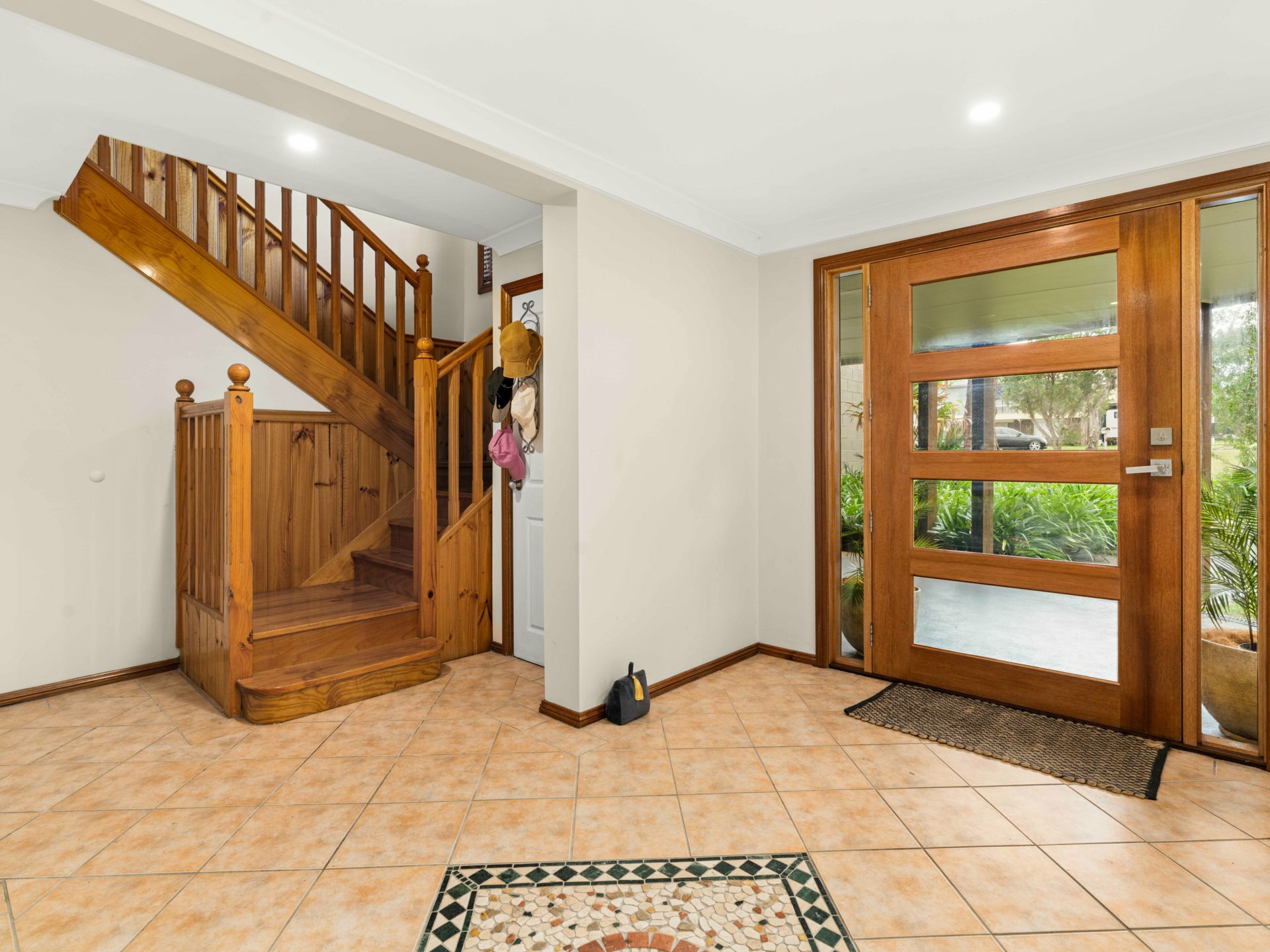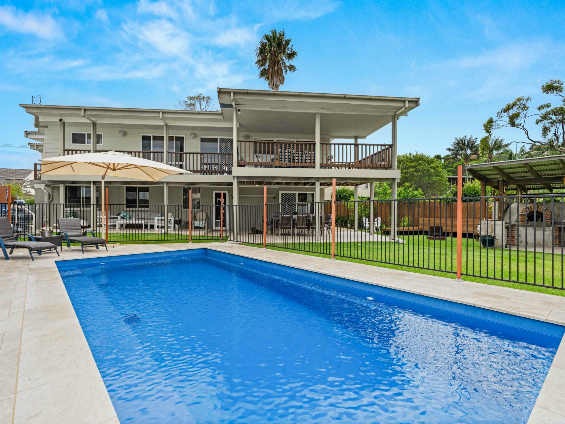 Upstairs, the heart of the home consists of a spacious lounge room with a cosy woodfire the living area opening onto the raised timber deck/rear balcony, capturing natural light, a leafy outlook, water glimpses and overlooks the rear yard, pool, firepit area and outdoor kitchen. A modern well-appointed kitchen featuring stone benchtops and gas cooktop, servery to the front balcony. The dining room adjoins the loungeroom, perfect for family meals and entertaining then out to a large rear outdoor entertaining area where you can watch the sunset and native animals in the reserve. All five upstairs bedrooms are generous in size and include ceiling fans and built-in robes, with the main bedroom enjoying his & hers wardrobe and private access to one of the two front balconies. One bedroom has direct access to a shared ensuite, while the main bathroom is spacious and styled in a neutral palette and services the rest of the level. Additional features include polished timber floors in the living areas.