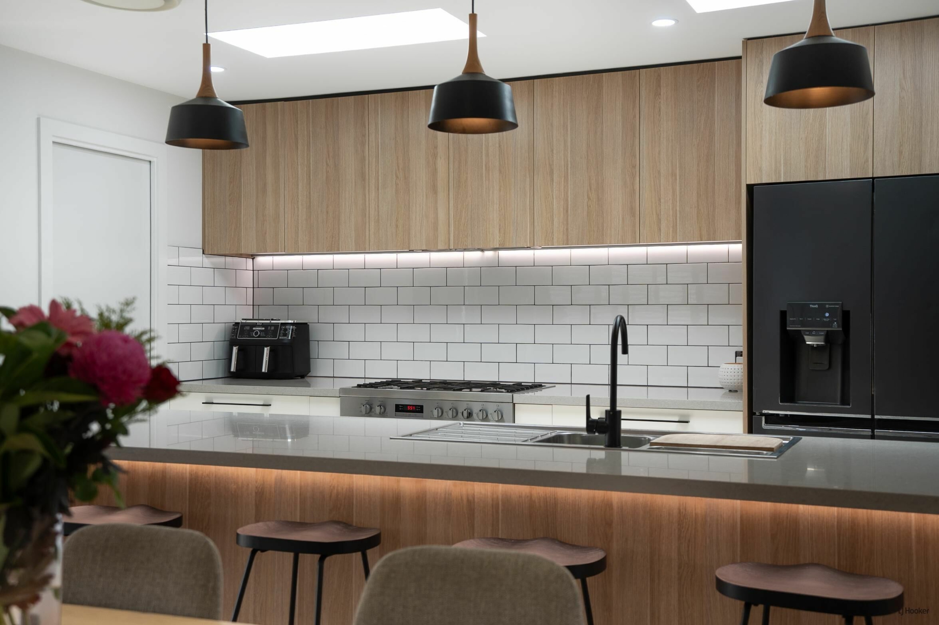 - Designer kitchen with 40mm stone benchtops, waterfall-edge island, 900mm gas cooktop and electric oven, plumbed fridge, and butler's pantry