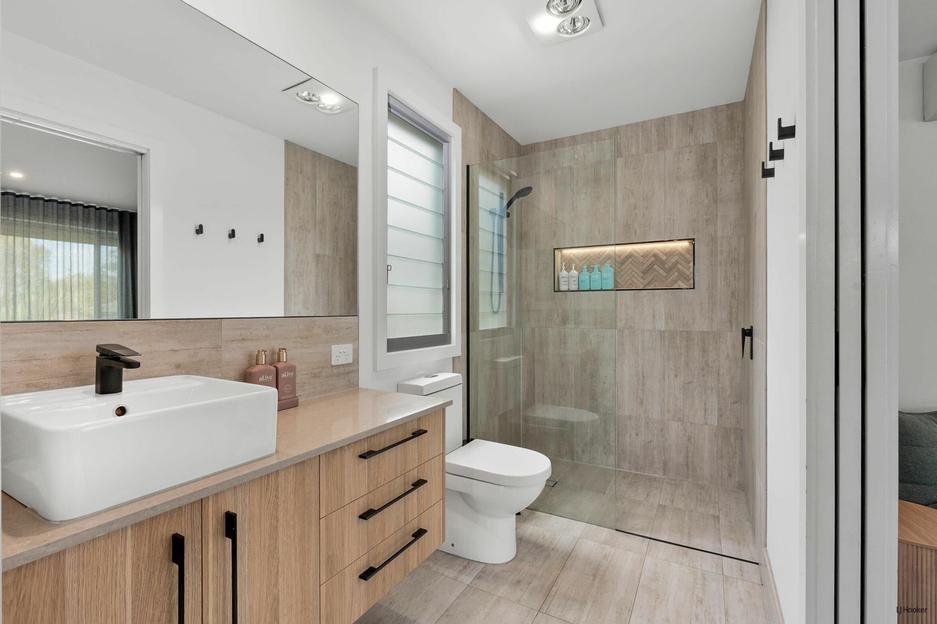 The self-contained granny flat is ideal for multi-generational living, long guest stays or generate an income with a rental return. It offers a full kitchen, modern bathroom, and space for a king bed and dining zone.