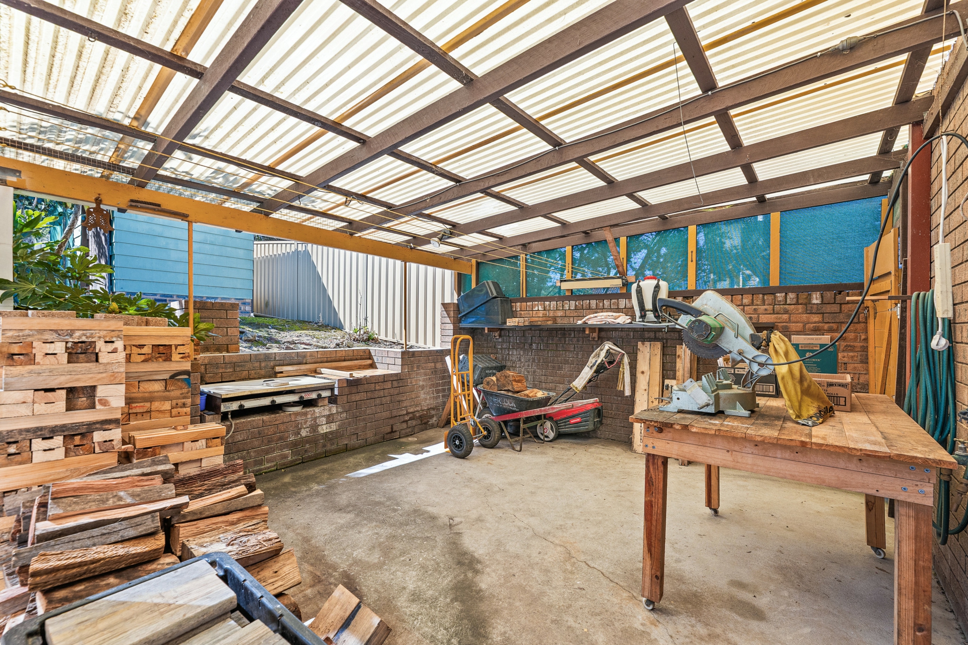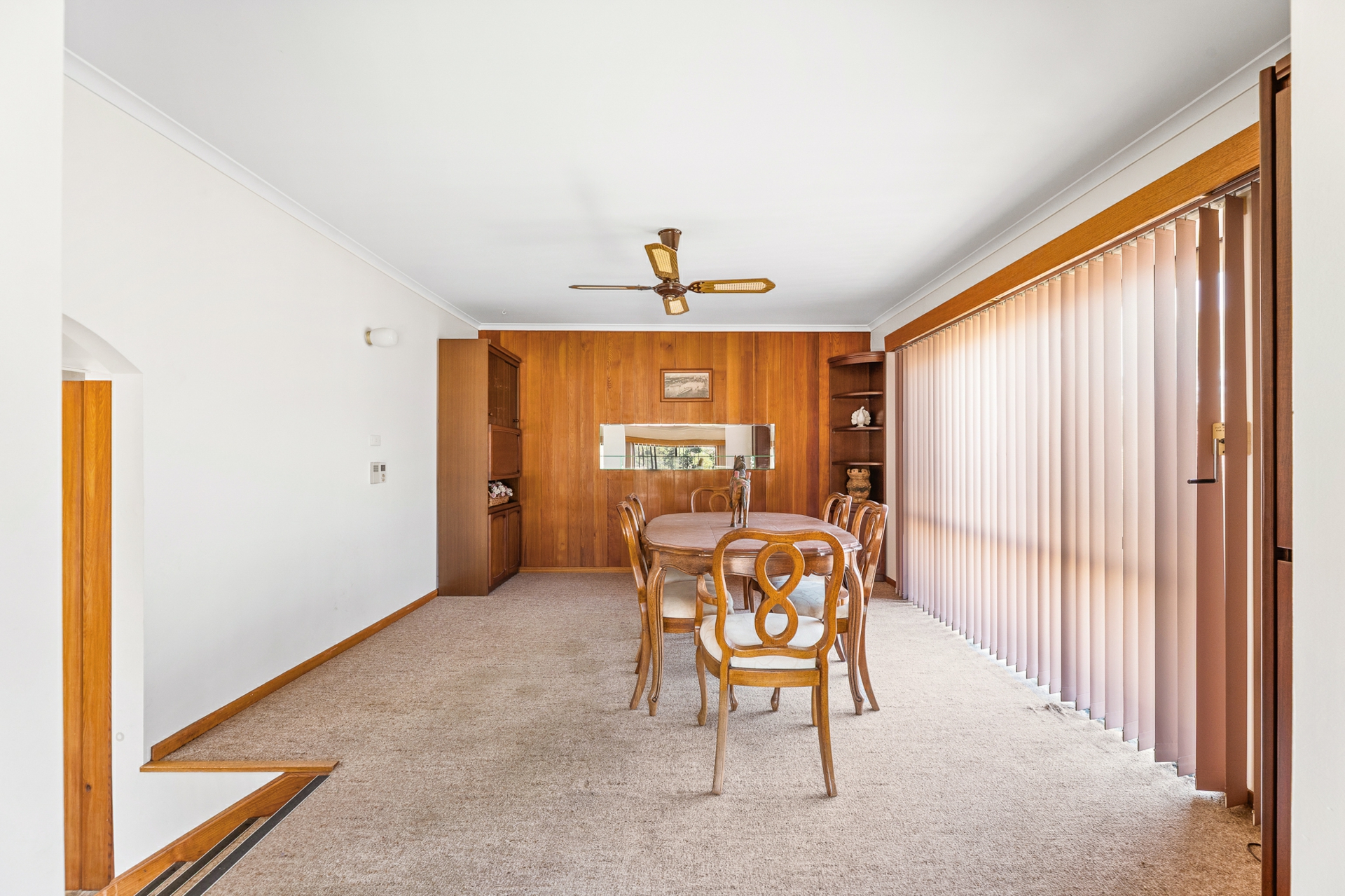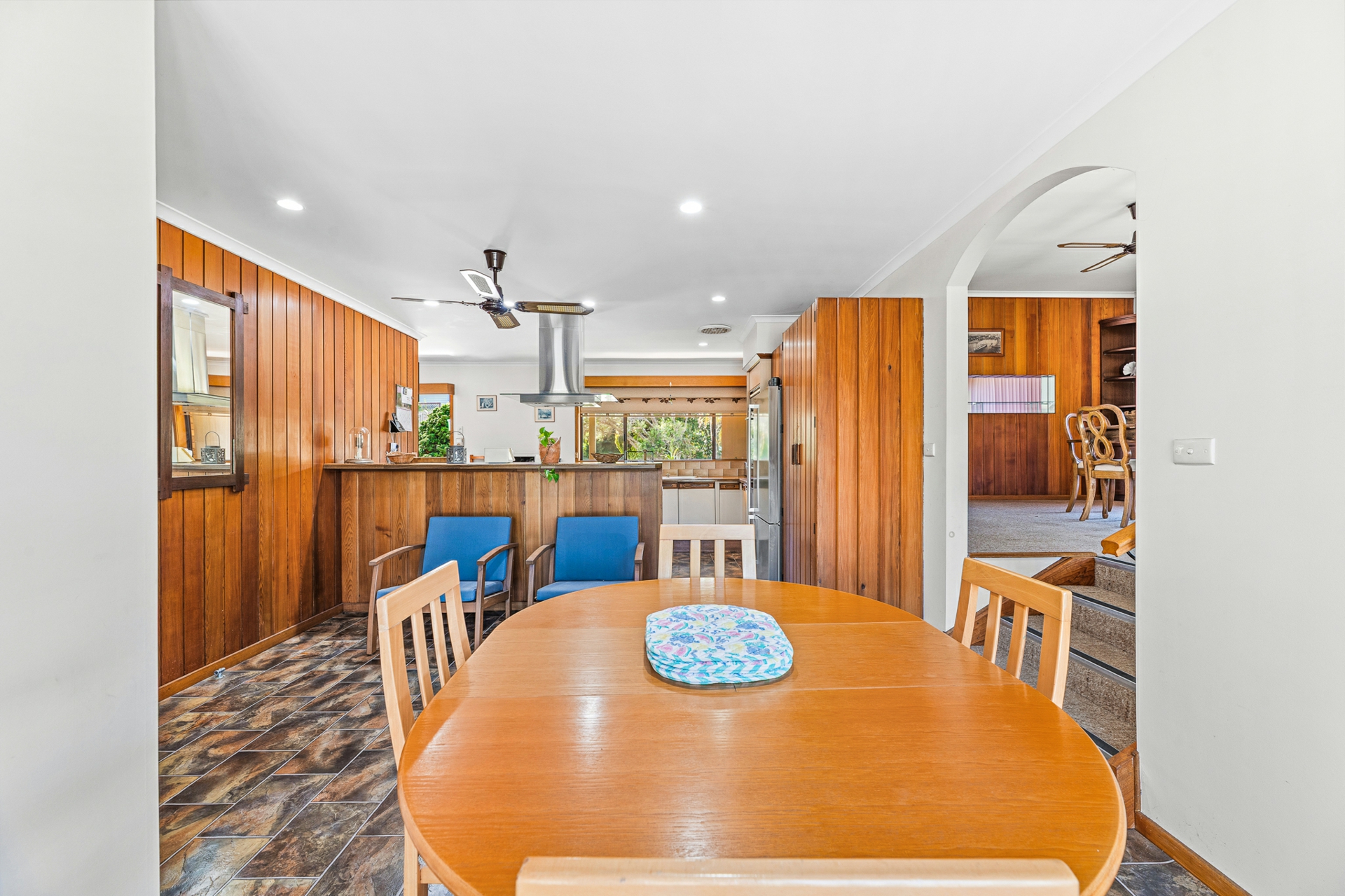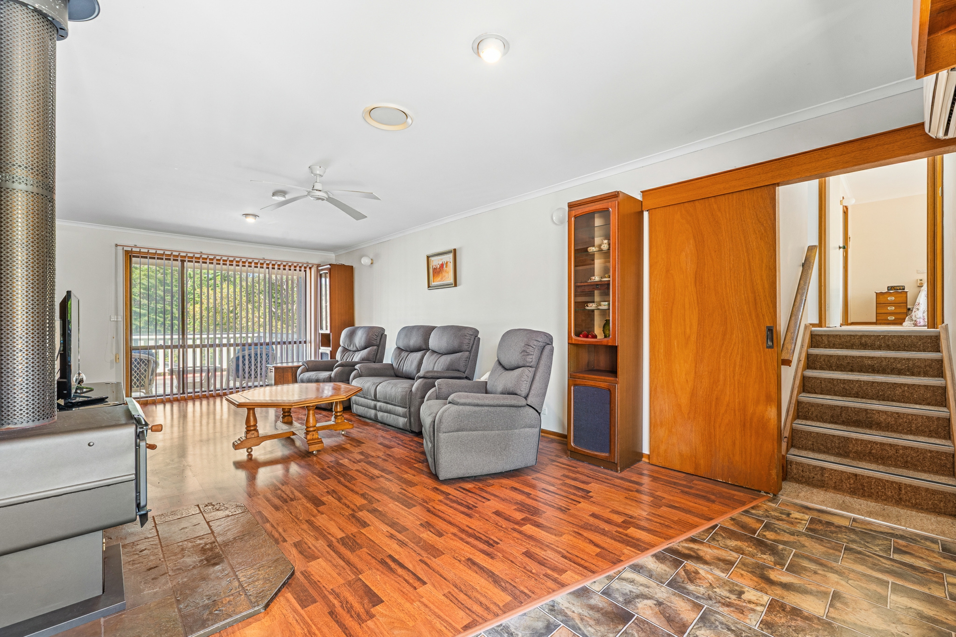 The home is well-equipped for family living, featuring a gas cooktop, electric oven, a new wood-fired heater in the main lounge, and a separate formal dining area.
