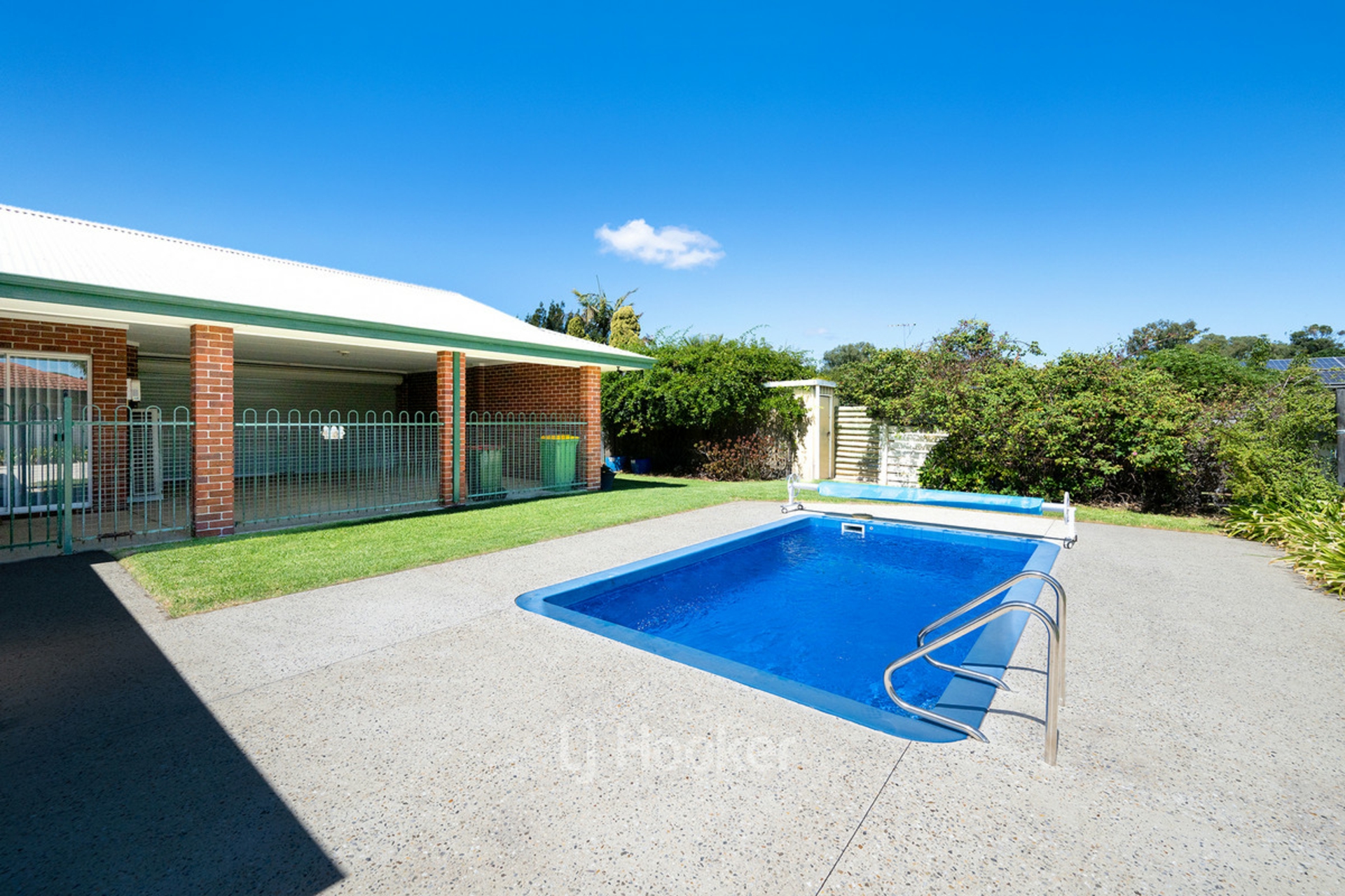 - Heated below ground pool surrounded by exposed aggregate concrete