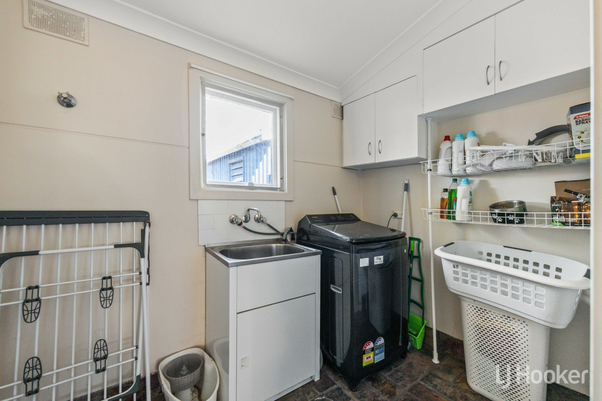 The updated open plan kitchen will appeal to those who love to cook, offering ample bench space, overhead cupboards, and a gas cooktop. The adjoining laundry is both practical and functional, featuring built-in cupboards and slate stone flooring.