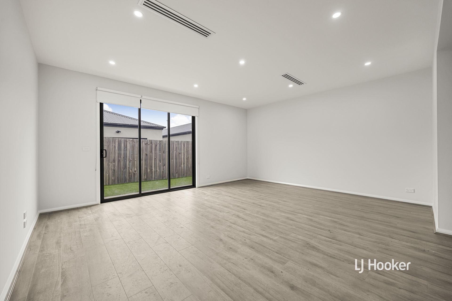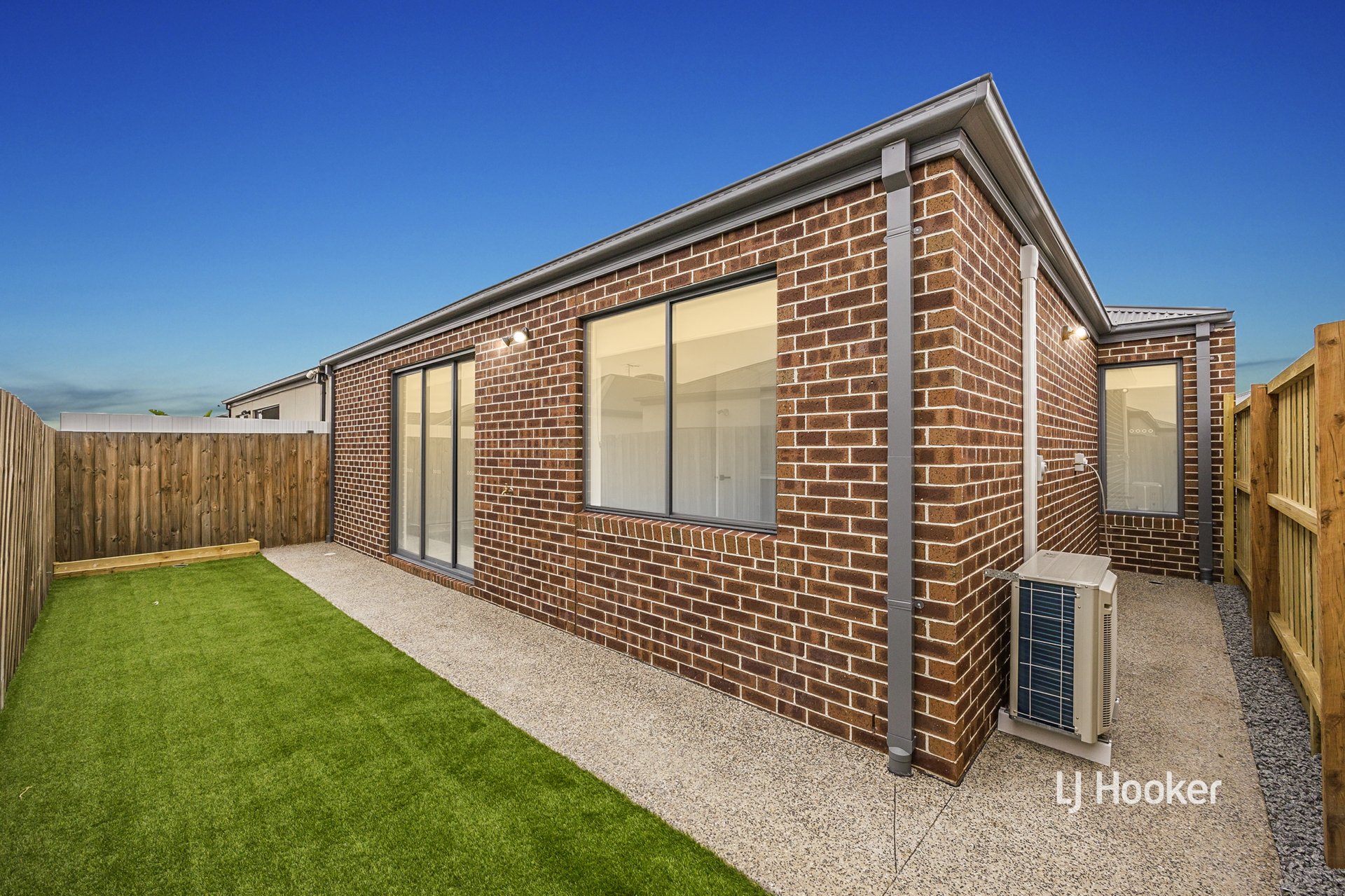 - A fully fenced, low-maintenance backyard extends from the living area, offering a private outdoor retreat complete with lush artificial lawn and an exposed aggregate pathway.