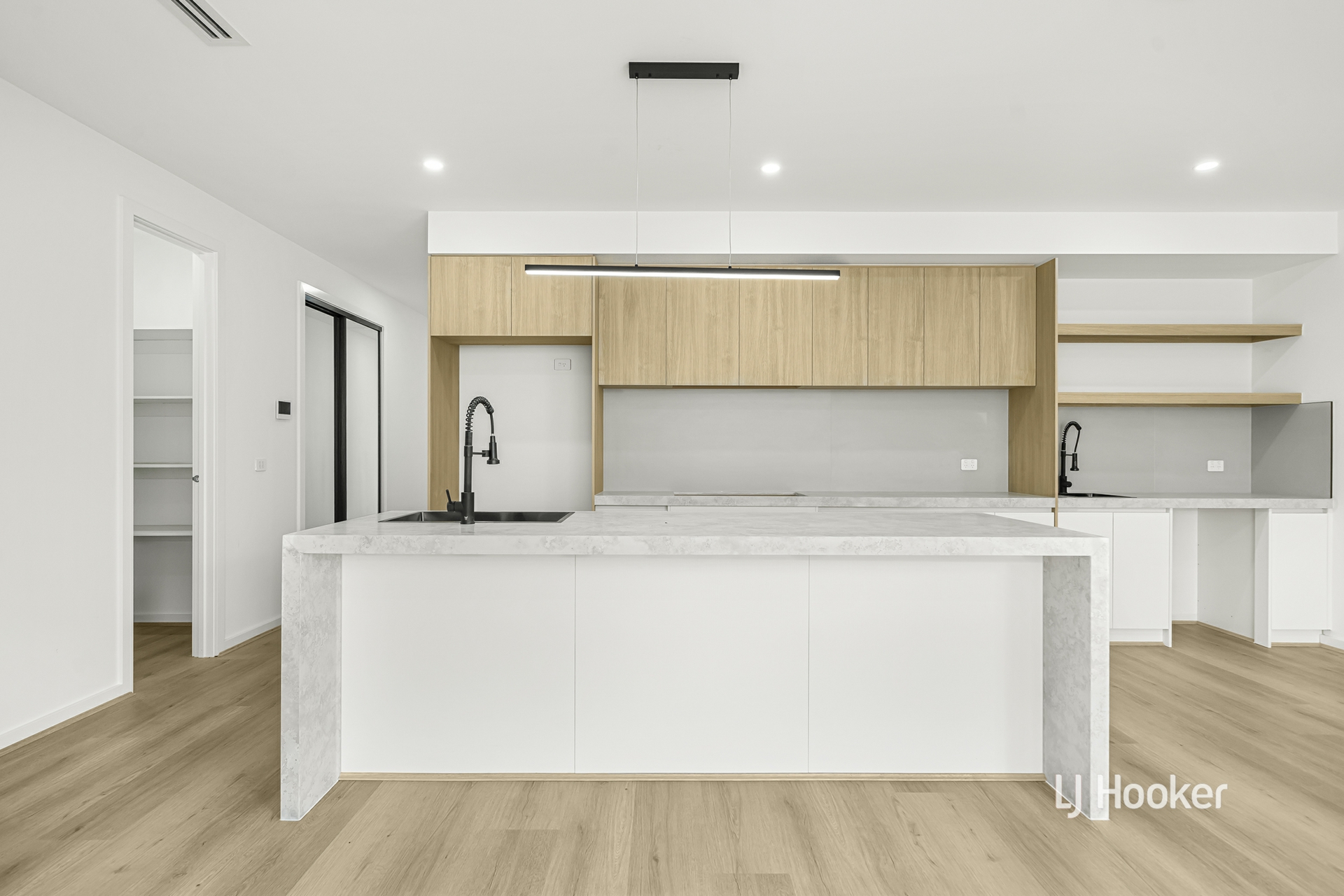 - The statement kitchen has been crafted for both elegance and practicality, featuring 60mm stone benchtops with waterfall edges, matt white tiled splashback, 900mm stainless-steel appliances, dishwasher, soft-close cabinetry, bulkhead with feature lighting, a walk-in pantry, plumbed fridge cavity and abundant storage - all overlooking the main living zones for seamless everyday enjoyment.