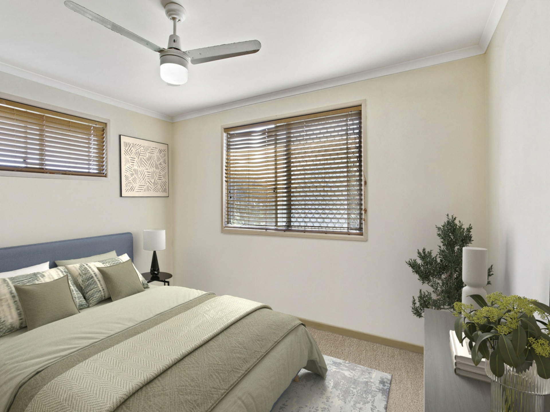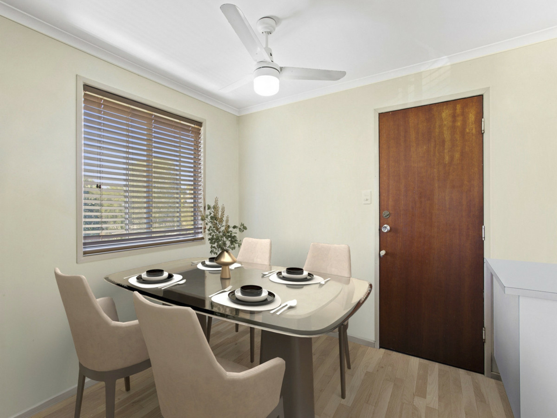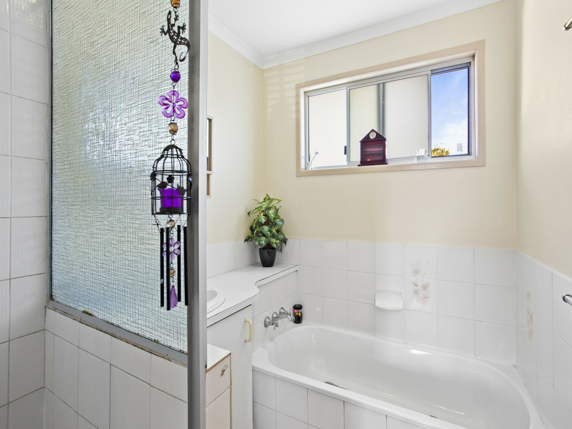 The home features four bedrooms, two complete with built-in robes and ceiling fans. The main bathroom is conveniently located and includes a bathtub, shower, and separate toilet for added practicality.