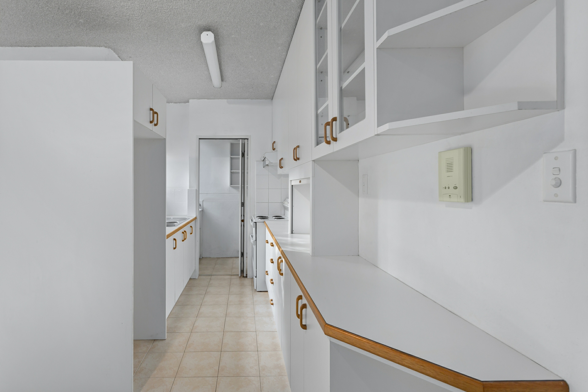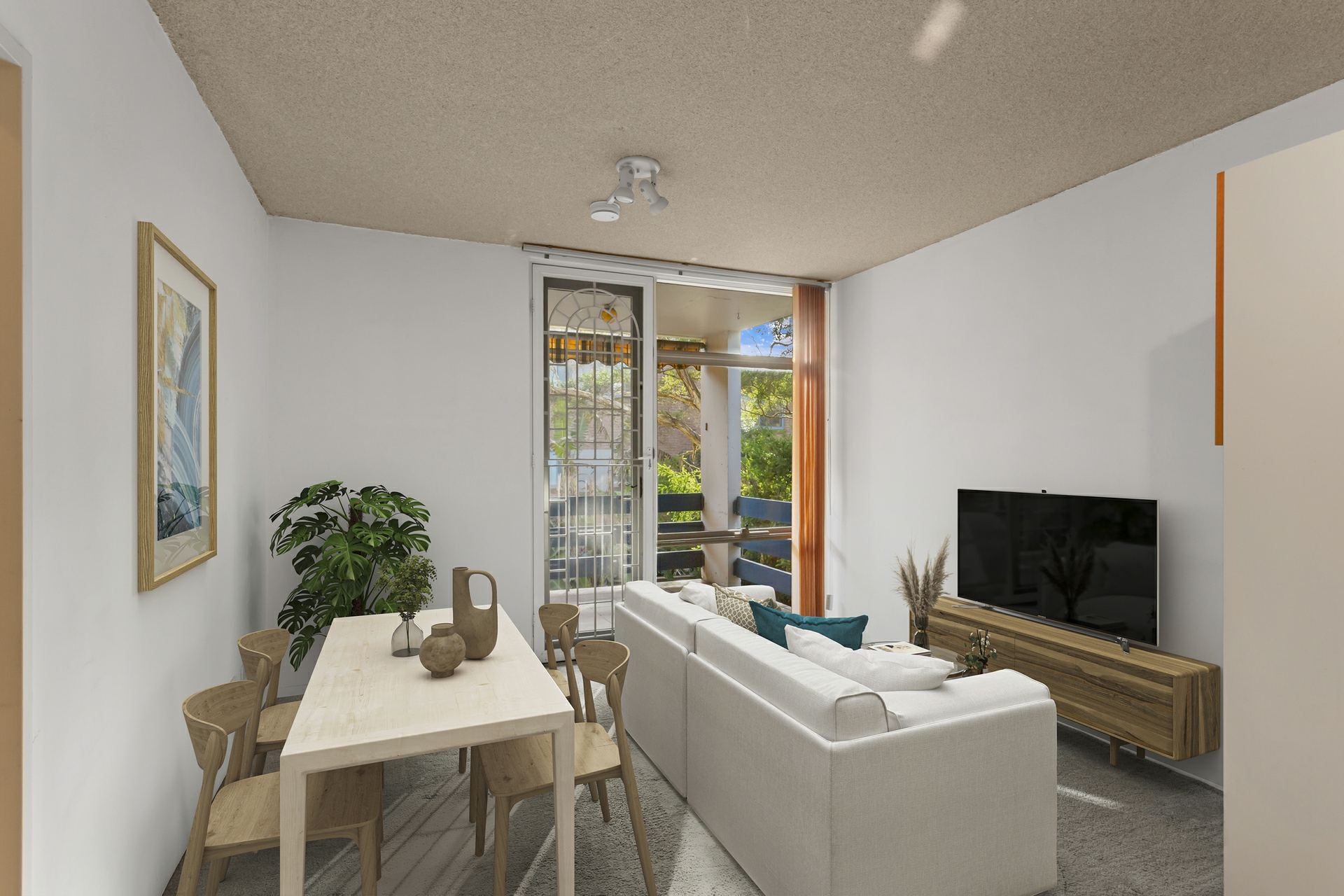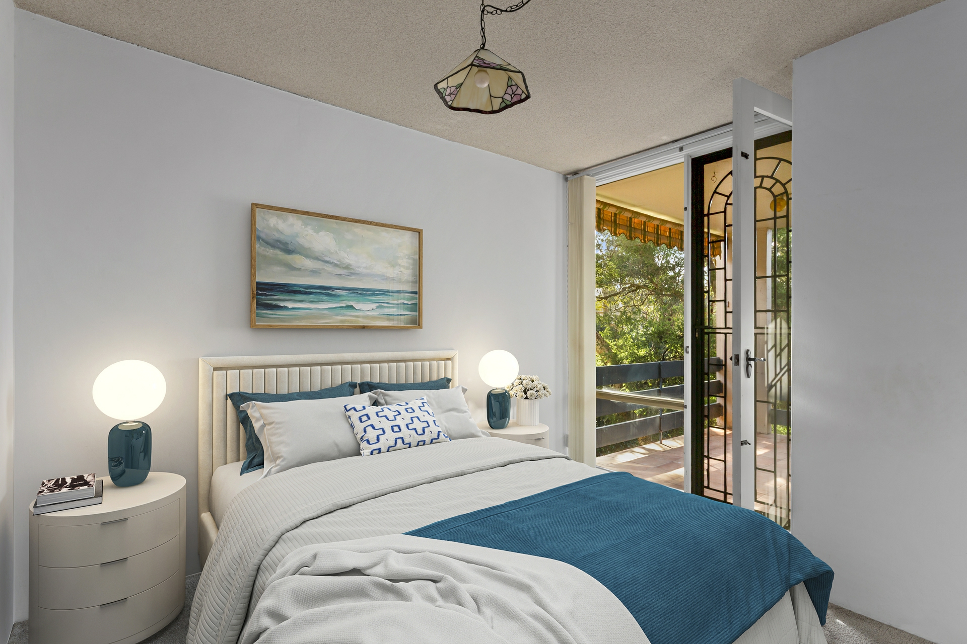 Inside, the well-maintained layout includes a bright living area and a functional open-plan kitchen. Two generously sized bedrooms, both with built-in wardrobes, offer excellent accommodation, with the main bedroom opening directly onto the balcony.