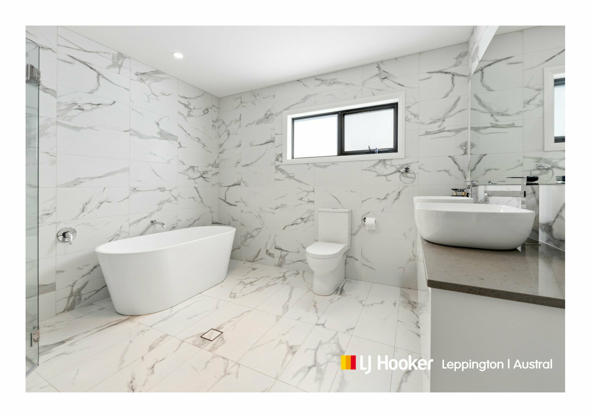 - Stylish bathrooms tiled floor to ceiling with freestanding bath, double basin and floating vanity