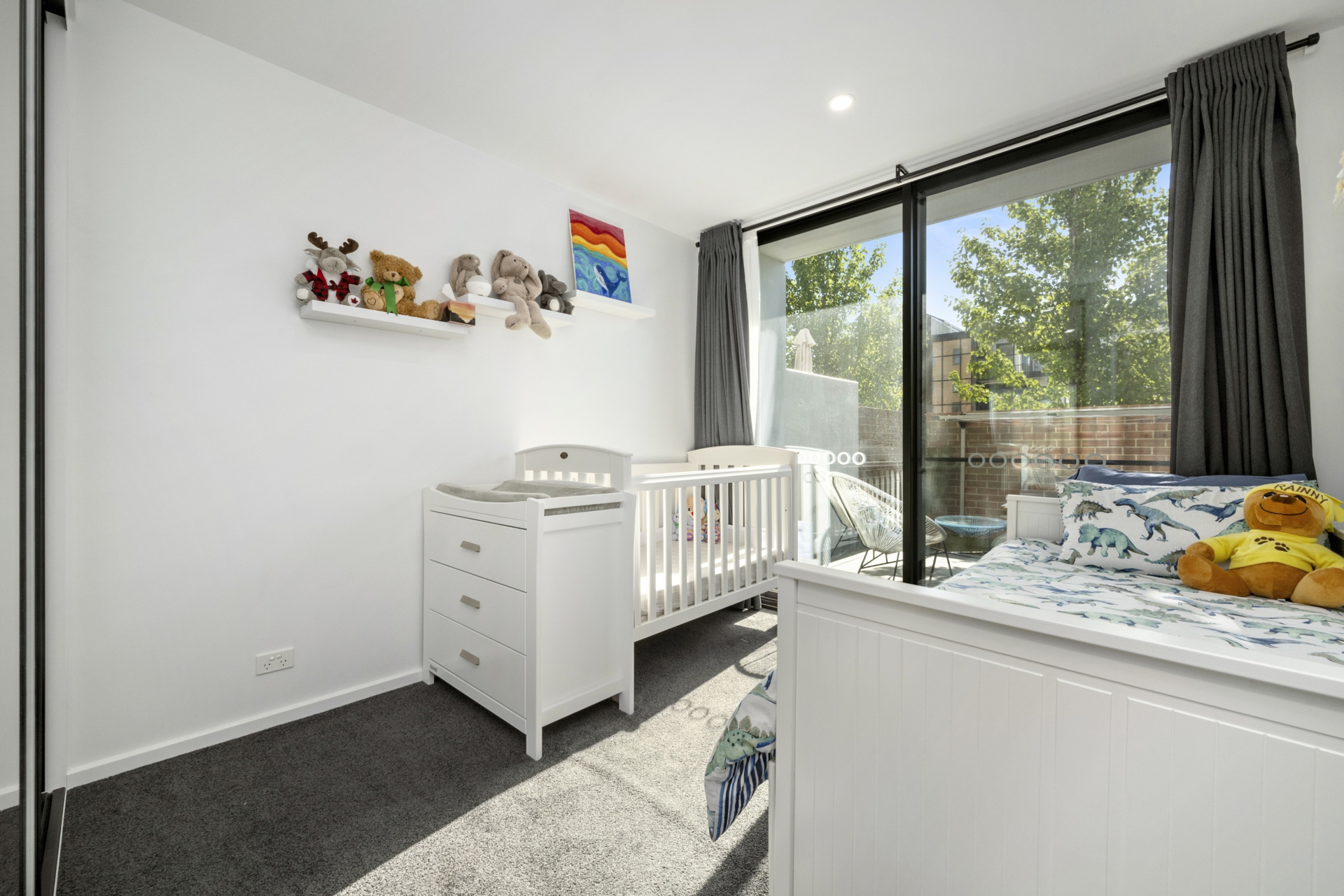 The open-plan living and dining area is bathed in natural light, seamlessly connecting to a fantastic courtyard framed by mature trees, an ideal space for children, pets, or hosting gatherings. The oversized master bedroom features its own balcony, mirrored built-in wardrobes, and ensuite with heated flooring and floor-to-ceiling tiles. The second bedroom also offers ample storage, and the home is designed for year-round comfort with two split systems ensuring the perfect climate across all seasons.