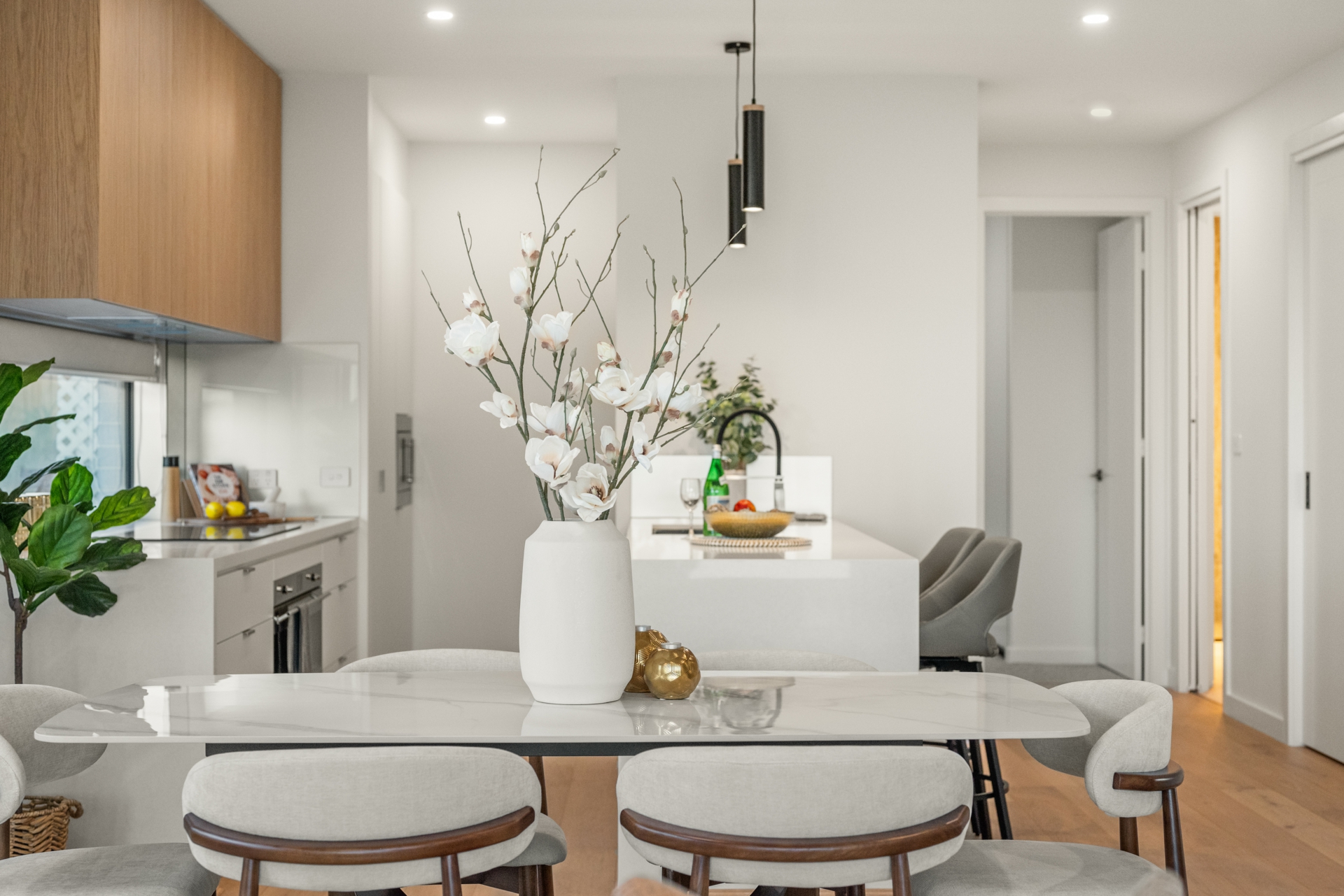 Spanning an impressive 205sqm of internal living, Residence 6 stands proudly toward the front of the development, basking in prized northern orientation and framed by 124sqm of landscaped gardens. The grand double-storey design delivers four generous bedrooms and three exquisite bathrooms, perfectly balancing flexibility with luxury.