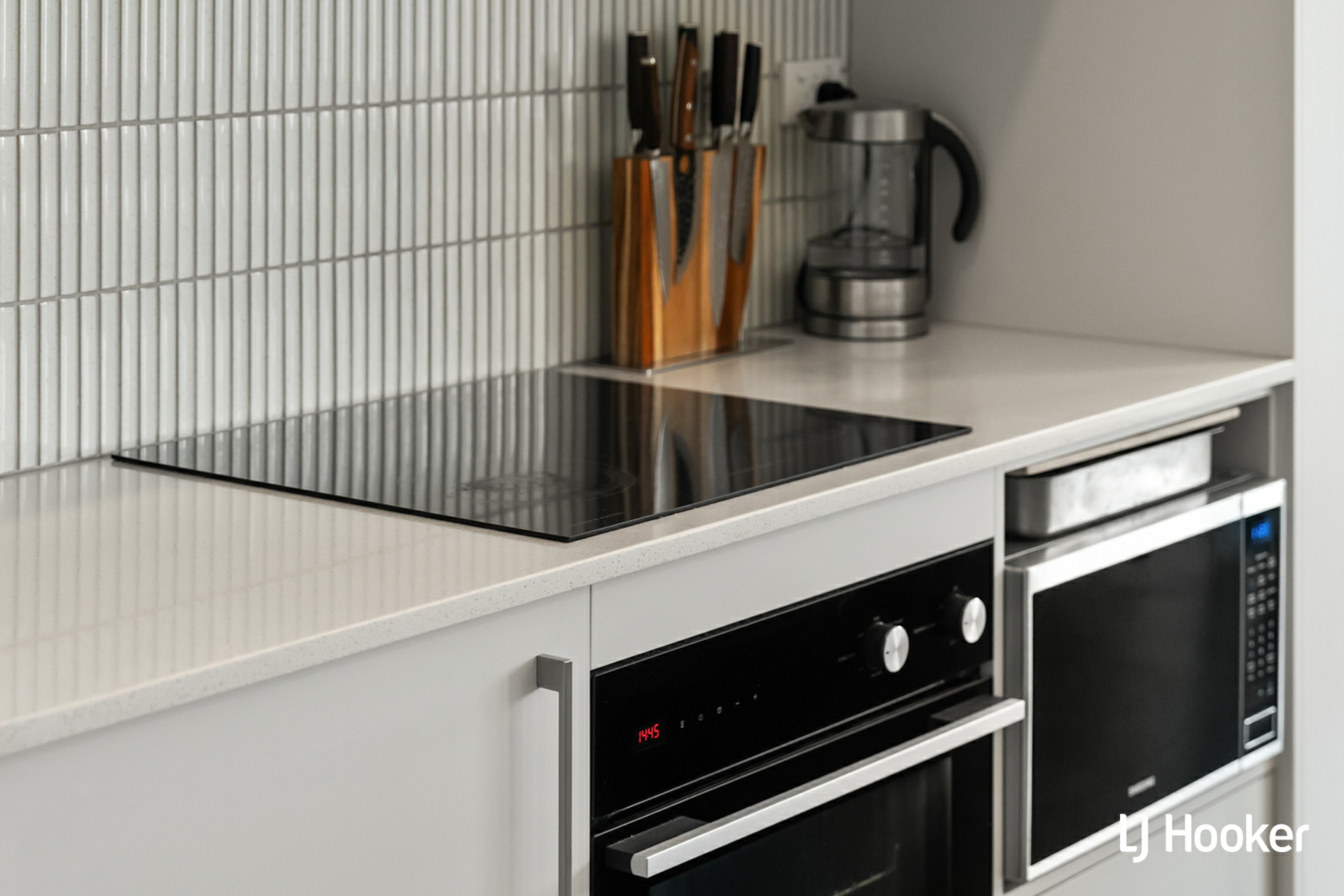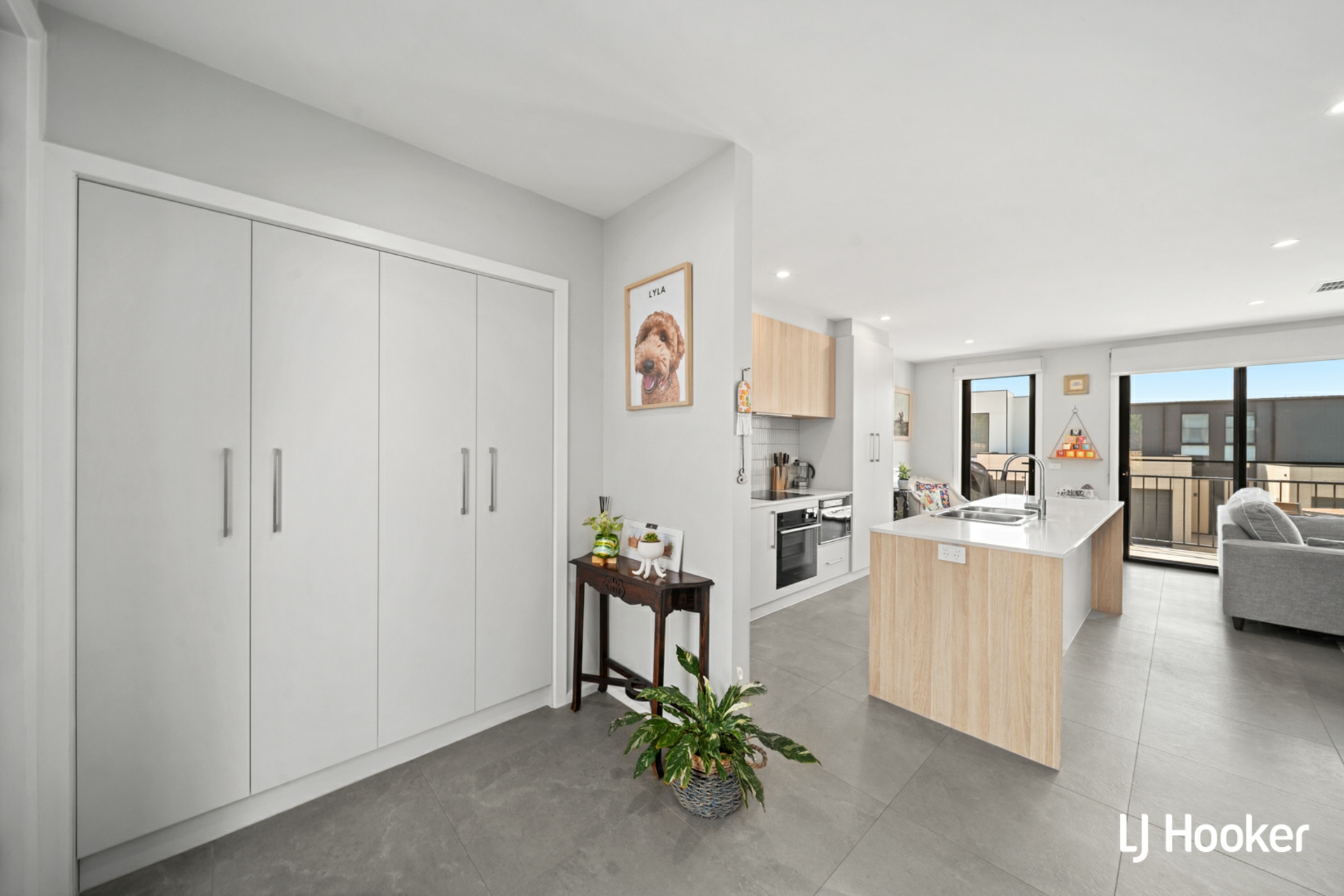 The kitchen is well appointed with stone benchtops, stainless steel appliances, a breakfast bar, and generous storage, offering both functionality and clean modern style.