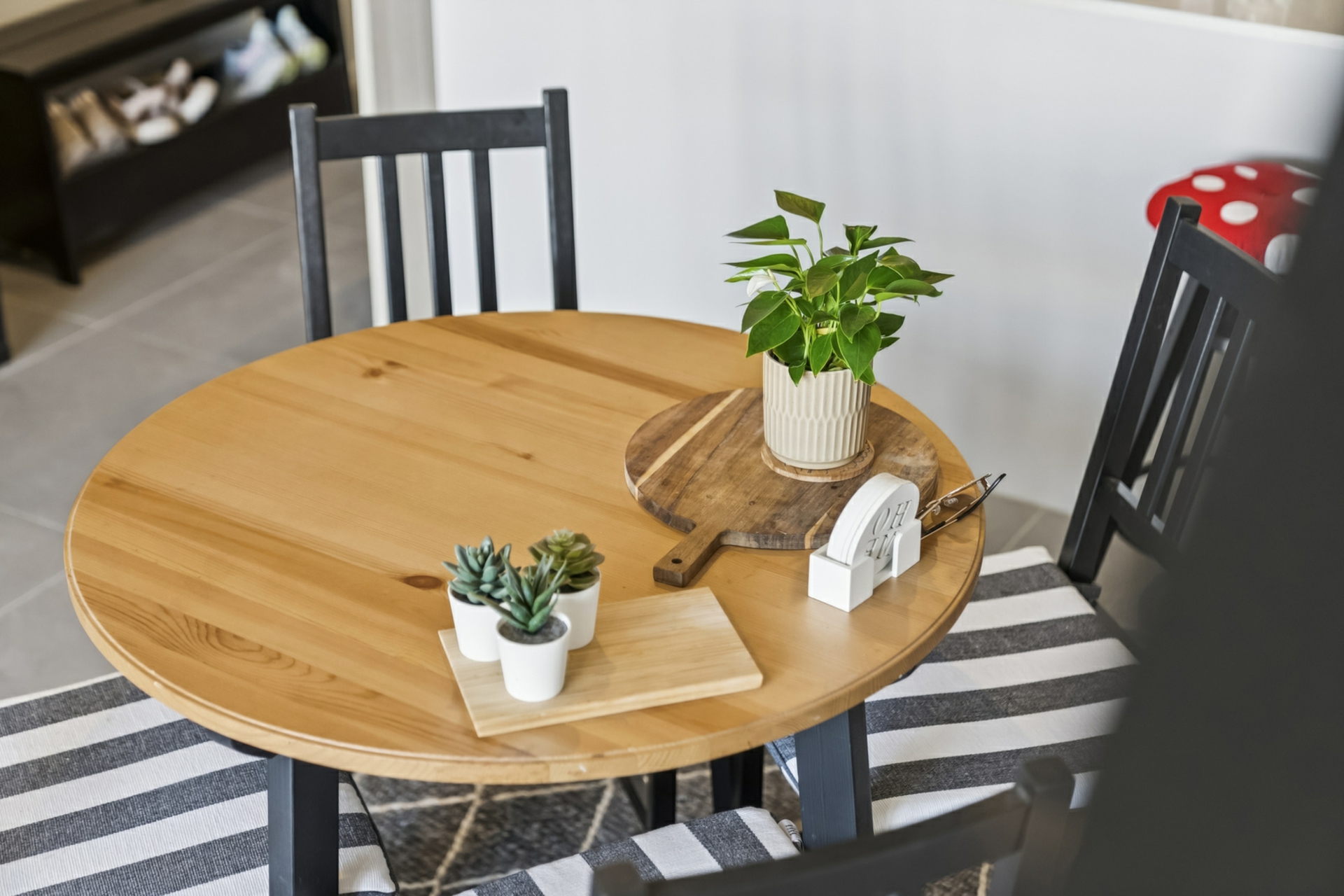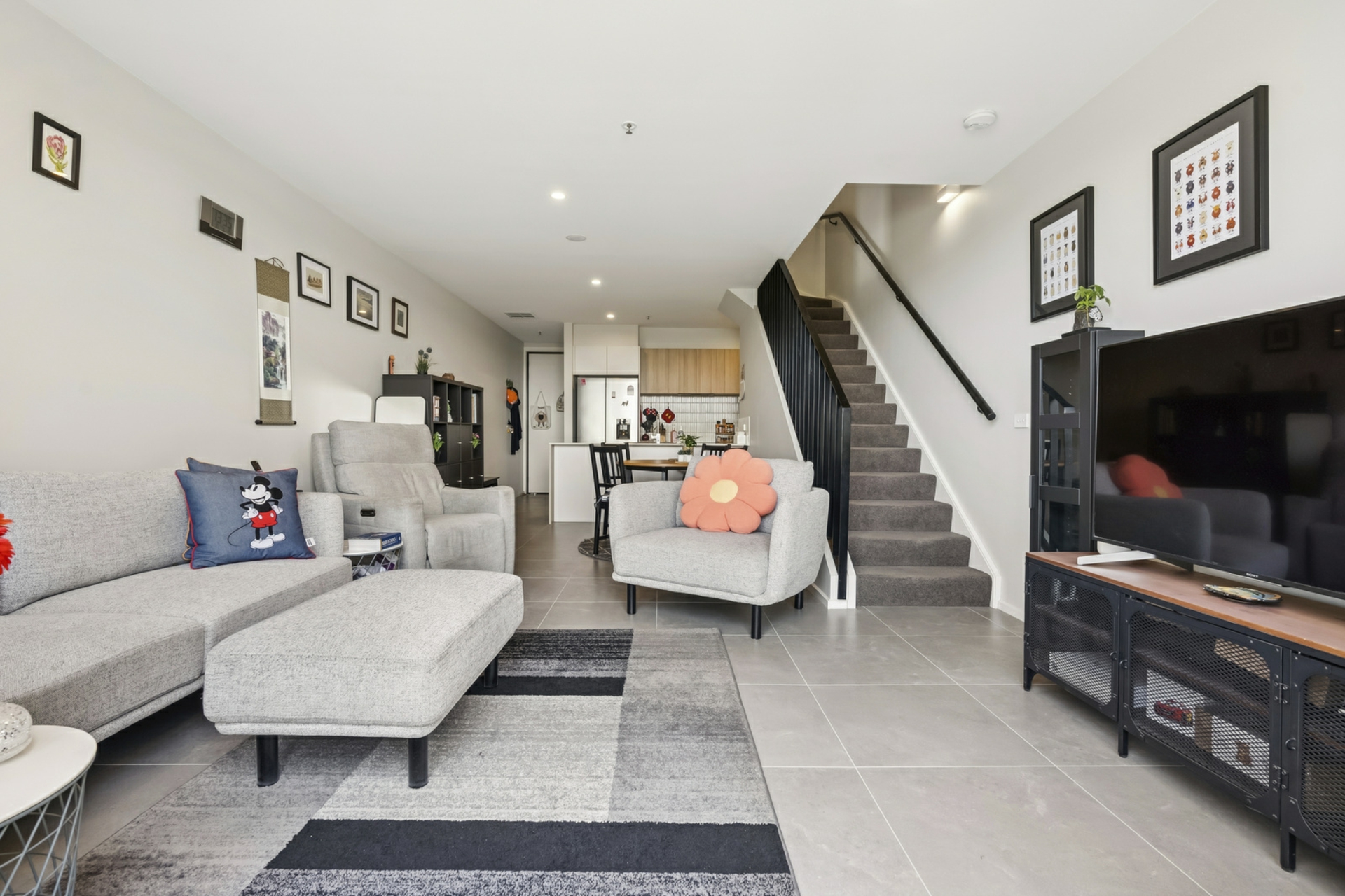 Tiled living areas and carpeted bedrooms