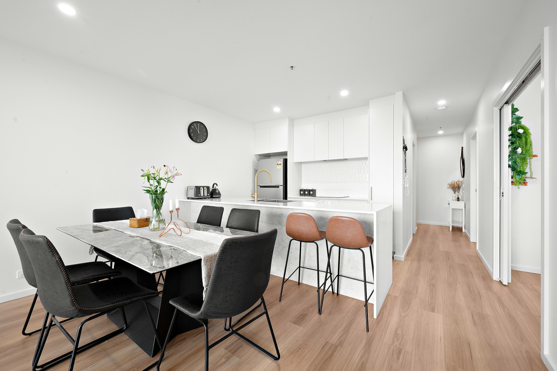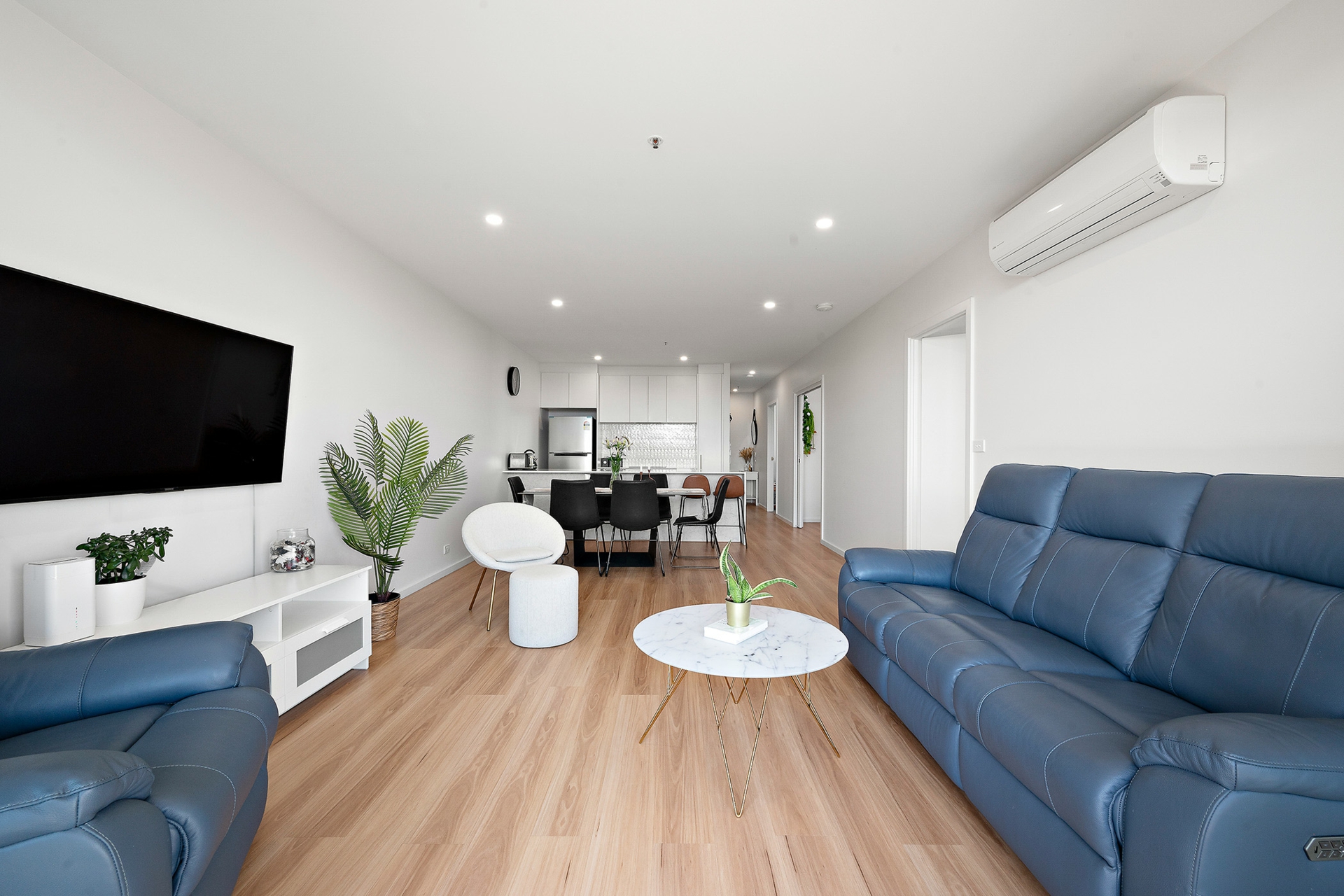 Step into a spacious and elegant living area, carefully designed to balance comfort and style. The large living space, adorned with timeless timber flooring, creates a seamless flow throughout the open-plan layout. Ideal for both relaxation and entertainment, this residence is a testament to modern luxury.