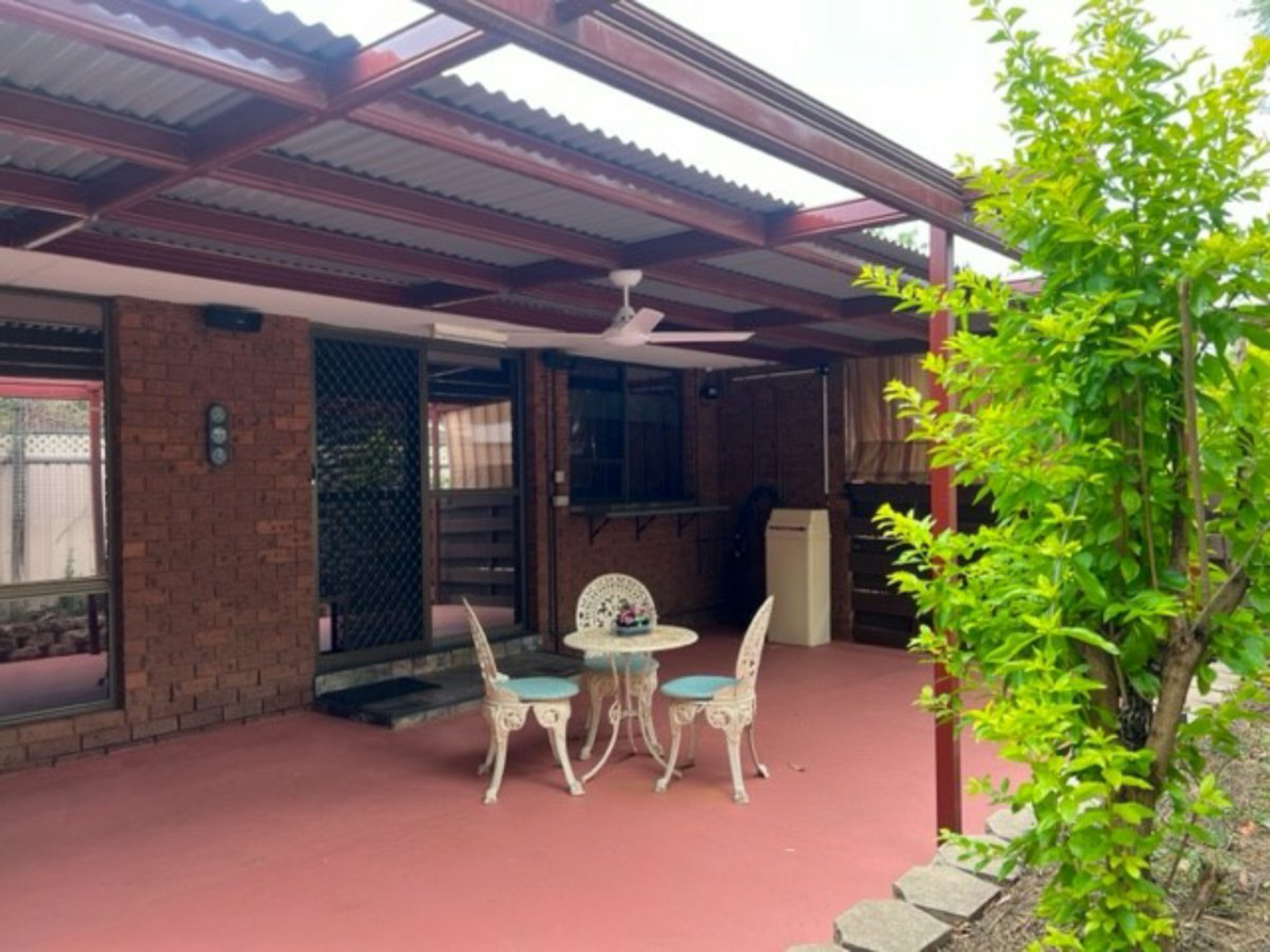 The front entry patio showcases terra cotta paving right to the roadside, an established landscaped garden and attractive exterior blinds for ultimate privacy.