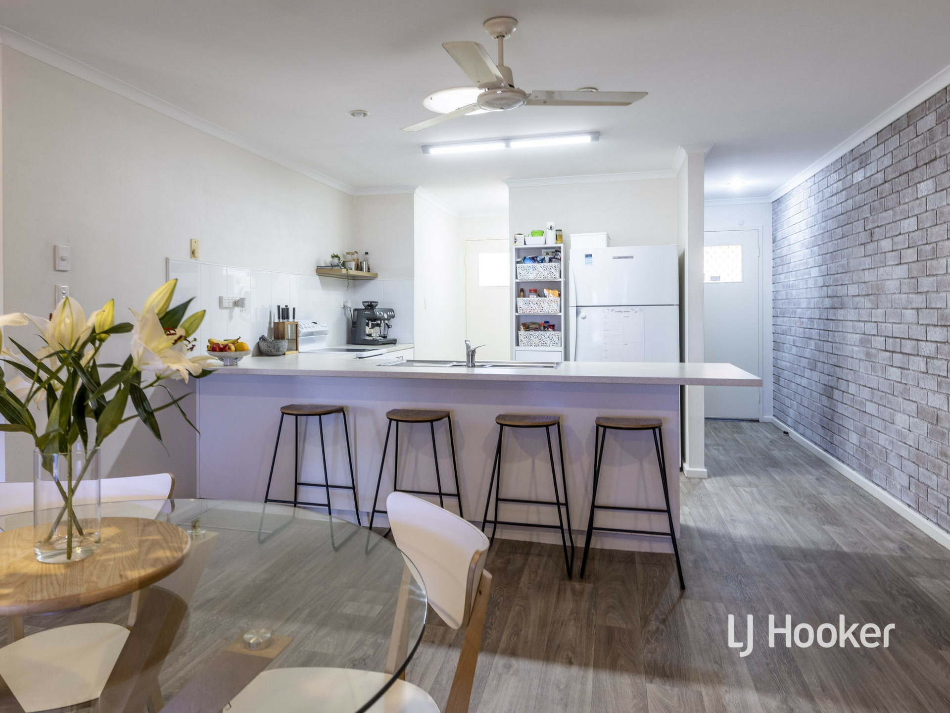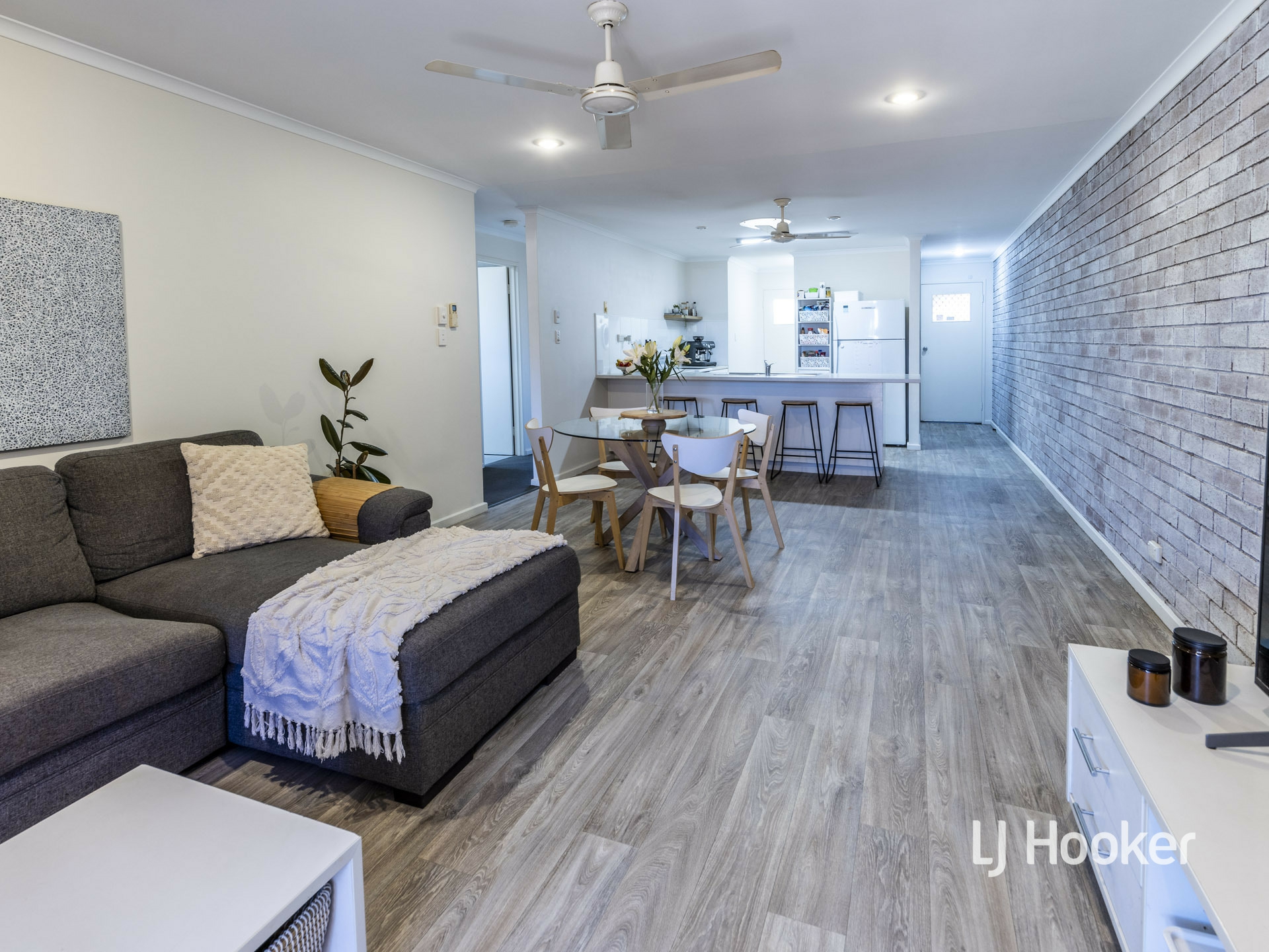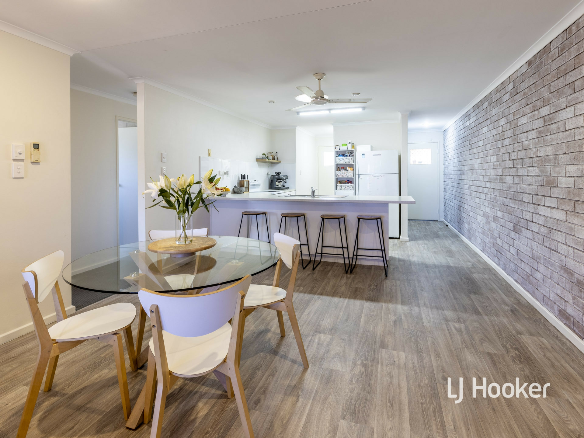 Eye catching timber look, vinyl floor add a svelte look to the living areas. Fresh curtains and whitewash shading to an exposed brick feature wall looks very classy.