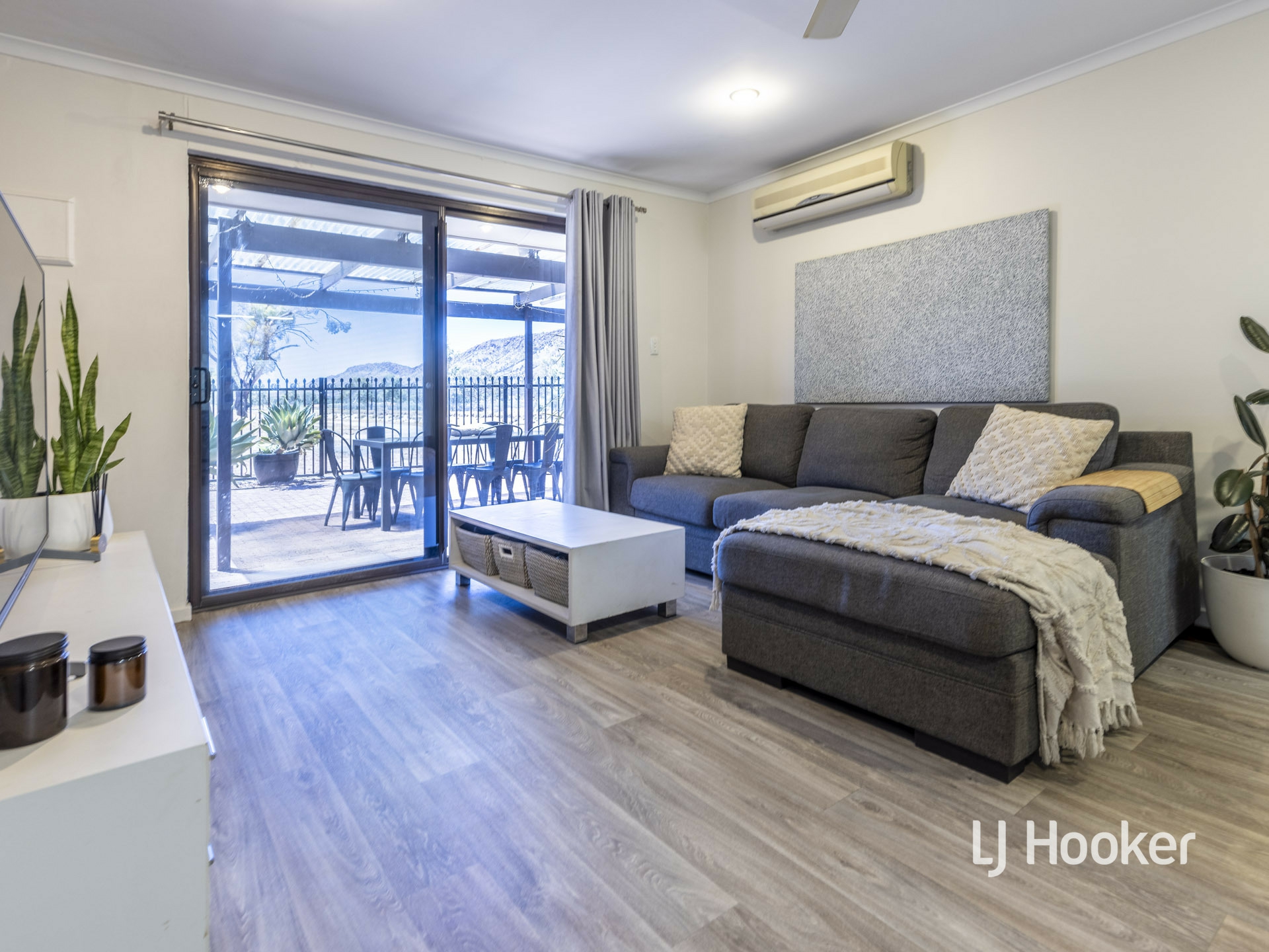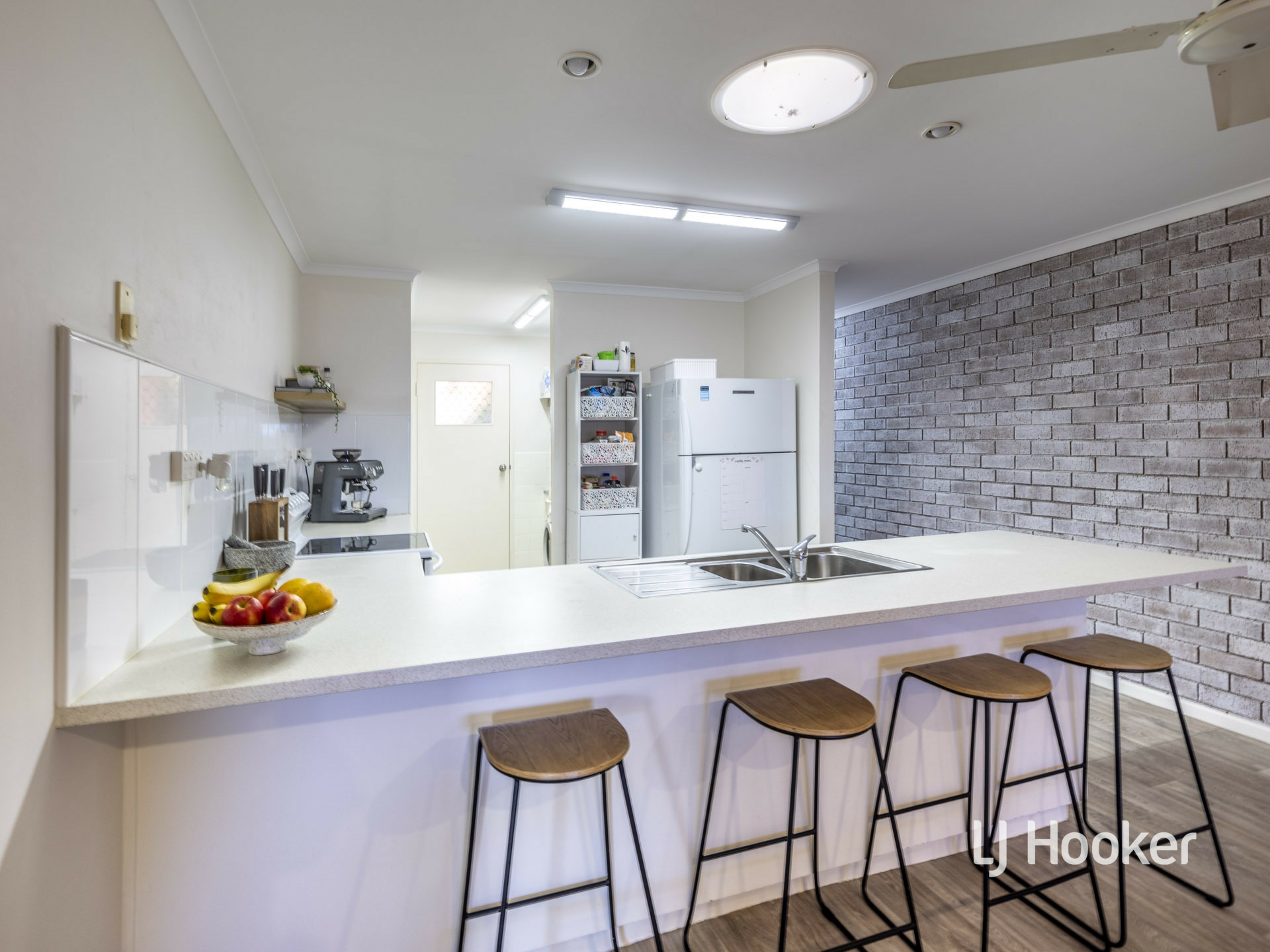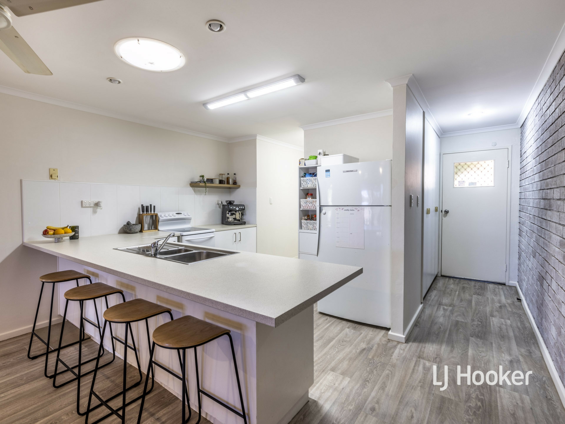 Eye catching timber look, vinyl floor add a svelte look to the living areas. Fresh curtains and whitewash shading to an exposed brick feature wall looks very classy.
