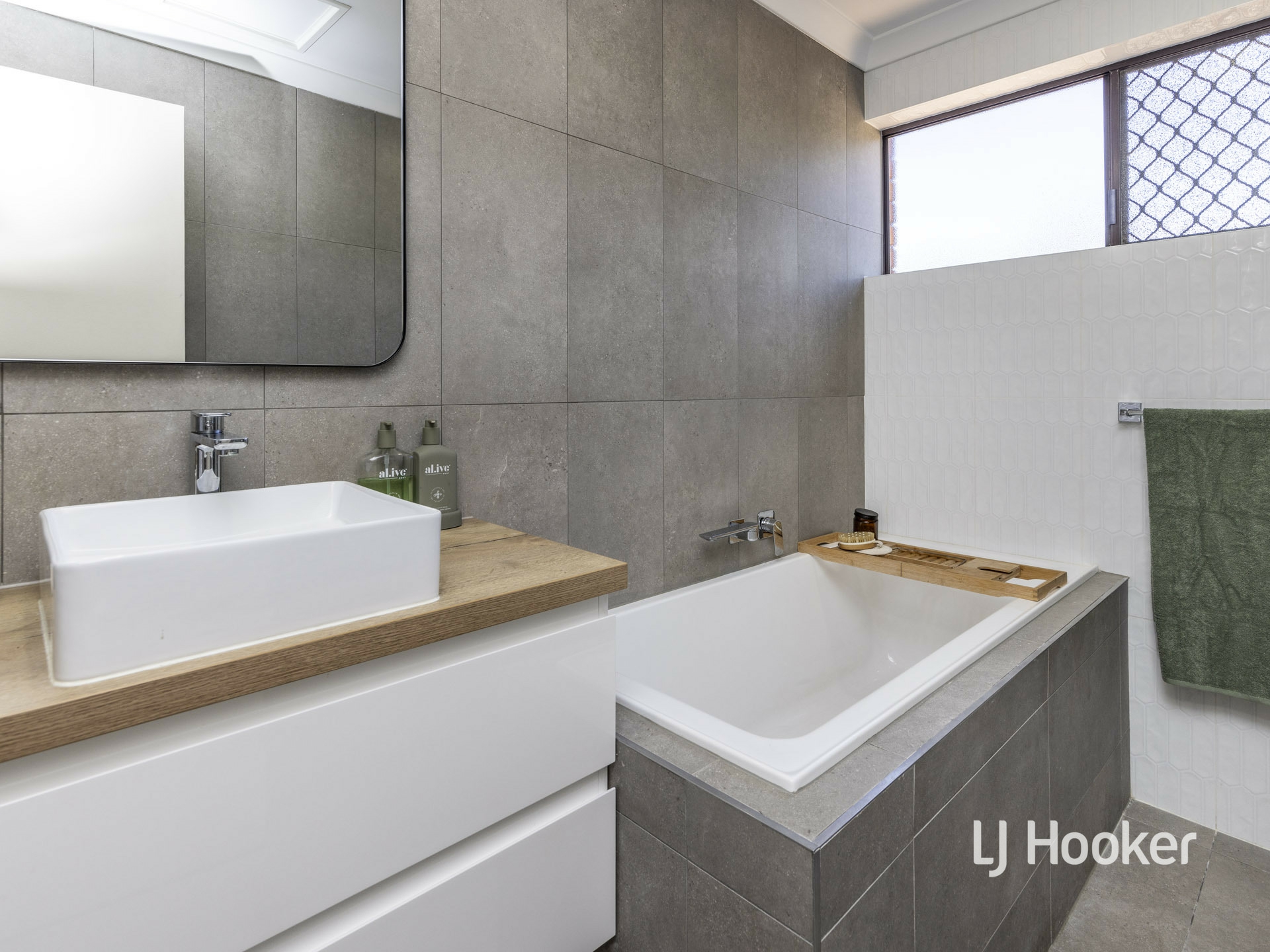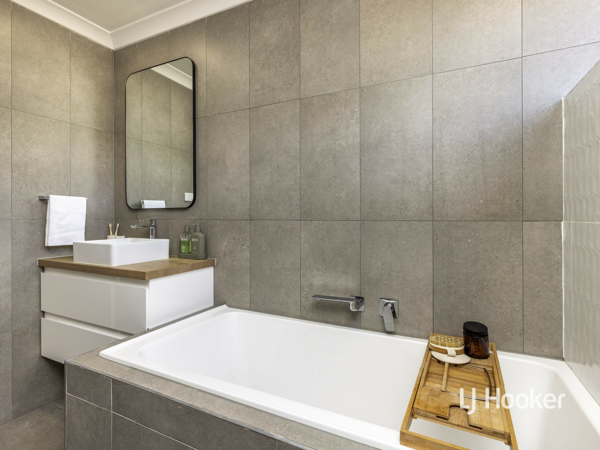 Contrasting designer tiling in the bathroom compliment the deep bathtub, the new vanity and separate shower. Even the toilet is new.