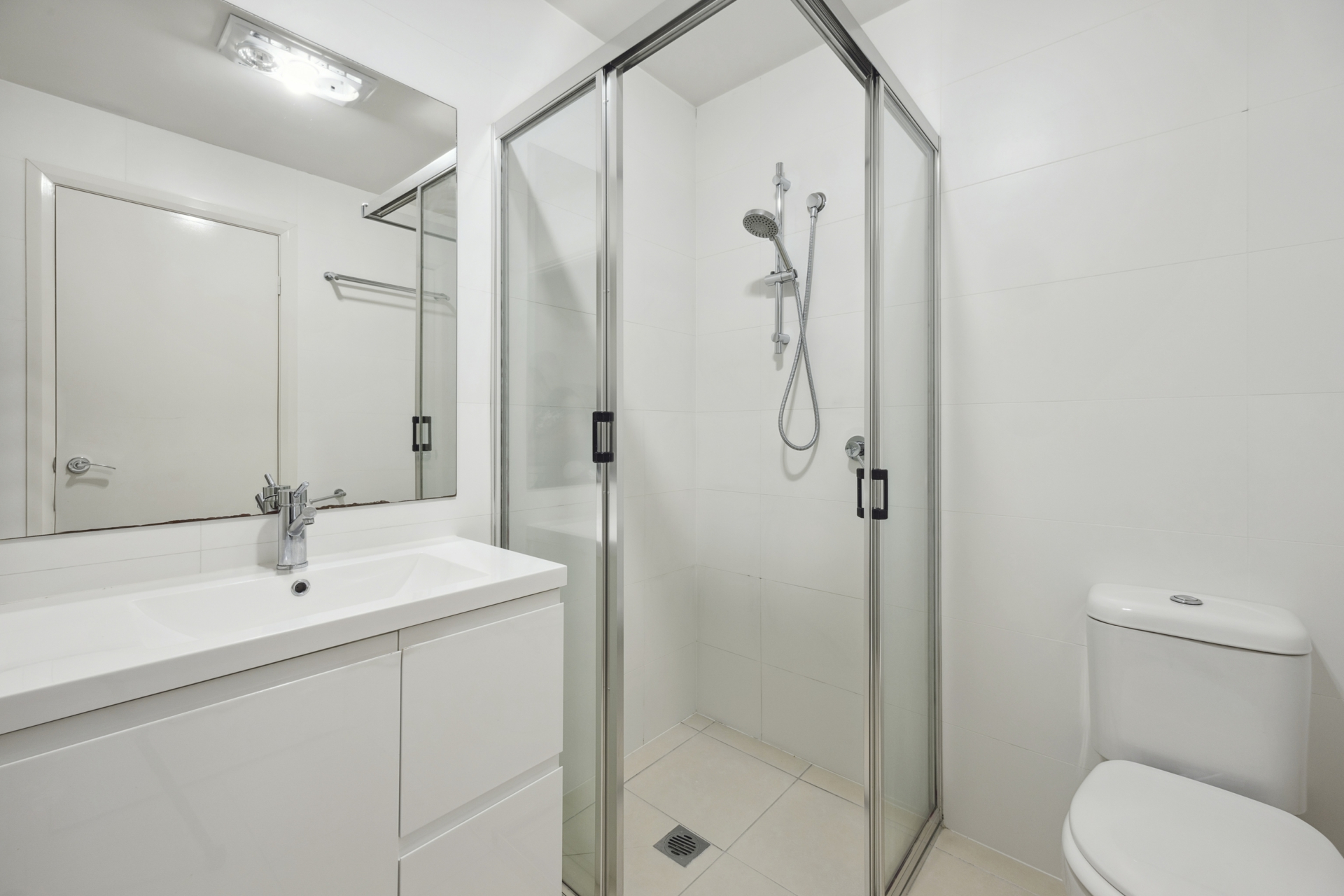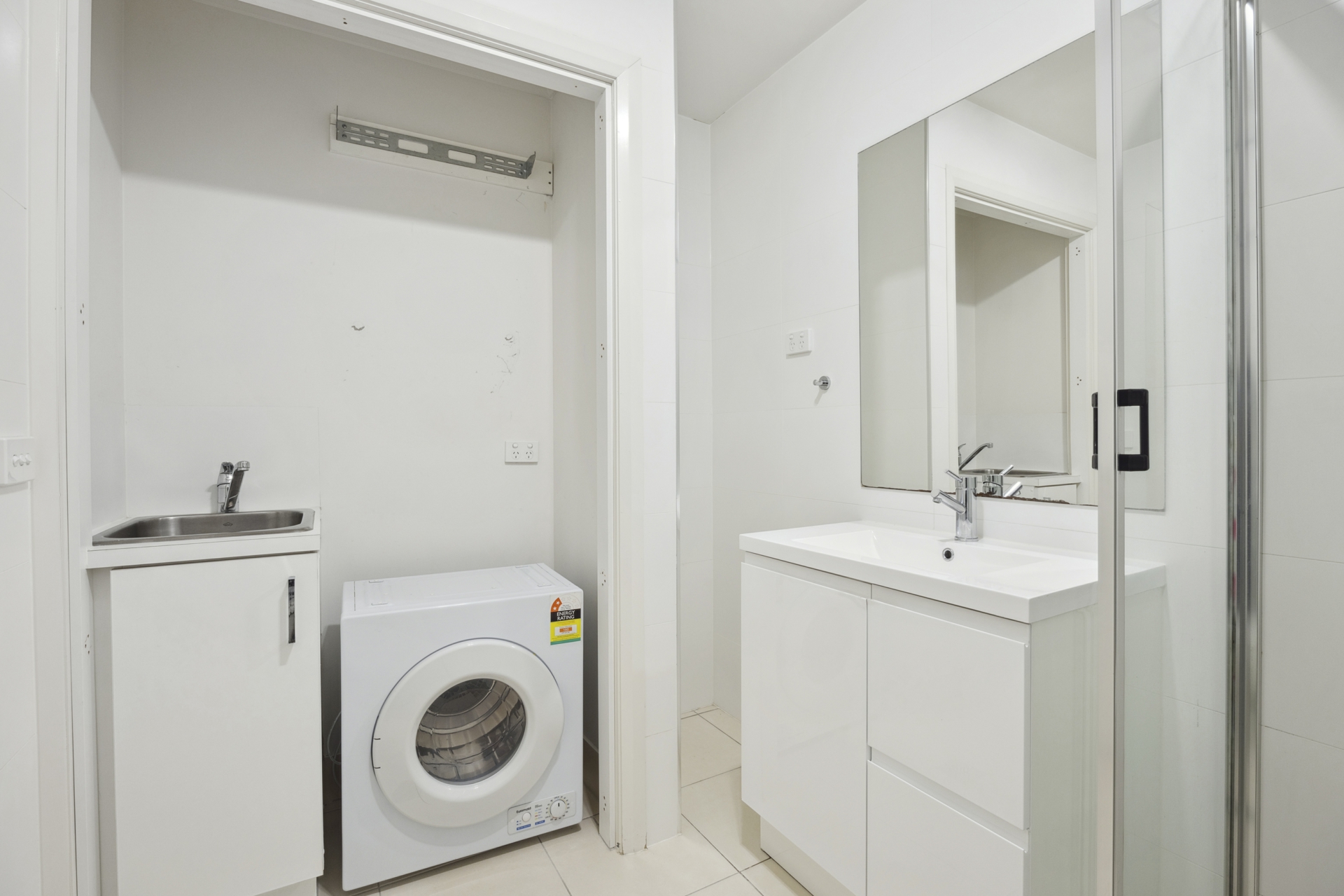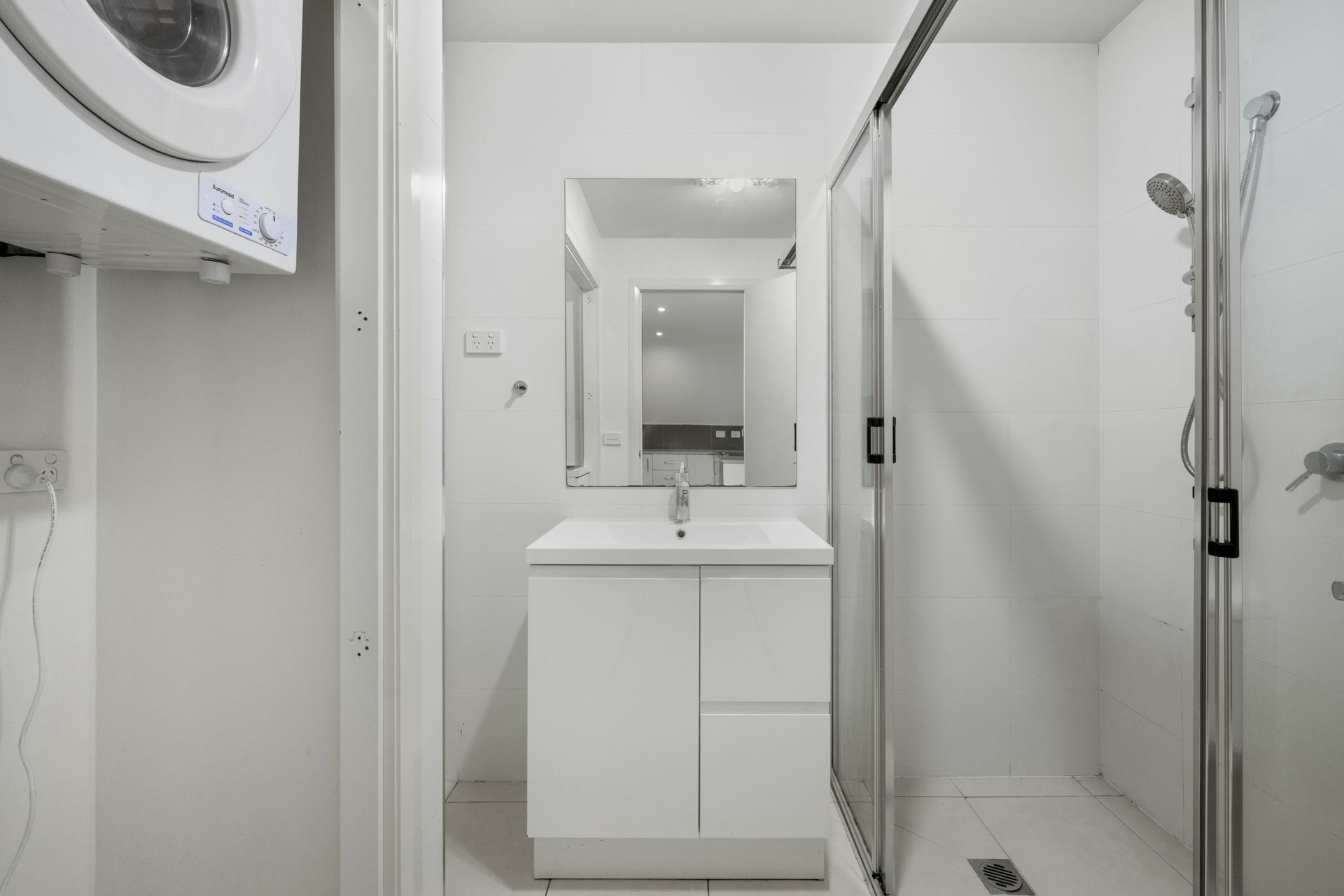 - One Bathroom with shower and floor to ceiling tiles