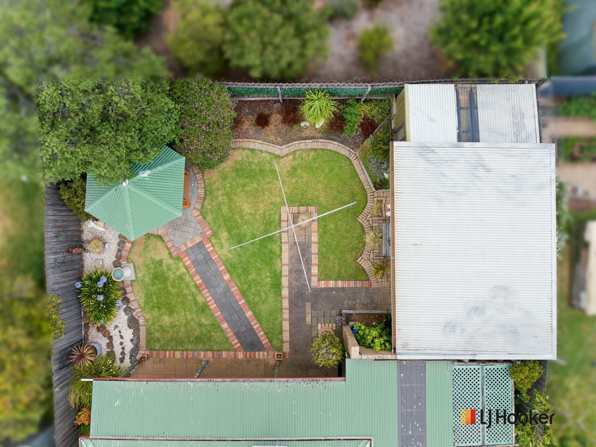 Tucked neatly to the side is a well-appointed workshop, designed to be both practical and visually cohesive with the rest of the yard. Whether used as a creative studio, storage space, or a serious workspace, it offers ample room, solid construction, and easy access without compromising the beauty of the outdoor area
