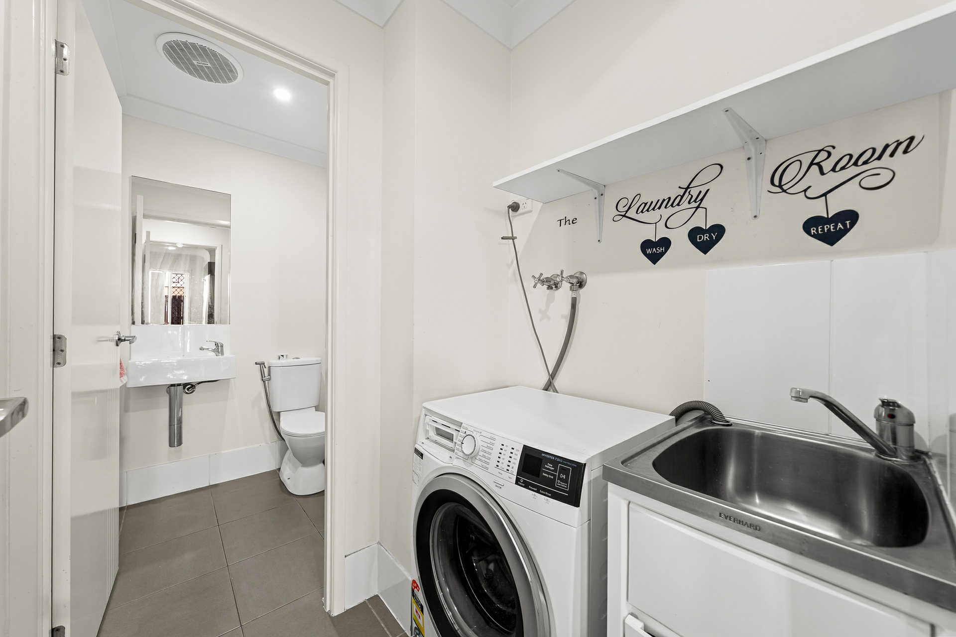 Upstairs, the home offers three generous bedrooms, all well-sized and beautifully presented. The master bedroom includes a private ensuite and built-in robe, while the remaining two bedrooms are serviced by the main bathroom. With two bathrooms in total and a separate laundry conveniently located downstairs, the floorplan has been thoughtfully designed for functionality and comfort.