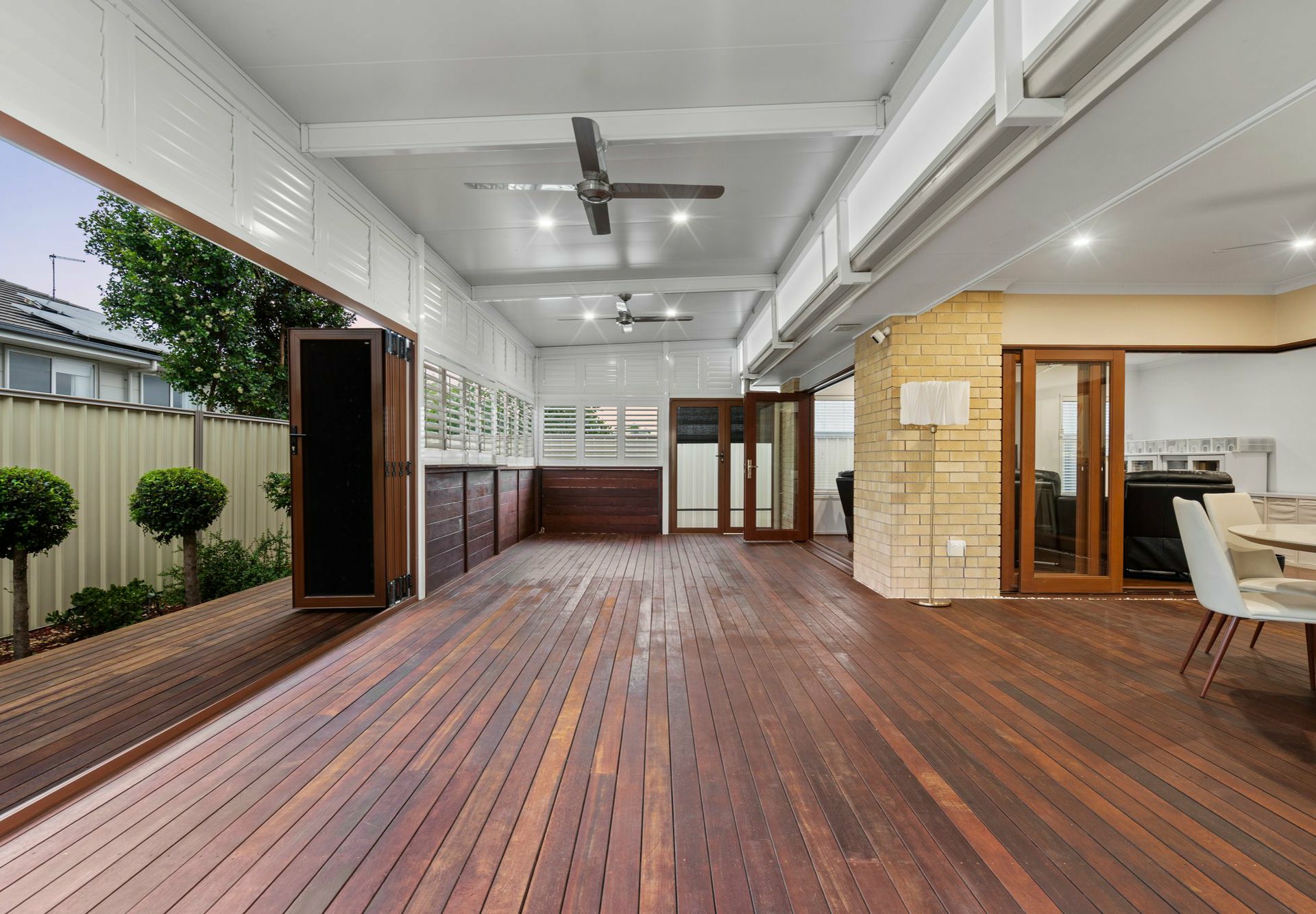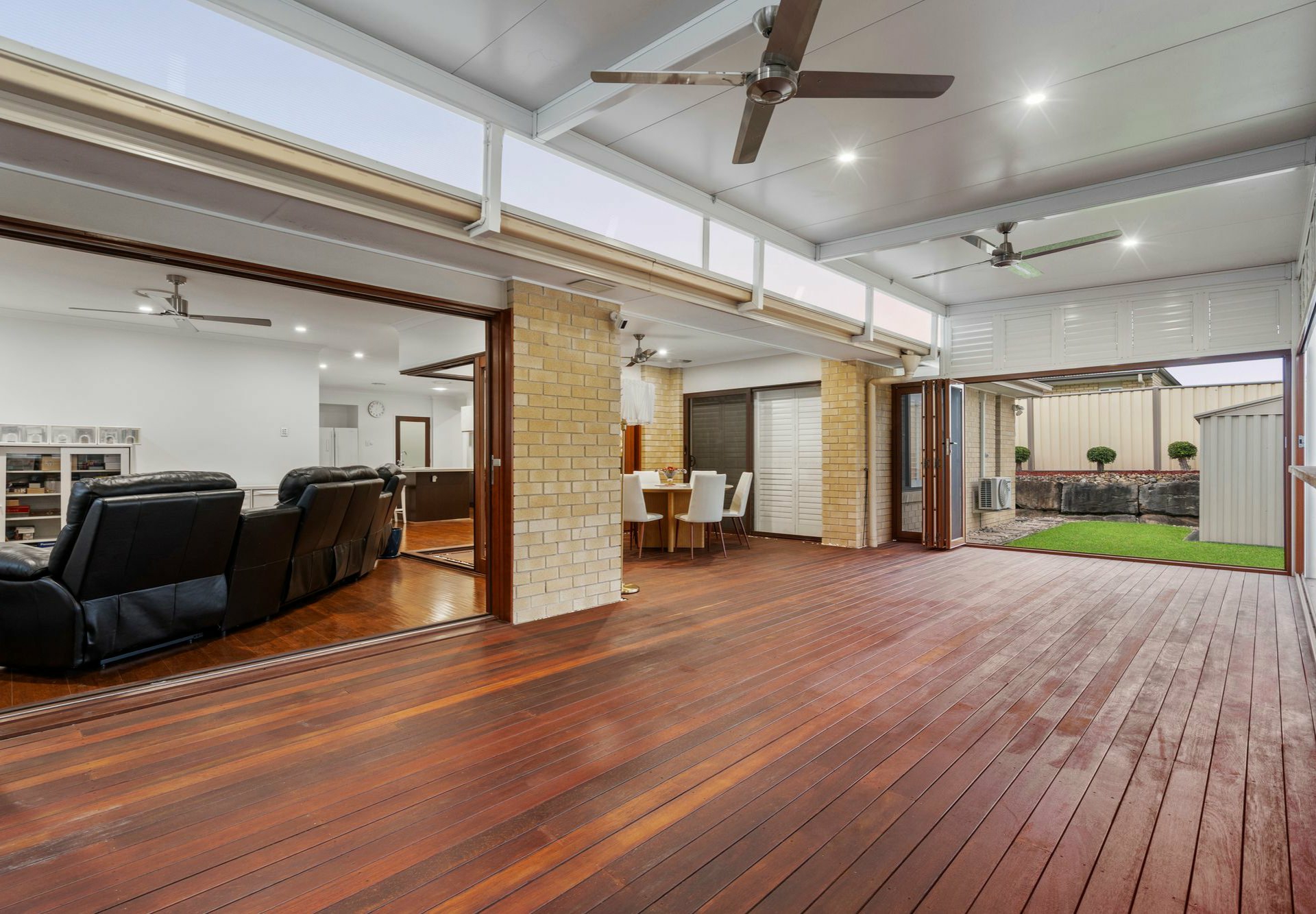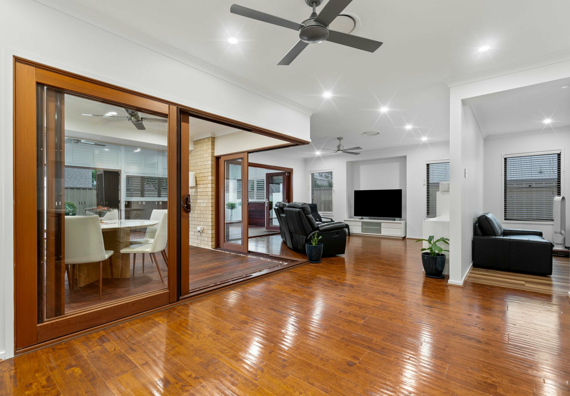 - Huge, fan-cooled covered timber deck with bi-folds opening out to a grassy backyard