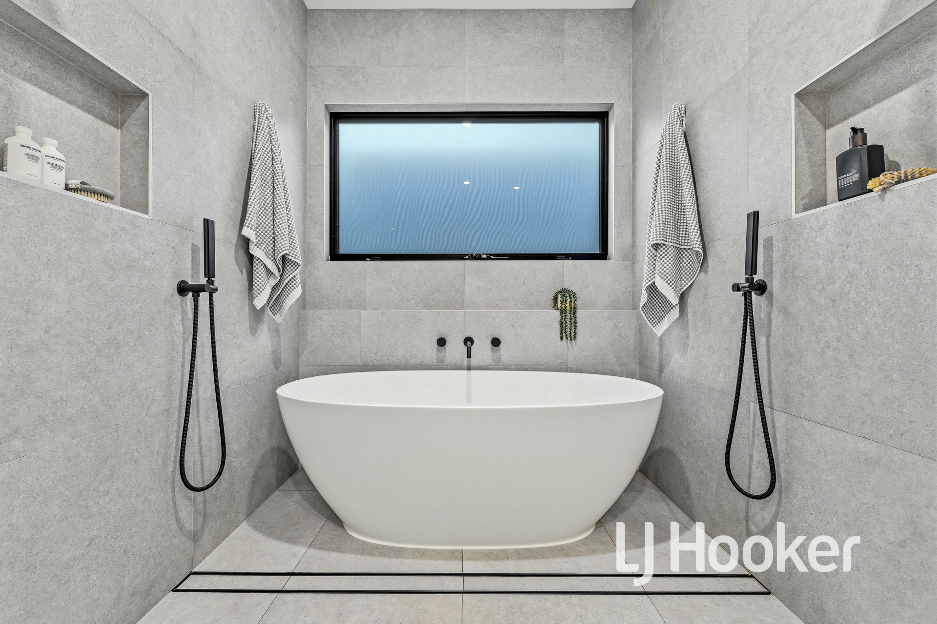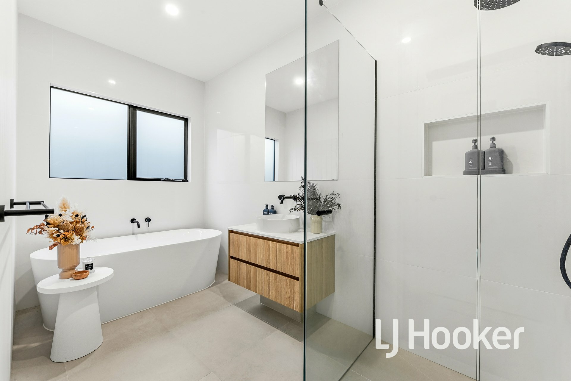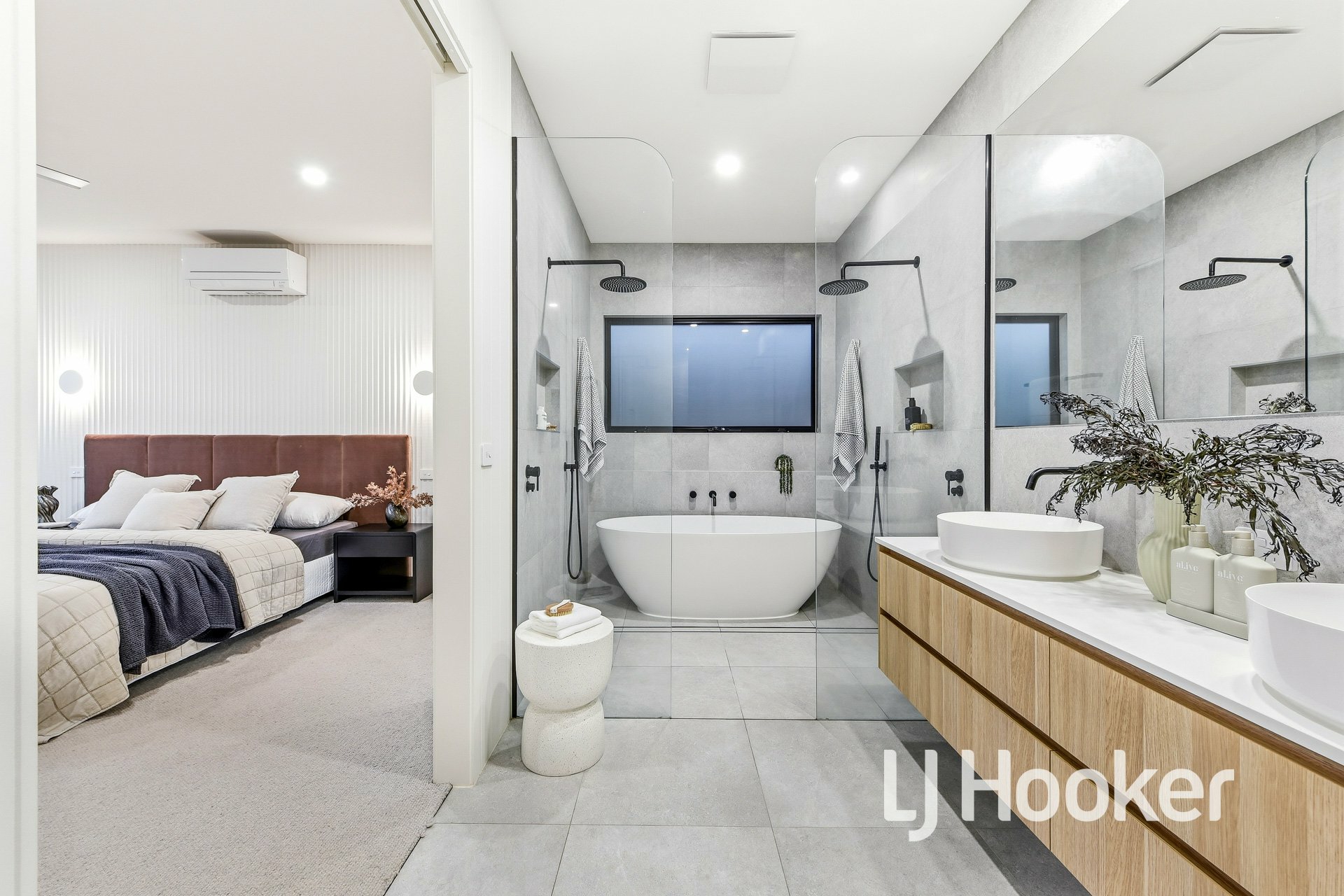 Stepping in you'll be immediately taken by the quality floating floors the hallway offers, a front formal living room allows for quiet enjoyment. The sprawling primary retreat offers a stunning feature wall, split system heating/cooling, ceiling fan, ensuite and walk in robe. The ensuite features a practical modern design with a stone benchtop, double basin, double shower with niches, bath, and toilet. An oversized walk-in robe is perfect for large scale storage.