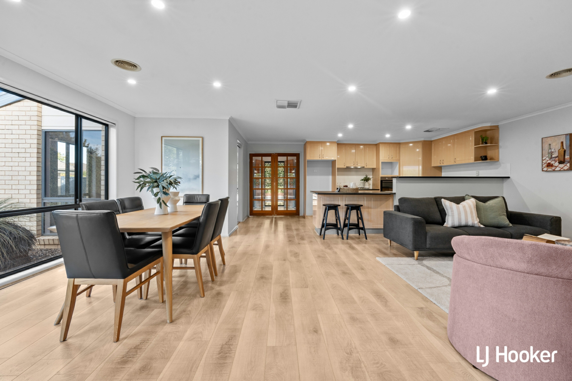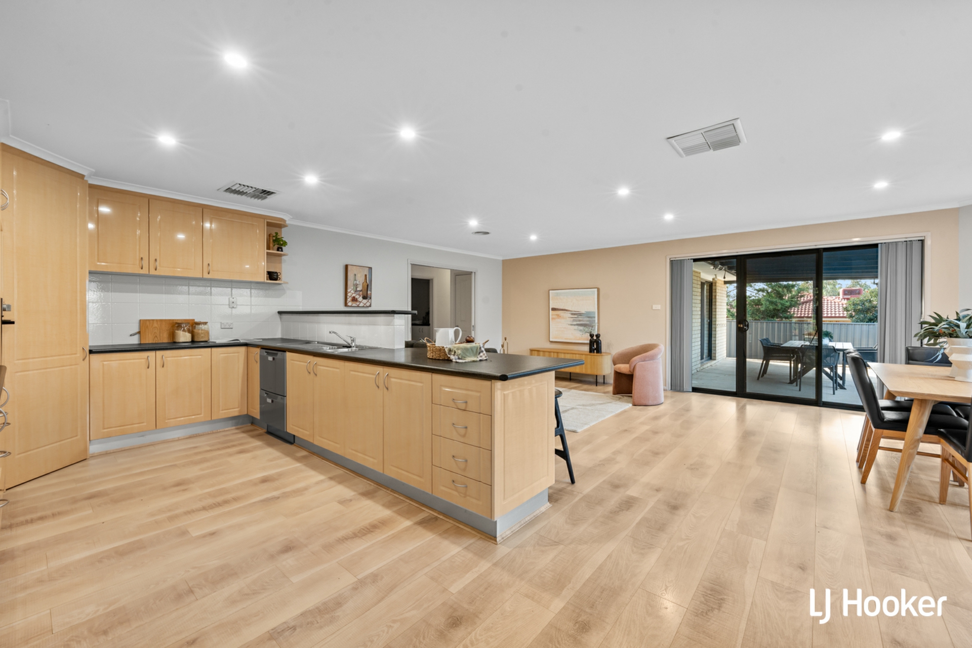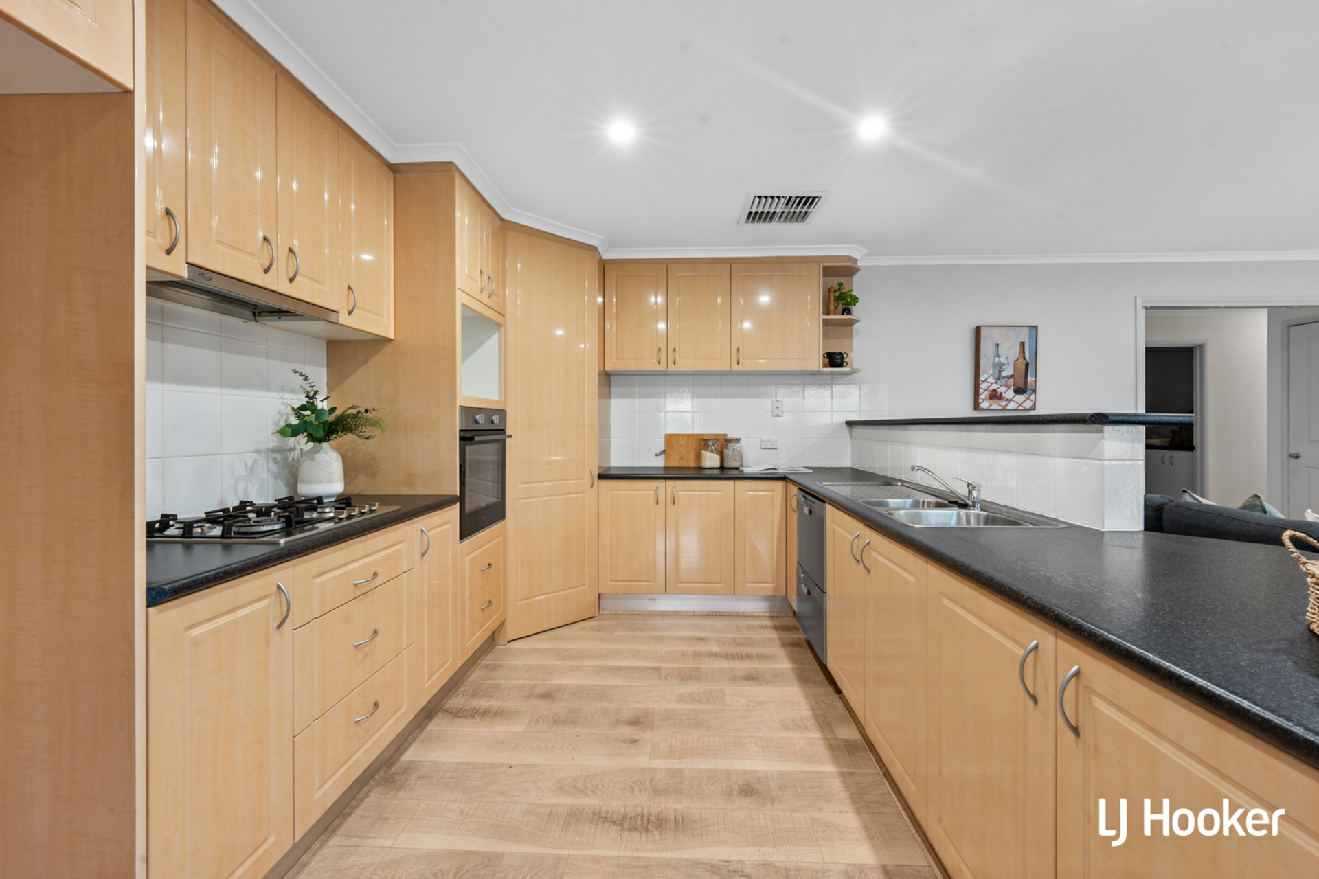 The kitchen is well-equipped with plenty of bench and cupboard space, complemented by stainless steel appliances including a two-drawer dishwasher and gas cooking. Overlooking the meals and family area, it creates a seamless hub for everyday living.