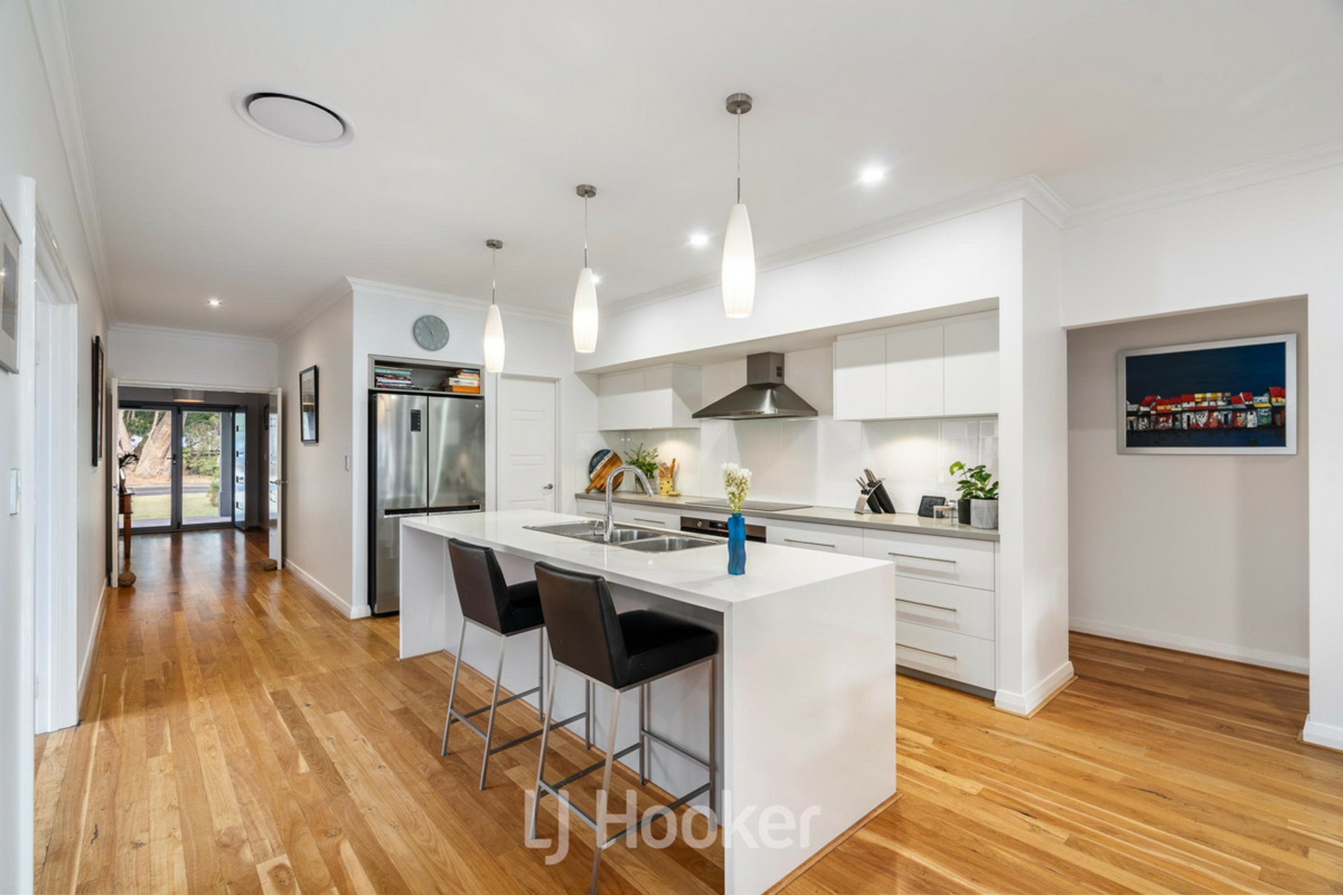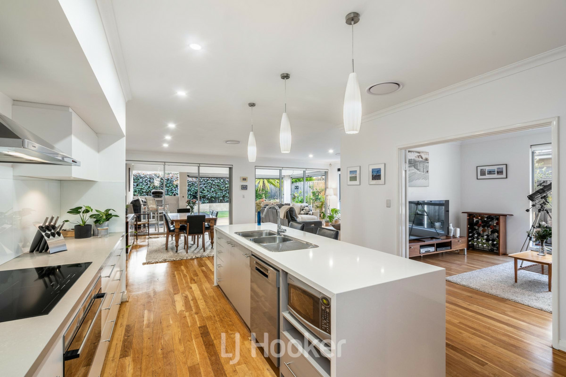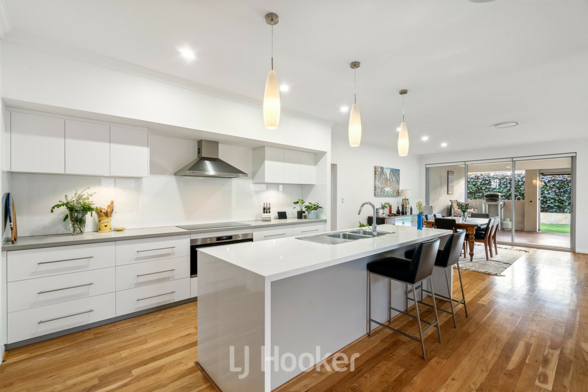 Stylish kitchen complete with Essastone benchtops, new cooktop & oven, dishwasher, double sink, abundant storage and elegant pendant lighting