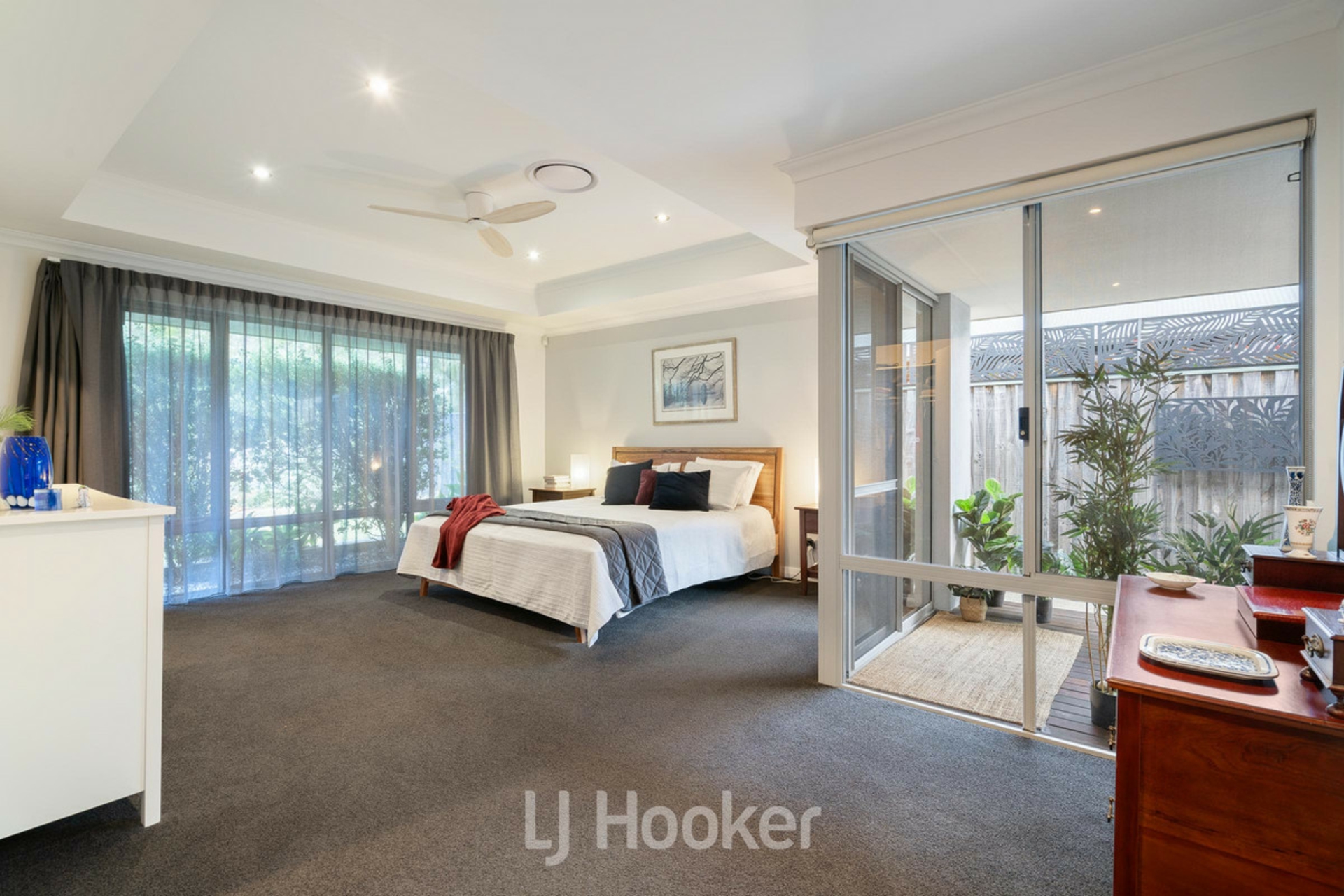 Spacious master suite with retreat area, ceiling fan, his and hers wardrobes and access to a private outdoor sitting space