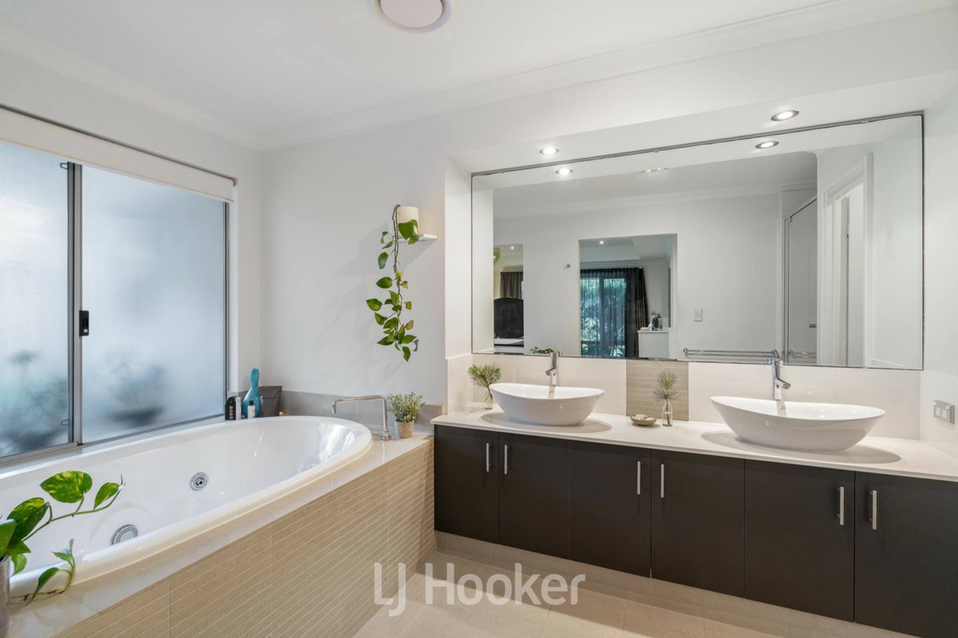 Luxurious ensuite featuring a large oval spa bath, twin vanities, oversized shower with rain head and separate toilet