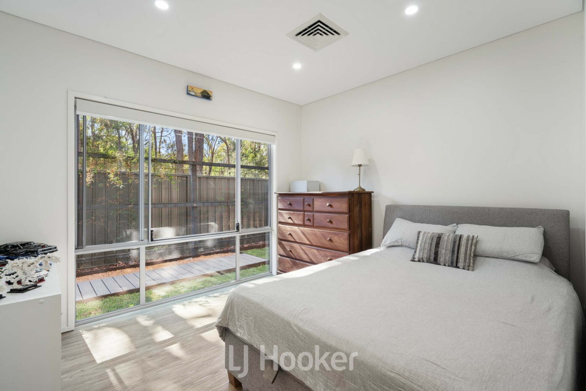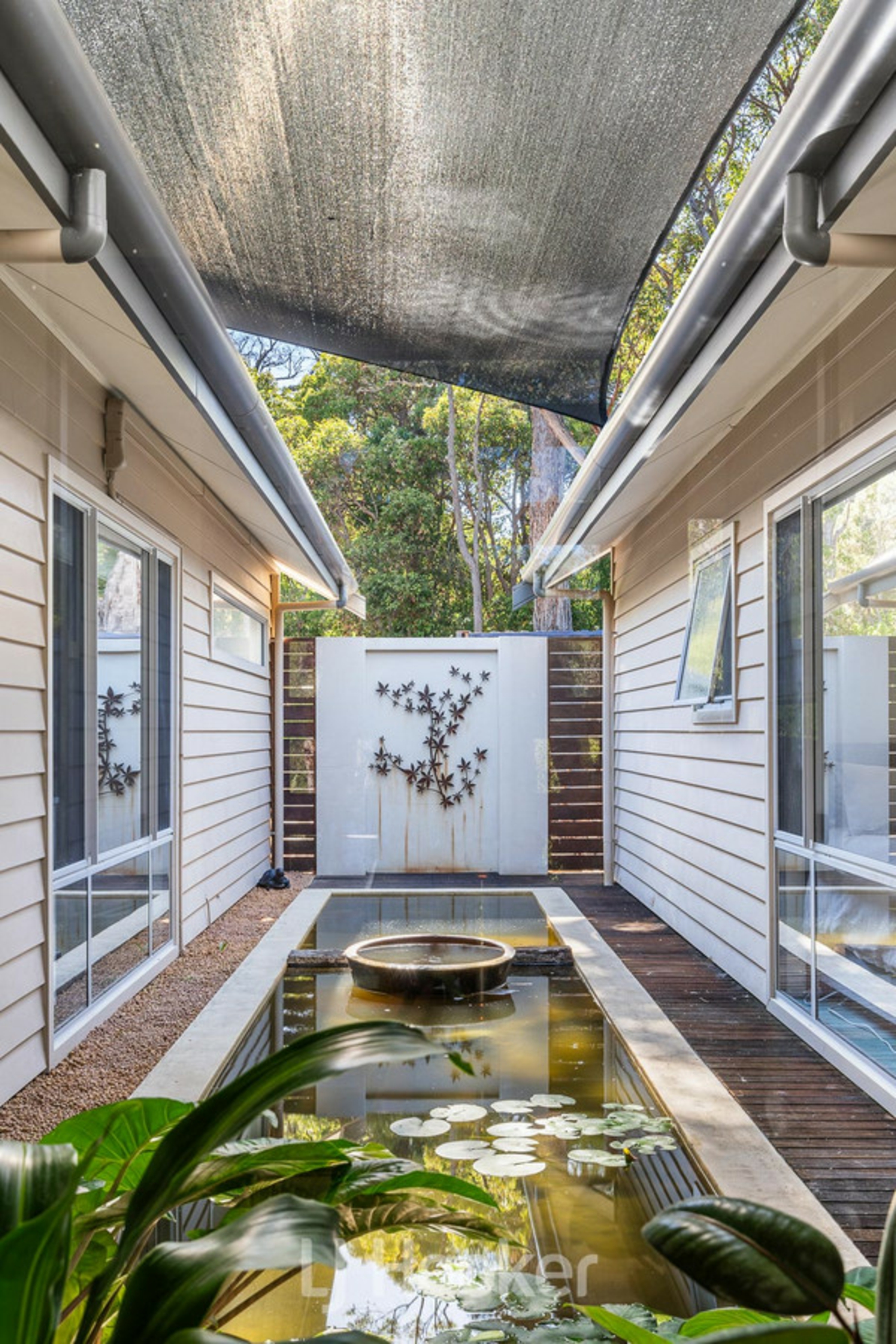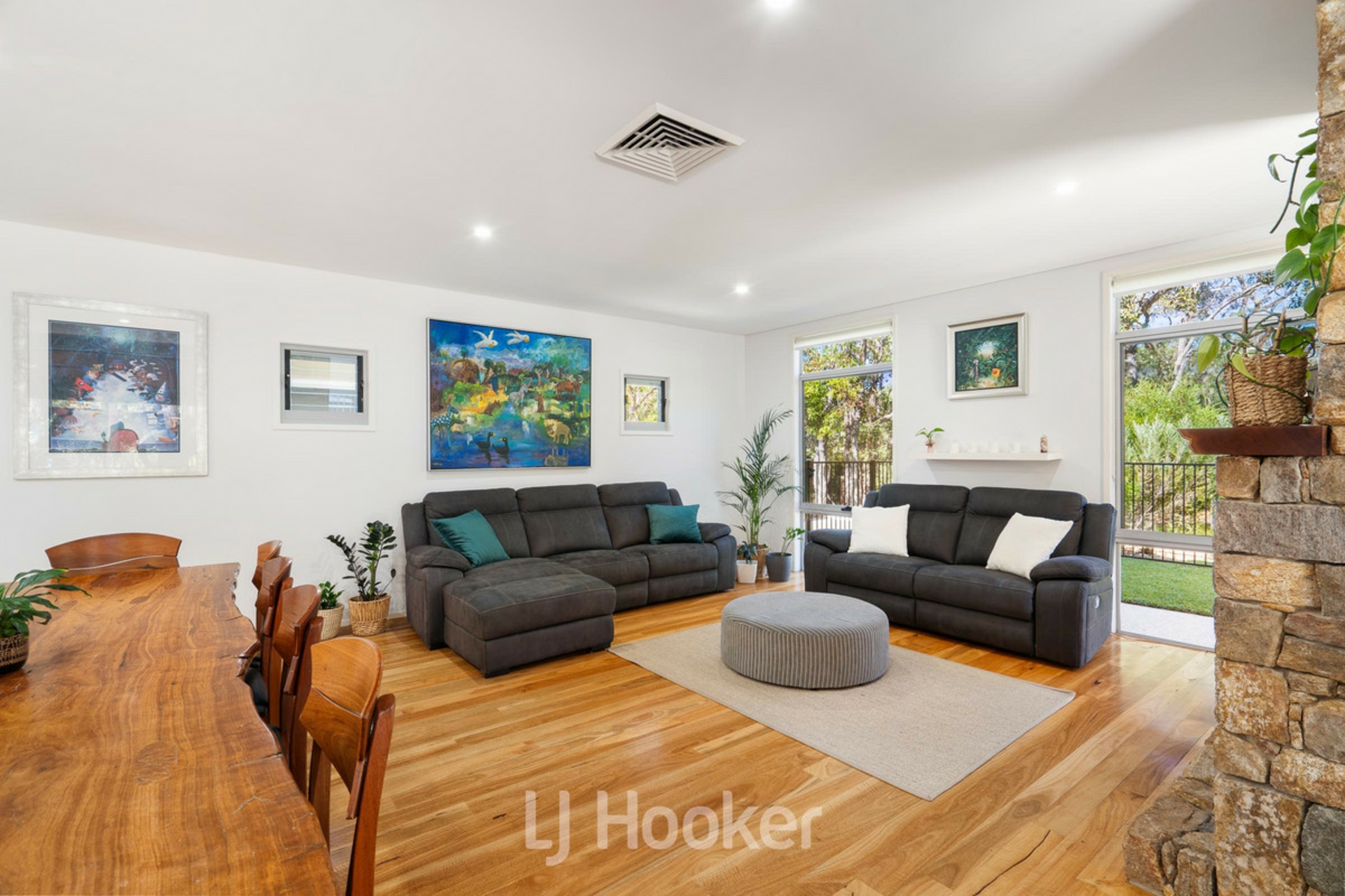 The expansive open-plan living area overlooks the stunning below ground pool and lush native outlook, complemented by thoughtfully positioned garden lighting, resulting in a spectacular evening ambience.