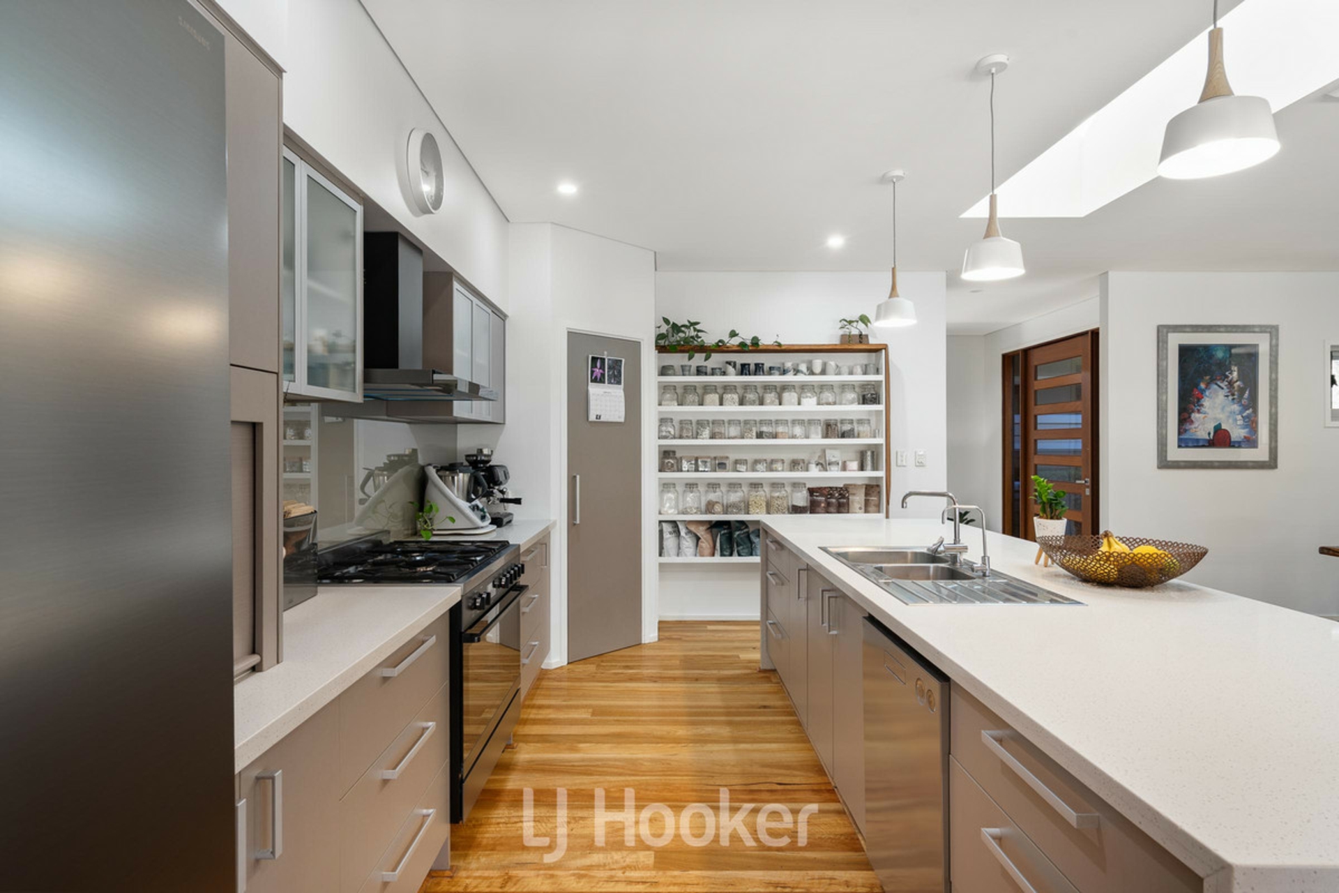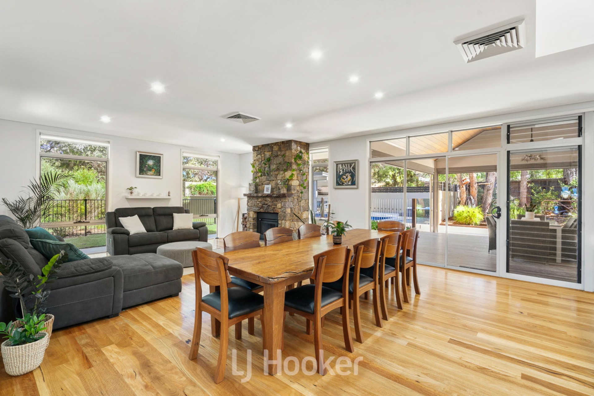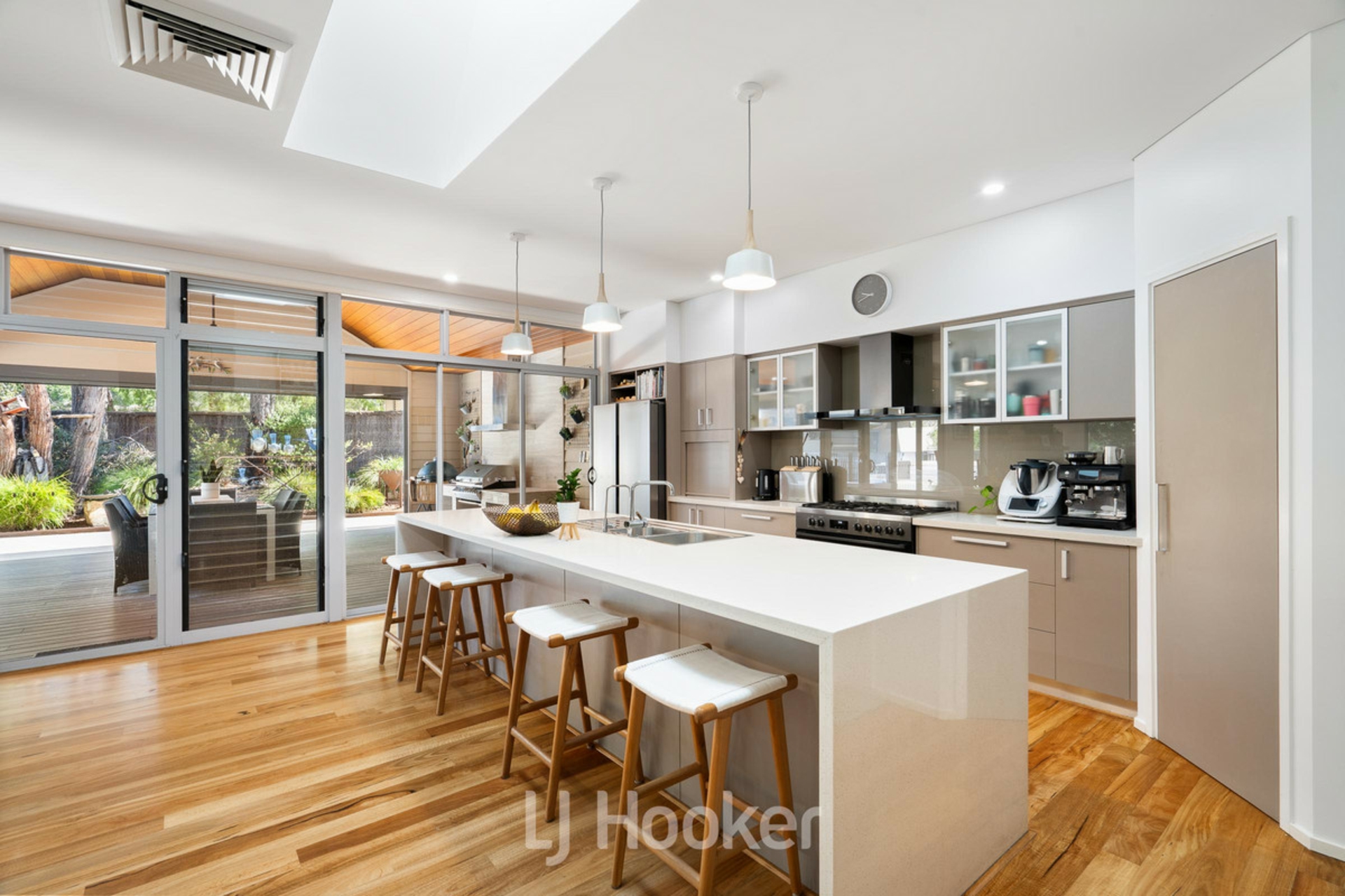 As you enter this impressive 5-bedroom, 3-bathroom residence, you are immediately welcomed by an earthy, tranquil feel, highlighted by a striking feature water pond, travertine tiling, Marri timber flooring, Caesar stone benchtops and a granite feature fireplace, all with light-filled interiors throughout creating a warm and inviting atmosphere.